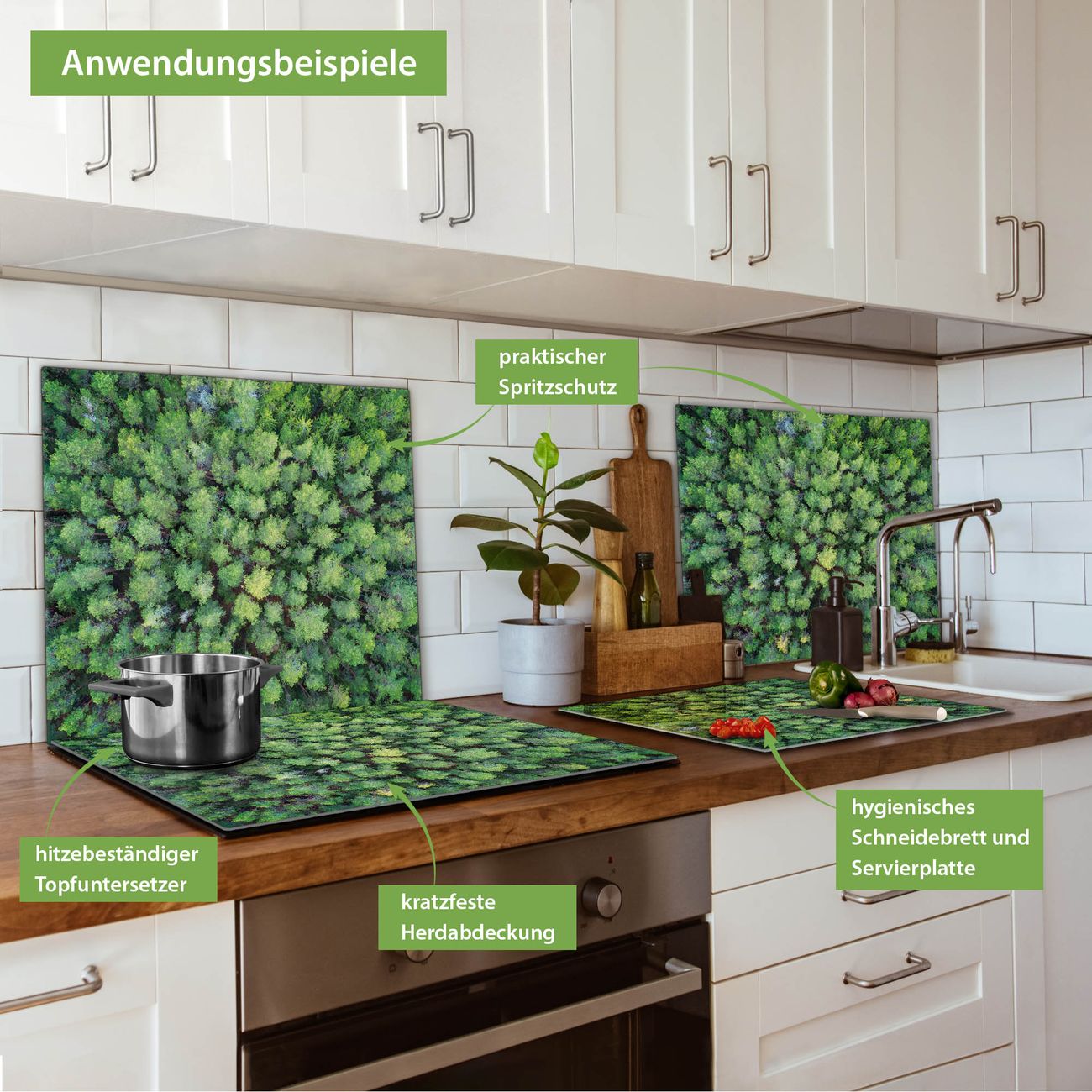 VIELSEITIG: Die Ceranfeldabdeckung ist vielseitig einsetzbar: ob als Spritzschutz hinter dem Herd für Ihre Küche oder als Glas Schneidebrett als hygienische und geruchsneutrale Unterlage. Sie können ebenfalls heiße Töpfe und Pfannen bis 100°C auf der Herdplattenabdeckung abstellen. Sie erhalten ein Multitalent für Ihre Küche. Die banjado Herdabdeckplatte aus Glas mit Motiv Nadelwald verdeckt mit einem schönen Motiv Ihr Ceranfeld bzw. Ihren Induktionsherd. Die Herdabdeckplatte ist vielseitig einsetzbar und passt sich dabei Ihrem Einrichtungsstil an. DESIGN: Die Herdabdeckung Nadelwald besteht aus hochwertigem, gehärtetem Glas mit einem unserer zahlreichen Motive. Sie haben die Wahl zwischen verschiedenen Maßen von einteiligen, zweiteiligen und einer dreiteiligen Herdabdeckung. Wählen Sie was zu Ihrer Einrichtung passt! DETAILS: Die Herdabdeckplatte ist vielseitig einsetzbar. Die Ecken sind für mehr Sicherheit dezent abgerundet, das Glas ist gehärtet. Sie erhalten separate Gummi Abstandshalter, damit Ihre Abdeckung rutschfest auf dem Herd steht. Diese können Sie frei positionieren, sodass die Herdabdeckung perfekt auf Ihrem Ceranfeld sitzt. BANJADO: Wir sind ein kleines Team aus dem Herzen von Sachsen und fertigen jeden Artikel nach Bestellung eigens für Sie an. Sie erhalten also keine preiswerte Importware, sondern Handarbeit. Auf Wunsch sind auch andere Farben und Größen möglich, kontakierten Sie uns gern.