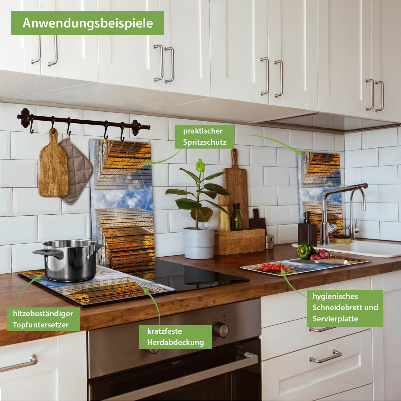 VIELSEITIG: Die Ceranfeldabdeckung ist vielseitig einsetzbar: ob als Spritzschutz hinter dem Herd für Ihre Küche oder als Glas Schneidebrett als hygienische und geruchsneutrale Unterlage. Sie können ebenfalls heiße Töpfe und Pfannen bis 100°C auf der Herdplattenabdeckung abstellen. Sie erhalten ein Multitalent für Ihre Küche. Die banjado Herdabdeckplatte aus Glas mit Motiv Wolkenkratzer 2 verdeckt mit einem schönen Motiv Ihr Ceranfeld bzw. Ihren Induktionsherd. Die Herdabdeckplatte ist vielseitig einsetzbar und passt sich dabei Ihrem Einrichtungsstil an. DESIGN: Die Herdabdeckung Wolkenkratzer 2 besteht aus hochwertigem, gehärtetem Glas mit einem unserer zahlreichen Motive. Sie haben die Wahl zwischen verschiedenen Maßen von einteiligen, zweiteiligen und einer dreiteiligen Herdabdeckung. Wählen Sie was zu Ihrer Einrichtung passt! DETAILS: Die Herdabdeckplatte ist vielseitig einsetzbar. Die Ecken sind für mehr Sicherheit dezent abgerundet, das Glas ist gehärtet. Sie erhalten separate Gummi Abstandshalter, damit Ihre Abdeckung rutschfest auf dem Herd steht. Diese können Sie frei positionieren, sodass die Herdabdeckung perfekt auf Ihrem Ceranfeld sitzt. BANJADO: Wir sind ein kleines Team aus dem Herzen von Sachsen und fertigen jeden Artikel nach Bestellung eigens für Sie an. Sie erhalten also keine preiswerte Importware, sondern Handarbeit. Auf Wunsch sind auch andere Farben und Größen möglich, kontakierten Sie uns gern.