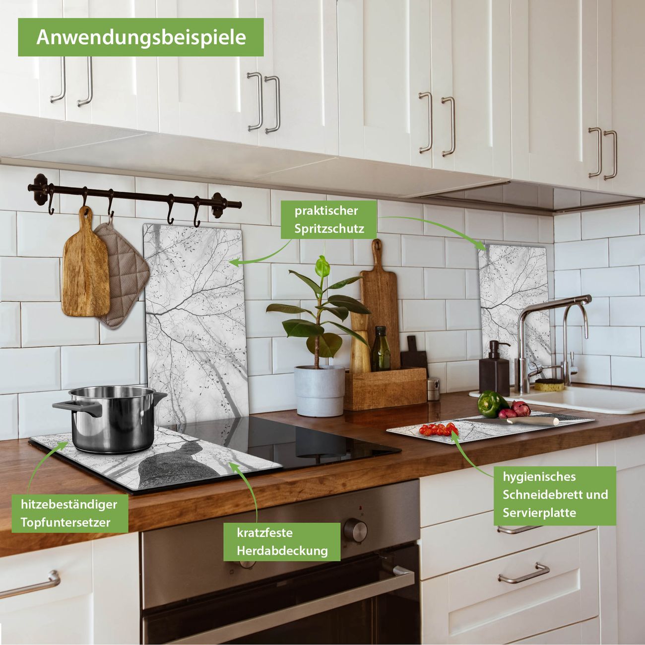 VIELSEITIG: Die Ceranfeldabdeckung ist vielseitig einsetzbar: ob als Spritzschutz hinter dem Herd für Ihre Küche oder als Glas Schneidebrett als hygienische und geruchsneutrale Unterlage. Sie können ebenfalls heiße Töpfe und Pfannen bis 100°C auf der Herdplattenabdeckung abstellen. Sie erhalten ein Multitalent für Ihre Küche. Die banjado Herdabdeckplatte aus Glas mit Motiv Zwischen Bäumen 6 verdeckt mit einem schönen Motiv Ihr Ceranfeld bzw. Ihren Induktionsherd. Die Herdabdeckplatte ist vielseitig einsetzbar und passt sich dabei Ihrem Einrichtungsstil an. DESIGN: Die Herdabdeckung Zwischen Bäumen 6 besteht aus hochwertigem, gehärtetem Glas mit einem unserer zahlreichen Motive. Sie haben die Wahl zwischen verschiedenen Maßen von einteiligen, zweiteiligen und einer dreiteiligen Herdabdeckung. Wählen Sie was zu Ihrer Einrichtung passt! DETAILS: Die Herdabdeckplatte ist vielseitig einsetzbar. Die Ecken sind für mehr Sicherheit dezent abgerundet, das Glas ist gehärtet. Sie erhalten separate Gummi Abstandshalter, damit Ihre Abdeckung rutschfest auf dem Herd steht. Diese können Sie frei positionieren, sodass die Herdabdeckung perfekt auf Ihrem Ceranfeld sitzt. BANJADO: Wir sind ein kleines Team aus dem Herzen von Sachsen und fertigen jeden Artikel nach Bestellung eigens für Sie an. Sie erhalten also keine preiswerte Importware, sondern Handarbeit. Auf Wunsch sind auch andere Farben und Größen möglich, kontakierten Sie uns gern.