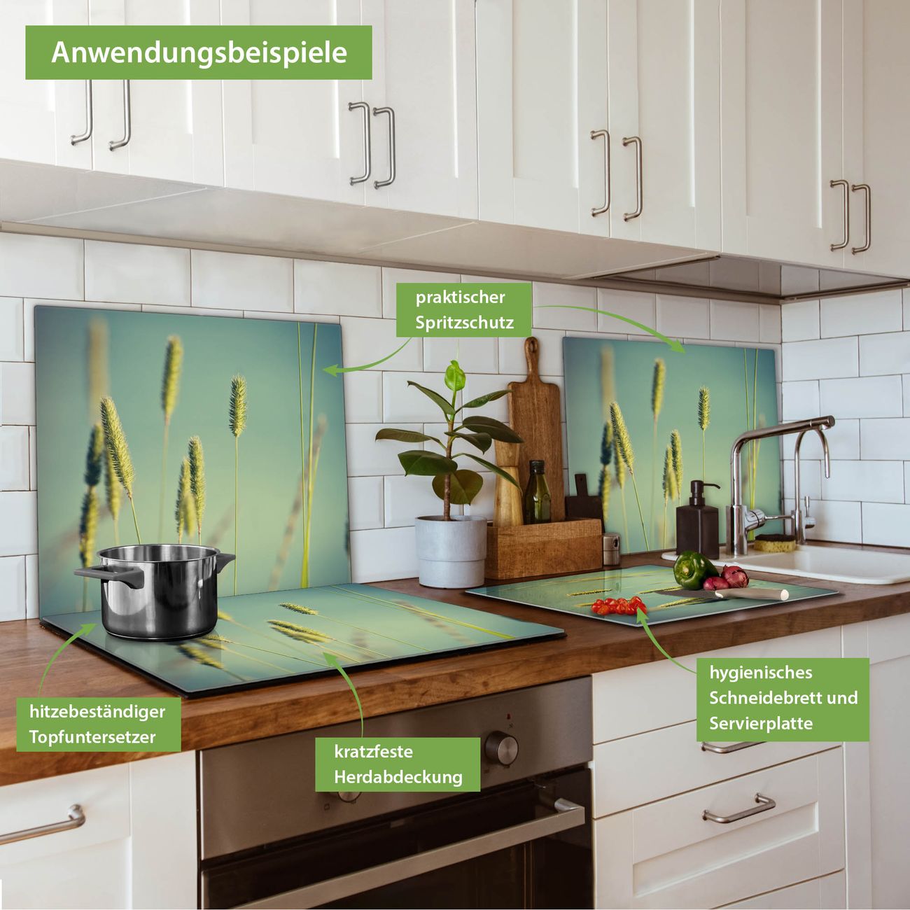 VIELSEITIG: Die Ceranfeldabdeckung ist vielseitig einsetzbar: ob als Spritzschutz hinter dem Herd für Ihre Küche oder als Glas Schneidebrett als hygienische und geruchsneutrale Unterlage. Sie können ebenfalls heiße Töpfe und Pfannen bis 100°C auf der Herdplattenabdeckung abstellen. Sie erhalten ein Multitalent für Ihre Küche. Die banjado Herdabdeckplatte aus Glas mit Motiv Ähren verdeckt mit einem schönen Motiv Ihr Ceranfeld bzw. Ihren Induktionsherd. Die Herdabdeckplatte ist vielseitig einsetzbar und passt sich dabei Ihrem Einrichtungsstil an. DESIGN: Die Herdabdeckung Ähren besteht aus hochwertigem, gehärtetem Glas mit einem unserer zahlreichen Motive. Sie haben die Wahl zwischen verschiedenen Maßen von einteiligen, zweiteiligen und einer dreiteiligen Herdabdeckung. Wählen Sie was zu Ihrer Einrichtung passt! DETAILS: Die Herdabdeckplatte ist vielseitig einsetzbar. Die Ecken sind für mehr Sicherheit dezent abgerundet, das Glas ist gehärtet. Sie erhalten separate Gummi Abstandshalter, damit Ihre Abdeckung rutschfest auf dem Herd steht. Diese können Sie frei positionieren, sodass die Herdabdeckung perfekt auf Ihrem Ceranfeld sitzt. BANJADO: Wir sind ein kleines Team aus dem Herzen von Sachsen und fertigen jeden Artikel nach Bestellung eigens für Sie an. Sie erhalten also keine preiswerte Importware, sondern Handarbeit. Auf Wunsch sind auch andere Farben und Größen möglich, kontakierten Sie uns gern.