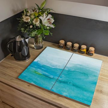 VIELSEITIG: Die Ceranfeldabdeckung ist vielseitig einsetzbar: ob als Spritzschutz hinter dem Herd für Ihre Küche oder als Glas Schneidebrett als hygienische und geruchsneutrale Unterlage. Sie können ebenfalls heiße Töpfe und Pfannen bis 100°C auf der Herdplattenabdeckung abstellen. Sie erhalten ein Multitalent für Ihre Küche. Die banjado Herdabdeckplatte aus Glas mit Motiv Aquarell Blau verdeckt mit einem schönen Motiv Ihr Ceranfeld bzw. Ihren Induktionsherd. Die Herdabdeckplatte ist vielseitig einsetzbar und passt sich dabei Ihrem Einrichtungsstil an. DESIGN: Die Herdabdeckung Aquarell Blau besteht aus hochwertigem, gehärtetem Glas mit einem unserer zahlreichen Motive. Sie haben die Wahl zwischen verschiedenen Maßen von einteiligen, zweiteiligen und einer dreiteiligen Herdabdeckung. Wählen Sie was zu Ihrer Einrichtung passt! DETAILS: Die Herdabdeckplatte ist vielseitig einsetzbar. Die Ecken sind für mehr Sicherheit dezent abgerundet, das Glas ist gehärtet. Sie erhalten separate Gummi Abstandshalter, damit Ihre Abdeckung rutschfest auf dem Herd steht. Diese können Sie frei positionieren, sodass die Herdabdeckung perfekt auf Ihrem Ceranfeld sitzt. BANJADO: Wir sind ein kleines Team aus dem Herzen von Sachsen und fertigen jeden Artikel nach Bestellung eigens für Sie an. Sie erhalten also keine preiswerte Importware, sondern Handarbeit. Auf Wunsch sind auch andere Farben und Größen möglich, kontakierten Sie uns gern.