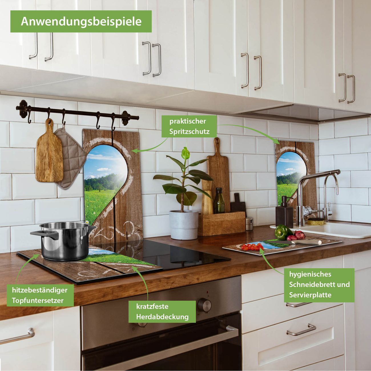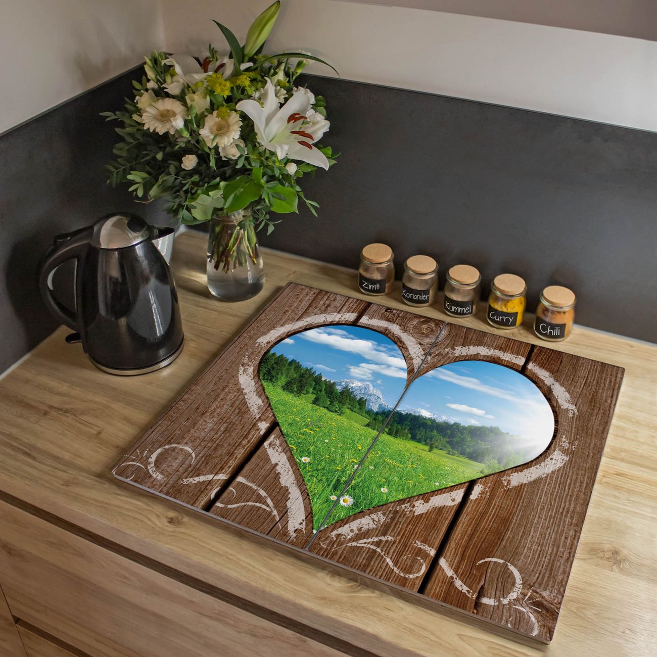 VIELSEITIG: Die Ceranfeldabdeckung ist vielseitig einsetzbar: ob als Spritzschutz hinter dem Herd für Ihre Küche oder als Glas Schneidebrett als hygienische und geruchsneutrale Unterlage. Sie können ebenfalls heiße Töpfe und Pfannen bis 100°C auf der Herdplattenabdeckung abstellen. Sie erhalten ein Multitalent für Ihre Küche. Die banjado Herdabdeckplatte aus Glas mit Motiv Ausblick mit Herz verdeckt mit einem schönen Motiv Ihr Ceranfeld bzw. Ihren Induktionsherd. Die Herdabdeckplatte ist vielseitig einsetzbar und passt sich dabei Ihrem Einrichtungsstil an. DESIGN: Die Herdabdeckung Ausblick mit Herz besteht aus hochwertigem, gehärtetem Glas mit einem unserer zahlreichen Motive. Sie haben die Wahl zwischen verschiedenen Maßen von einteiligen, zweiteiligen und einer dreiteiligen Herdabdeckung. Wählen Sie was zu Ihrer Einrichtung passt! DETAILS: Die Herdabdeckplatte ist vielseitig einsetzbar. Die Ecken sind für mehr Sicherheit dezent abgerundet, das Glas ist gehärtet. Sie erhalten separate Gummi Abstandshalter, damit Ihre Abdeckung rutschfest auf dem Herd steht. Diese können Sie frei positionieren, sodass die Herdabdeckung perfekt auf Ihrem Ceranfeld sitzt. BANJADO: Wir sind ein kleines Team aus dem Herzen von Sachsen und fertigen jeden Artikel nach Bestellung eigens für Sie an. Sie erhalten also keine preiswerte Importware, sondern Handarbeit. Auf Wunsch sind auch andere Farben und Größen möglich, kontakierten Sie uns gern.