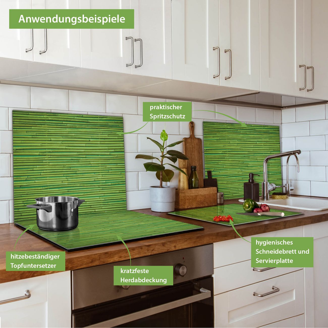 VIELSEITIG: Die Ceranfeldabdeckung ist vielseitig einsetzbar: ob als Spritzschutz hinter dem Herd für Ihre Küche oder als Glas Schneidebrett als hygienische und geruchsneutrale Unterlage. Sie können ebenfalls heiße Töpfe und Pfannen bis 100°C auf der Herdplattenabdeckung abstellen. Sie erhalten ein Multitalent für Ihre Küche. Die banjado Herdabdeckplatte aus Glas mit Motiv Bambus Grün verdeckt mit einem schönen Motiv Ihr Ceranfeld bzw. Ihren Induktionsherd. Die Herdabdeckplatte ist vielseitig einsetzbar und passt sich dabei Ihrem Einrichtungsstil an. DESIGN: Die Herdabdeckung Bambus Grün besteht aus hochwertigem, gehärtetem Glas mit einem unserer zahlreichen Motive. Sie haben die Wahl zwischen verschiedenen Maßen von einteiligen, zweiteiligen und einer dreiteiligen Herdabdeckung. Wählen Sie was zu Ihrer Einrichtung passt! DETAILS: Die Herdabdeckplatte ist vielseitig einsetzbar. Die Ecken sind für mehr Sicherheit dezent abgerundet, das Glas ist gehärtet. Sie erhalten separate Gummi Abstandshalter, damit Ihre Abdeckung rutschfest auf dem Herd steht. Diese können Sie frei positionieren, sodass die Herdabdeckung perfekt auf Ihrem Ceranfeld sitzt. BANJADO: Wir sind ein kleines Team aus dem Herzen von Sachsen und fertigen jeden Artikel nach Bestellung eigens für Sie an. Sie erhalten also keine preiswerte Importware, sondern Handarbeit. Auf Wunsch sind auch andere Farben und Größen möglich, kontakierten Sie uns gern.