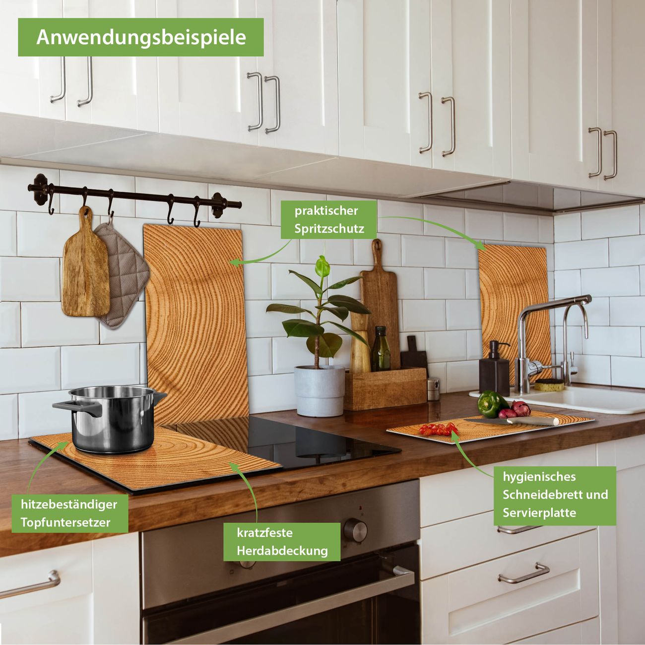 VIELSEITIG: Die Ceranfeldabdeckung ist vielseitig einsetzbar: ob als Spritzschutz hinter dem Herd für Ihre Küche oder als Glas Schneidebrett als hygienische und geruchsneutrale Unterlage. Sie können ebenfalls heiße Töpfe und Pfannen bis 100°C auf der Herdplattenabdeckung abstellen. Sie erhalten ein Multitalent für Ihre Küche. Die banjado Herdabdeckplatte aus Glas mit Motiv Baumstamm verdeckt mit einem schönen Motiv Ihr Ceranfeld bzw. Ihren Induktionsherd. Die Herdabdeckplatte ist vielseitig einsetzbar und passt sich dabei Ihrem Einrichtungsstil an. DESIGN: Die Herdabdeckung Baumstamm besteht aus hochwertigem, gehärtetem Glas mit einem unserer zahlreichen Motive. Sie haben die Wahl zwischen verschiedenen Maßen von einteiligen, zweiteiligen und einer dreiteiligen Herdabdeckung. Wählen Sie was zu Ihrer Einrichtung passt! DETAILS: Die Herdabdeckplatte ist vielseitig einsetzbar. Die Ecken sind für mehr Sicherheit dezent abgerundet, das Glas ist gehärtet. Sie erhalten separate Gummi Abstandshalter, damit Ihre Abdeckung rutschfest auf dem Herd steht. Diese können Sie frei positionieren, sodass die Herdabdeckung perfekt auf Ihrem Ceranfeld sitzt. BANJADO: Wir sind ein kleines Team aus dem Herzen von Sachsen und fertigen jeden Artikel nach Bestellung eigens für Sie an. Sie erhalten also keine preiswerte Importware, sondern Handarbeit. Auf Wunsch sind auch andere Farben und Größen möglich, kontakierten Sie uns gern.