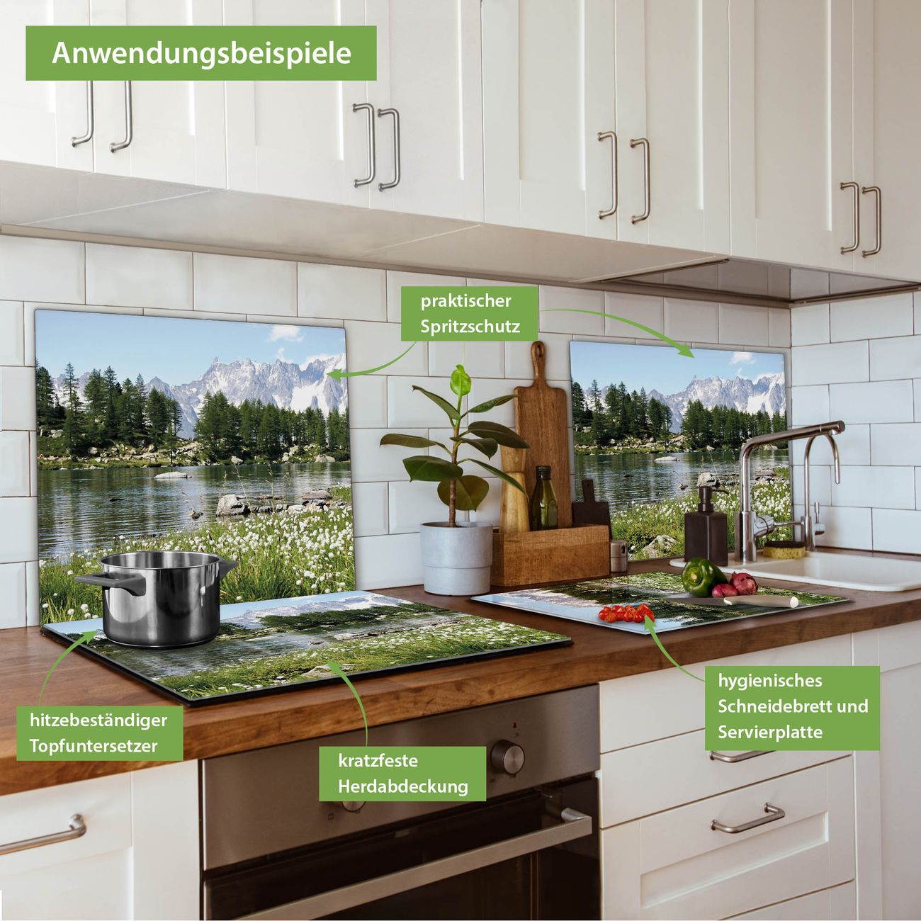VIELSEITIG: Die Ceranfeldabdeckung ist vielseitig einsetzbar: ob als Spritzschutz hinter dem Herd für Ihre Küche oder als Glas Schneidebrett als hygienische und geruchsneutrale Unterlage. Sie können ebenfalls heiße Töpfe und Pfannen bis 100°C auf der Herdplattenabdeckung abstellen. Sie erhalten ein Multitalent für Ihre Küche. Die banjado Herdabdeckplatte aus Glas mit Motiv Bergidylle verdeckt mit einem schönen Motiv Ihr Ceranfeld bzw. Ihren Induktionsherd. Die Herdabdeckplatte ist vielseitig einsetzbar und passt sich dabei Ihrem Einrichtungsstil an. DESIGN: Die Herdabdeckung Bergidylle besteht aus hochwertigem, gehärtetem Glas mit einem unserer zahlreichen Motive. Sie haben die Wahl zwischen verschiedenen Maßen von einteiligen, zweiteiligen und einer dreiteiligen Herdabdeckung. Wählen Sie was zu Ihrer Einrichtung passt! DETAILS: Die Herdabdeckplatte ist vielseitig einsetzbar. Die Ecken sind für mehr Sicherheit dezent abgerundet, das Glas ist gehärtet. Sie erhalten separate Gummi Abstandshalter, damit Ihre Abdeckung rutschfest auf dem Herd steht. Diese können Sie frei positionieren, sodass die Herdabdeckung perfekt auf Ihrem Ceranfeld sitzt. BANJADO: Wir sind ein kleines Team aus dem Herzen von Sachsen und fertigen jeden Artikel nach Bestellung eigens für Sie an. Sie erhalten also keine preiswerte Importware, sondern Handarbeit. Auf Wunsch sind auch andere Farben und Größen möglich, kontakierten Sie uns gern.