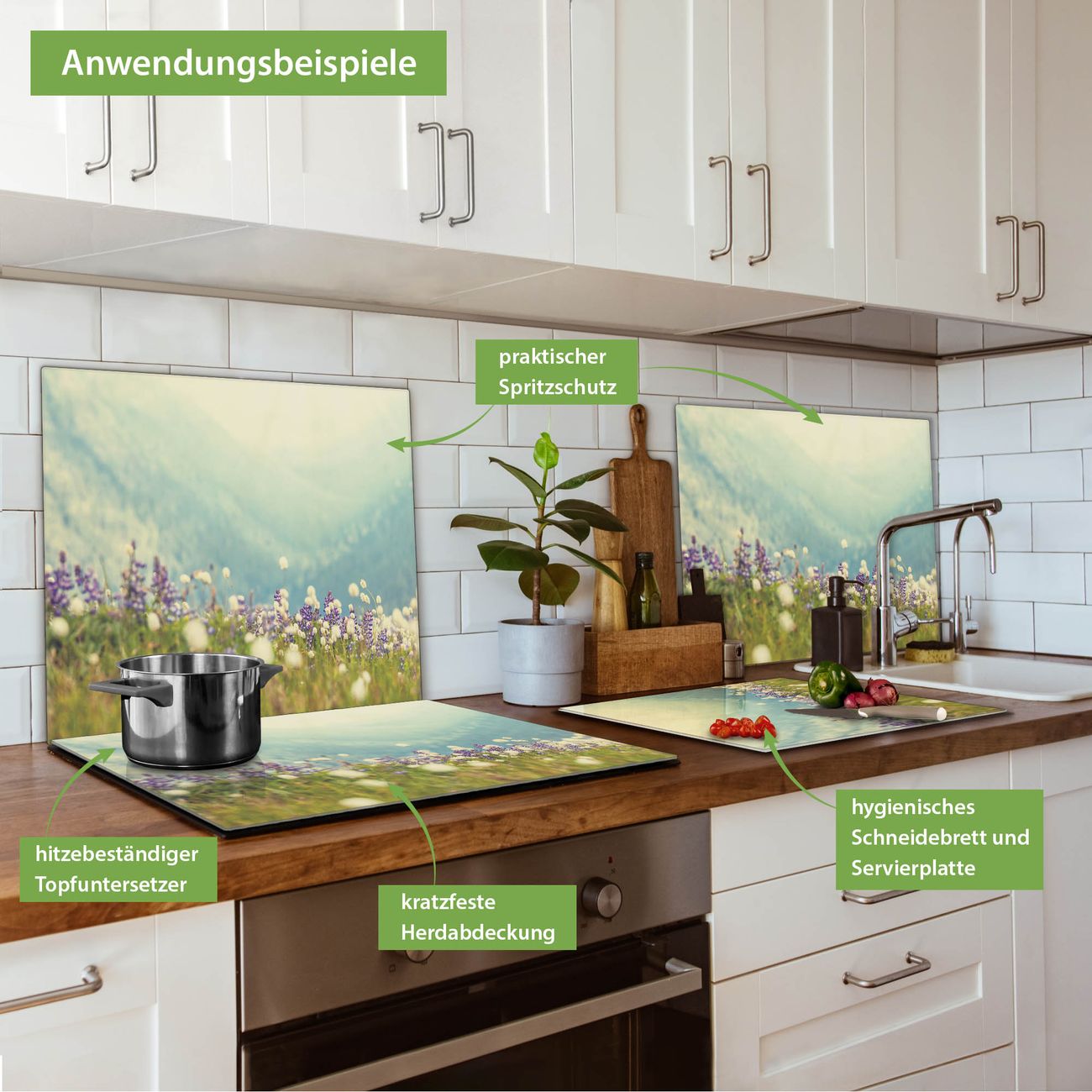 VIELSEITIG: Die Ceranfeldabdeckung ist vielseitig einsetzbar: ob als Spritzschutz hinter dem Herd für Ihre Küche oder als Glas Schneidebrett als hygienische und geruchsneutrale Unterlage. Sie können ebenfalls heiße Töpfe und Pfannen bis 100°C auf der Herdplattenabdeckung abstellen. Sie erhalten ein Multitalent für Ihre Küche. Die banjado Herdabdeckplatte aus Glas mit Motiv Bergwiese verdeckt mit einem schönen Motiv Ihr Ceranfeld bzw. Ihren Induktionsherd. Die Herdabdeckplatte ist vielseitig einsetzbar und passt sich dabei Ihrem Einrichtungsstil an. DESIGN: Die Herdabdeckung Bergwiese besteht aus hochwertigem, gehärtetem Glas mit einem unserer zahlreichen Motive. Sie haben die Wahl zwischen verschiedenen Maßen von einteiligen, zweiteiligen und einer dreiteiligen Herdabdeckung. Wählen Sie was zu Ihrer Einrichtung passt! DETAILS: Die Herdabdeckplatte ist vielseitig einsetzbar. Die Ecken sind für mehr Sicherheit dezent abgerundet, das Glas ist gehärtet. Sie erhalten separate Gummi Abstandshalter, damit Ihre Abdeckung rutschfest auf dem Herd steht. Diese können Sie frei positionieren, sodass die Herdabdeckung perfekt auf Ihrem Ceranfeld sitzt. BANJADO: Wir sind ein kleines Team aus dem Herzen von Sachsen und fertigen jeden Artikel nach Bestellung eigens für Sie an. Sie erhalten also keine preiswerte Importware, sondern Handarbeit. Auf Wunsch sind auch andere Farben und Größen möglich, kontakierten Sie uns gern.