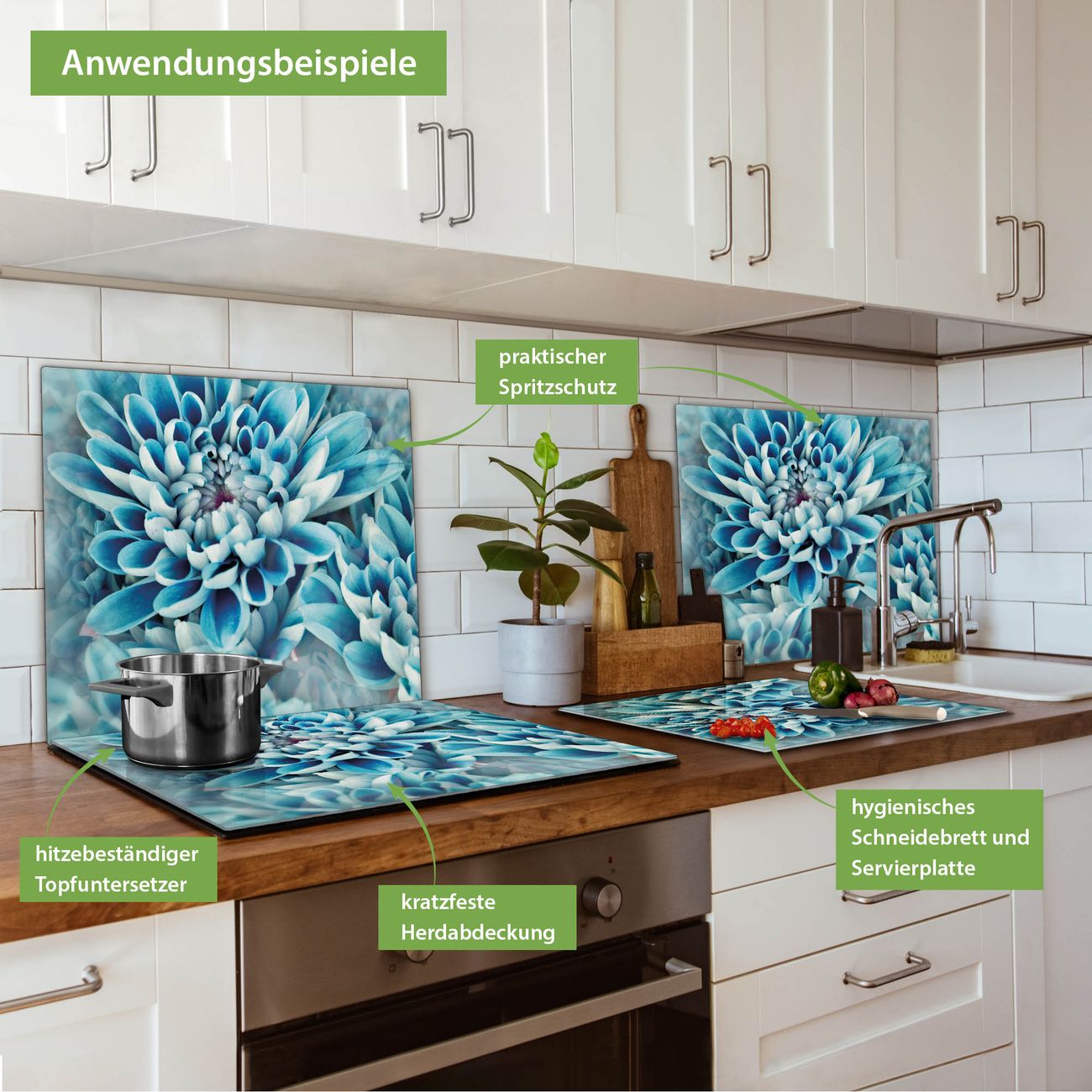 VIELSEITIG: Die Ceranfeldabdeckung ist vielseitig einsetzbar: ob als Spritzschutz hinter dem Herd für Ihre Küche oder als Glas Schneidebrett als hygienische und geruchsneutrale Unterlage. Sie können ebenfalls heiße Töpfe und Pfannen bis 100°C auf der Herdplattenabdeckung abstellen. Sie erhalten ein Multitalent für Ihre Küche. Die banjado Herdabdeckplatte aus Glas mit Motiv Blaue Blüten verdeckt mit einem schönen Motiv Ihr Ceranfeld bzw. Ihren Induktionsherd. Die Herdabdeckplatte ist vielseitig einsetzbar und passt sich dabei Ihrem Einrichtungsstil an. DESIGN: Die Herdabdeckung Blaue Blüten besteht aus hochwertigem, gehärtetem Glas mit einem unserer zahlreichen Motive. Sie haben die Wahl zwischen verschiedenen Maßen von einteiligen, zweiteiligen und einer dreiteiligen Herdabdeckung. Wählen Sie was zu Ihrer Einrichtung passt! DETAILS: Die Herdabdeckplatte ist vielseitig einsetzbar. Die Ecken sind für mehr Sicherheit dezent abgerundet, das Glas ist gehärtet. Sie erhalten separate Gummi Abstandshalter, damit Ihre Abdeckung rutschfest auf dem Herd steht. Diese können Sie frei positionieren, sodass die Herdabdeckung perfekt auf Ihrem Ceranfeld sitzt. BANJADO: Wir sind ein kleines Team aus dem Herzen von Sachsen und fertigen jeden Artikel nach Bestellung eigens für Sie an. Sie erhalten also keine preiswerte Importware, sondern Handarbeit. Auf Wunsch sind auch andere Farben und Größen möglich, kontakierten Sie uns gern.