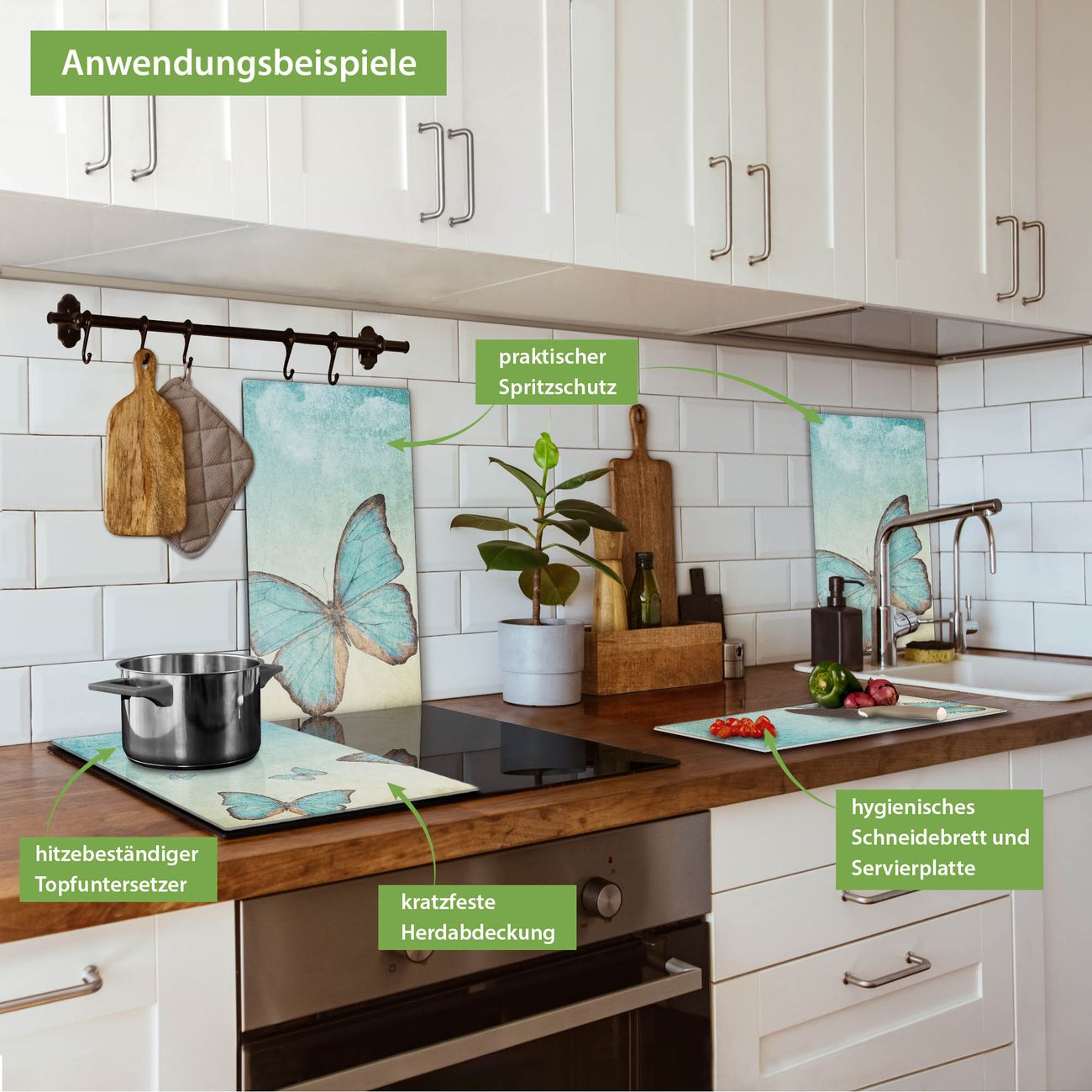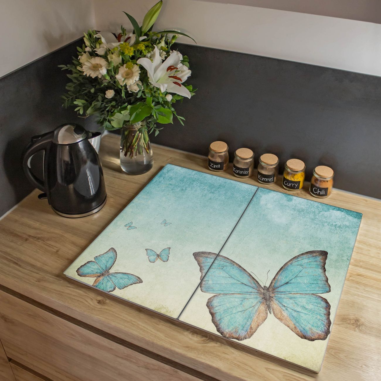 VIELSEITIG: Die Ceranfeldabdeckung ist vielseitig einsetzbar: ob als Spritzschutz hinter dem Herd für Ihre Küche oder als Glas Schneidebrett als hygienische und geruchsneutrale Unterlage. Sie können ebenfalls heiße Töpfe und Pfannen bis 100°C auf der Herdplattenabdeckung abstellen. Sie erhalten ein Multitalent für Ihre Küche. Die banjado Herdabdeckplatte aus Glas mit Motiv Blaue Schmetterlinge verdeckt mit einem schönen Motiv Ihr Ceranfeld bzw. Ihren Induktionsherd. Die Herdabdeckplatte ist vielseitig einsetzbar und passt sich dabei Ihrem Einrichtungsstil an. DESIGN: Die Herdabdeckung Blaue Schmetterlinge besteht aus hochwertigem, gehärtetem Glas mit einem unserer zahlreichen Motive. Sie haben die Wahl zwischen verschiedenen Maßen von einteiligen, zweiteiligen und einer dreiteiligen Herdabdeckung. Wählen Sie was zu Ihrer Einrichtung passt! DETAILS: Die Herdabdeckplatte ist vielseitig einsetzbar. Die Ecken sind für mehr Sicherheit dezent abgerundet, das Glas ist gehärtet. Sie erhalten separate Gummi Abstandshalter, damit Ihre Abdeckung rutschfest auf dem Herd steht. Diese können Sie frei positionieren, sodass die Herdabdeckung perfekt auf Ihrem Ceranfeld sitzt. BANJADO: Wir sind ein kleines Team aus dem Herzen von Sachsen und fertigen jeden Artikel nach Bestellung eigens für Sie an. Sie erhalten also keine preiswerte Importware, sondern Handarbeit. Auf Wunsch sind auch andere Farben und Größen möglich, kontakierten Sie uns gern.