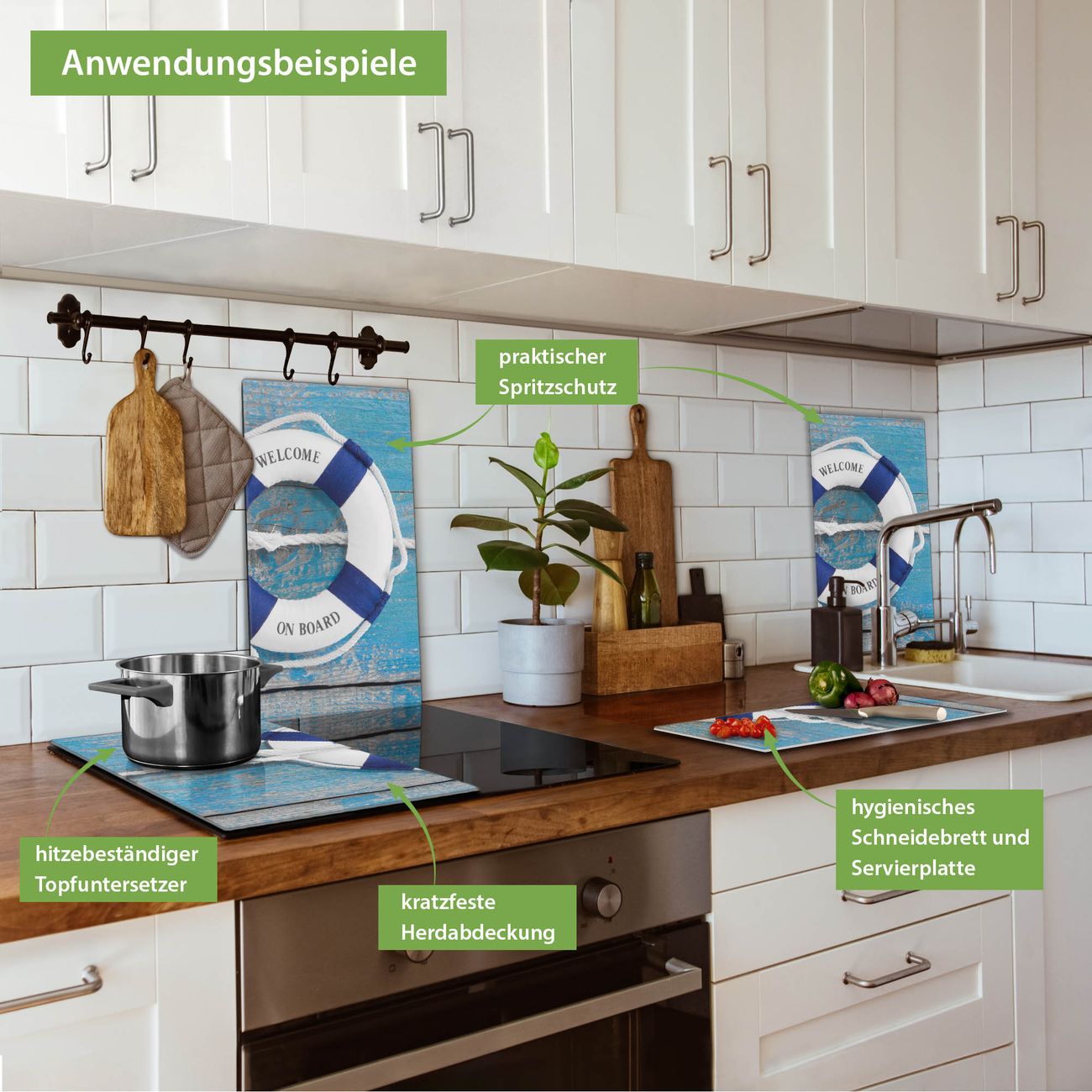 VIELSEITIG: Die Ceranfeldabdeckung ist vielseitig einsetzbar: ob als Spritzschutz hinter dem Herd für Ihre Küche oder als Glas Schneidebrett als hygienische und geruchsneutrale Unterlage. Sie können ebenfalls heiße Töpfe und Pfannen bis 100°C auf der Herdplattenabdeckung abstellen. Sie erhalten ein Multitalent für Ihre Küche. Die banjado Herdabdeckplatte aus Glas mit Motiv Blauer Rettungsring verdeckt mit einem schönen Motiv Ihr Ceranfeld bzw. Ihren Induktionsherd. Die Herdabdeckplatte ist vielseitig einsetzbar und passt sich dabei Ihrem Einrichtungsstil an. DESIGN: Die Herdabdeckung Blauer Rettungsring besteht aus hochwertigem, gehärtetem Glas mit einem unserer zahlreichen Motive. Sie haben die Wahl zwischen verschiedenen Maßen von einteiligen, zweiteiligen und einer dreiteiligen Herdabdeckung. Wählen Sie was zu Ihrer Einrichtung passt! DETAILS: Die Herdabdeckplatte ist vielseitig einsetzbar. Die Ecken sind für mehr Sicherheit dezent abgerundet, das Glas ist gehärtet. Sie erhalten separate Gummi Abstandshalter, damit Ihre Abdeckung rutschfest auf dem Herd steht. Diese können Sie frei positionieren, sodass die Herdabdeckung perfekt auf Ihrem Ceranfeld sitzt. BANJADO: Wir sind ein kleines Team aus dem Herzen von Sachsen und fertigen jeden Artikel nach Bestellung eigens für Sie an. Sie erhalten also keine preiswerte Importware, sondern Handarbeit. Auf Wunsch sind auch andere Farben und Größen möglich, kontakierten Sie uns gern.