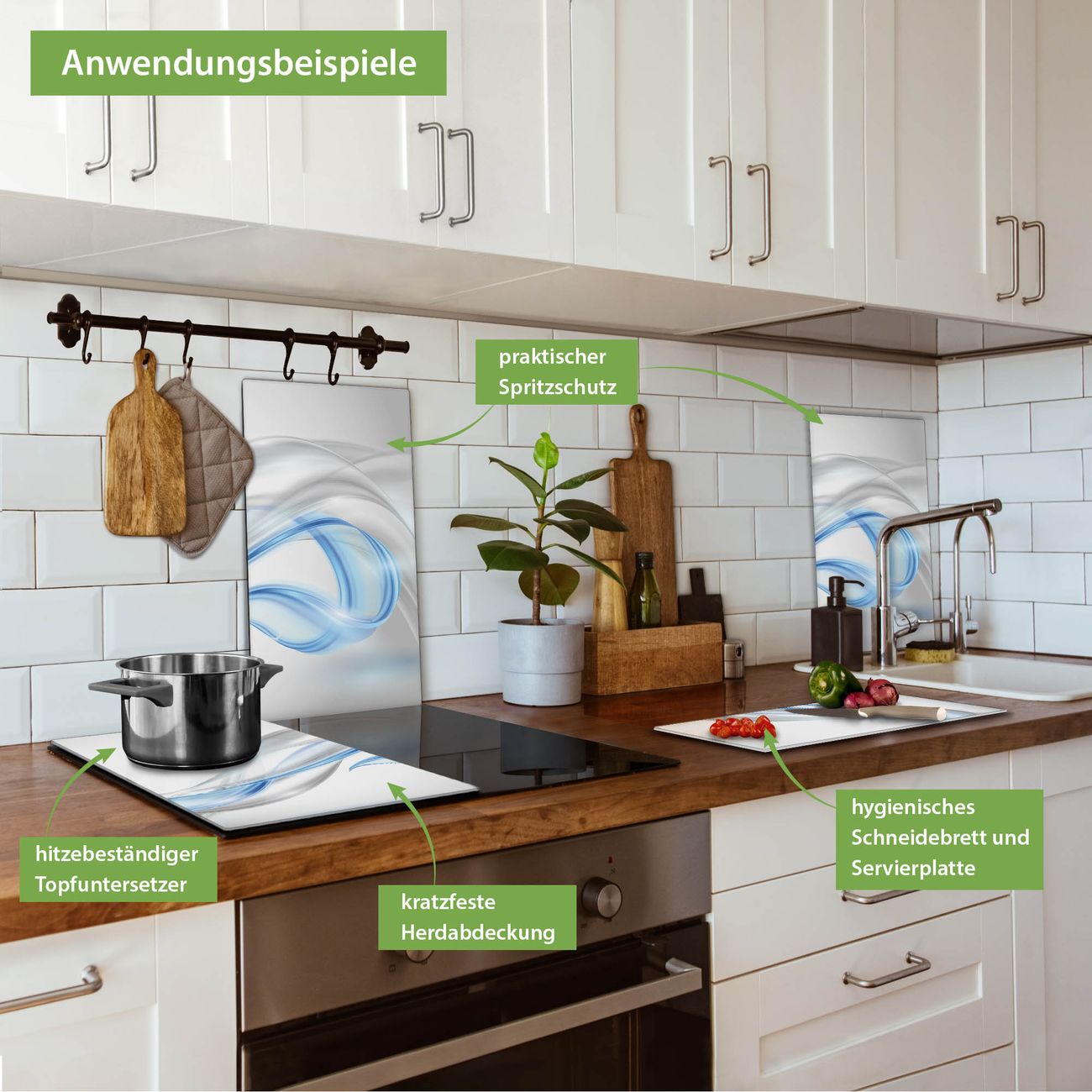 VIELSEITIG: Die Ceranfeldabdeckung ist vielseitig einsetzbar: ob als Spritzschutz hinter dem Herd für Ihre Küche oder als Glas Schneidebrett als hygienische und geruchsneutrale Unterlage. Sie können ebenfalls heiße Töpfe und Pfannen bis 100°C auf der Herdplattenabdeckung abstellen. Sie erhalten ein Multitalent für Ihre Küche. Die banjado Herdabdeckplatte aus Glas mit Motiv Blauer Schleier verdeckt mit einem schönen Motiv Ihr Ceranfeld bzw. Ihren Induktionsherd. Die Herdabdeckplatte ist vielseitig einsetzbar und passt sich dabei Ihrem Einrichtungsstil an. DESIGN: Die Herdabdeckung Blauer Schleier besteht aus hochwertigem, gehärtetem Glas mit einem unserer zahlreichen Motive. Sie haben die Wahl zwischen verschiedenen Maßen von einteiligen, zweiteiligen und einer dreiteiligen Herdabdeckung. Wählen Sie was zu Ihrer Einrichtung passt! DETAILS: Die Herdabdeckplatte ist vielseitig einsetzbar. Die Ecken sind für mehr Sicherheit dezent abgerundet, das Glas ist gehärtet. Sie erhalten separate Gummi Abstandshalter, damit Ihre Abdeckung rutschfest auf dem Herd steht. Diese können Sie frei positionieren, sodass die Herdabdeckung perfekt auf Ihrem Ceranfeld sitzt. BANJADO: Wir sind ein kleines Team aus dem Herzen von Sachsen und fertigen jeden Artikel nach Bestellung eigens für Sie an. Sie erhalten also keine preiswerte Importware, sondern Handarbeit. Auf Wunsch sind auch andere Farben und Größen möglich, kontakierten Sie uns gern.