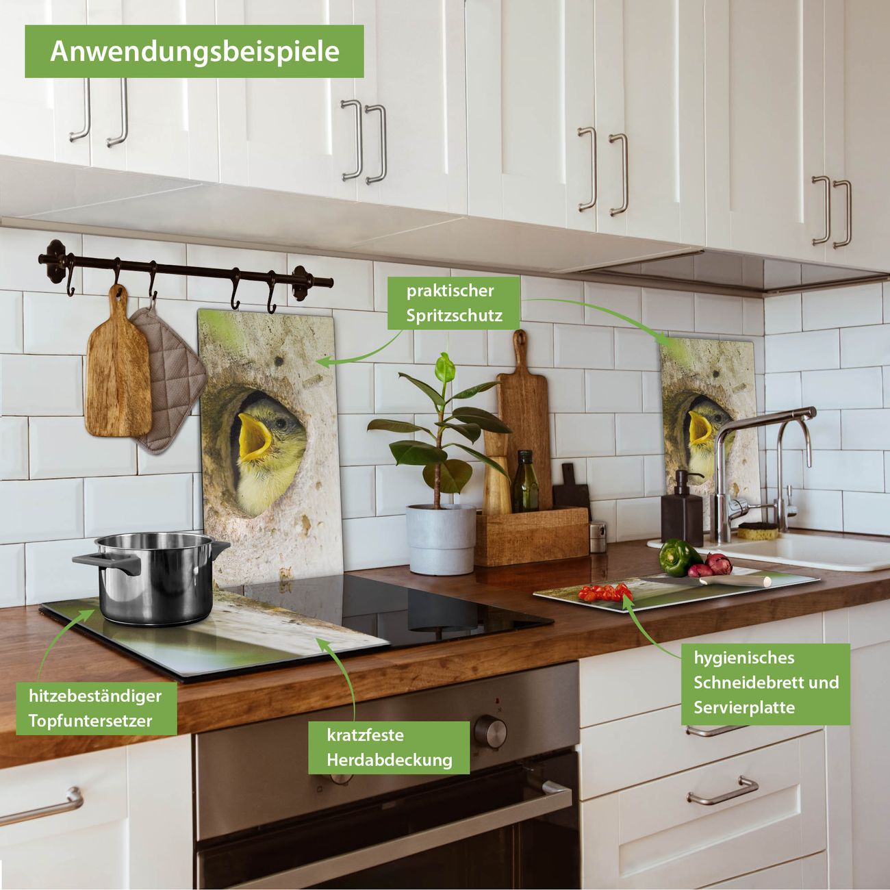 VIELSEITIG: Die Ceranfeldabdeckung ist vielseitig einsetzbar: ob als Spritzschutz hinter dem Herd für Ihre Küche oder als Glas Schneidebrett als hygienische und geruchsneutrale Unterlage. Sie können ebenfalls heiße Töpfe und Pfannen bis 100°C auf der Herdplattenabdeckung abstellen. Sie erhalten ein Multitalent für Ihre Küche. Die banjado Herdabdeckplatte aus Glas mit Motiv Blaumeise verdeckt mit einem schönen Motiv Ihr Ceranfeld bzw. Ihren Induktionsherd. Die Herdabdeckplatte ist vielseitig einsetzbar und passt sich dabei Ihrem Einrichtungsstil an. DESIGN: Die Herdabdeckung Blaumeise besteht aus hochwertigem, gehärtetem Glas mit einem unserer zahlreichen Motive. Sie haben die Wahl zwischen verschiedenen Maßen von einteiligen, zweiteiligen und einer dreiteiligen Herdabdeckung. Wählen Sie was zu Ihrer Einrichtung passt! DETAILS: Die Herdabdeckplatte ist vielseitig einsetzbar. Die Ecken sind für mehr Sicherheit dezent abgerundet, das Glas ist gehärtet. Sie erhalten separate Gummi Abstandshalter, damit Ihre Abdeckung rutschfest auf dem Herd steht. Diese können Sie frei positionieren, sodass die Herdabdeckung perfekt auf Ihrem Ceranfeld sitzt. BANJADO: Wir sind ein kleines Team aus dem Herzen von Sachsen und fertigen jeden Artikel nach Bestellung eigens für Sie an. Sie erhalten also keine preiswerte Importware, sondern Handarbeit. Auf Wunsch sind auch andere Farben und Größen möglich, kontakierten Sie uns gern.