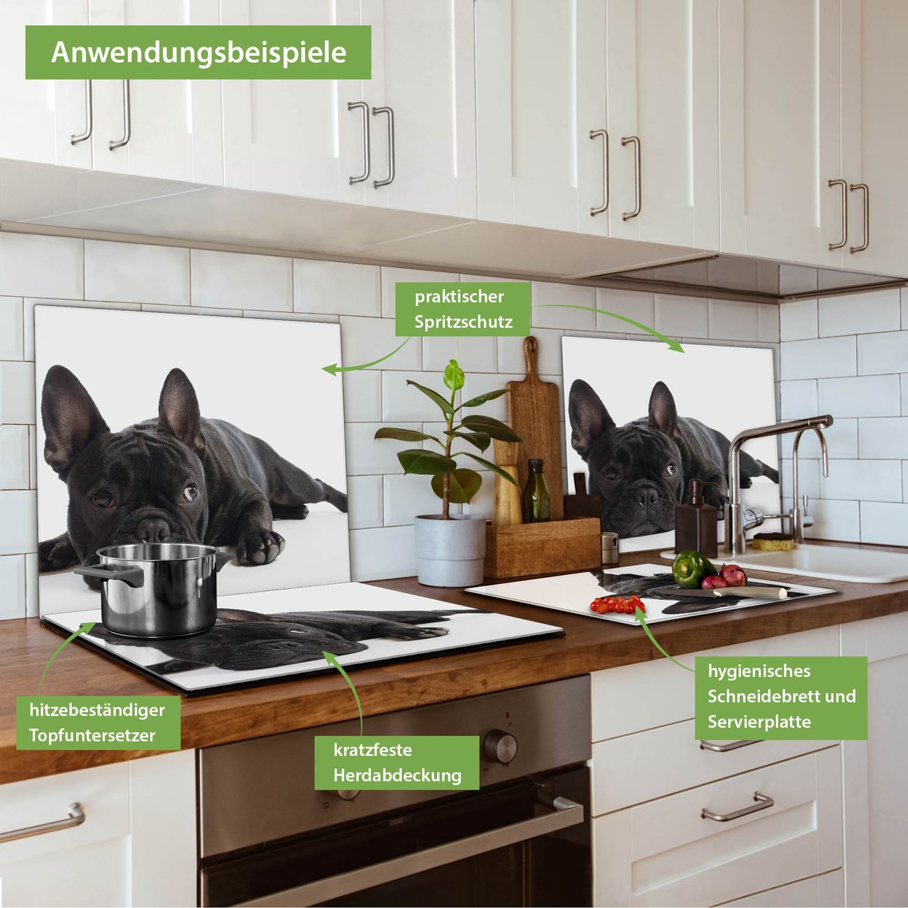 VIELSEITIG: Die Ceranfeldabdeckung ist vielseitig einsetzbar: ob als Spritzschutz hinter dem Herd für Ihre Küche oder als Glas Schneidebrett als hygienische und geruchsneutrale Unterlage. Sie können ebenfalls heiße Töpfe und Pfannen bis 100°C auf der Herdplattenabdeckung abstellen. Sie erhalten ein Multitalent für Ihre Küche. Die banjado Herdabdeckplatte aus Glas mit Motiv Bulldogge verdeckt mit einem schönen Motiv Ihr Ceranfeld bzw. Ihren Induktionsherd. Die Herdabdeckplatte ist vielseitig einsetzbar und passt sich dabei Ihrem Einrichtungsstil an. DESIGN: Die Herdabdeckung Bulldogge besteht aus hochwertigem, gehärtetem Glas mit einem unserer zahlreichen Motive. Sie haben die Wahl zwischen verschiedenen Maßen von einteiligen, zweiteiligen und einer dreiteiligen Herdabdeckung. Wählen Sie was zu Ihrer Einrichtung passt! DETAILS: Die Herdabdeckplatte ist vielseitig einsetzbar. Die Ecken sind für mehr Sicherheit dezent abgerundet, das Glas ist gehärtet. Sie erhalten separate Gummi Abstandshalter, damit Ihre Abdeckung rutschfest auf dem Herd steht. Diese können Sie frei positionieren, sodass die Herdabdeckung perfekt auf Ihrem Ceranfeld sitzt. BANJADO: Wir sind ein kleines Team aus dem Herzen von Sachsen und fertigen jeden Artikel nach Bestellung eigens für Sie an. Sie erhalten also keine preiswerte Importware, sondern Handarbeit. Auf Wunsch sind auch andere Farben und Größen möglich, kontakierten Sie uns gern.
