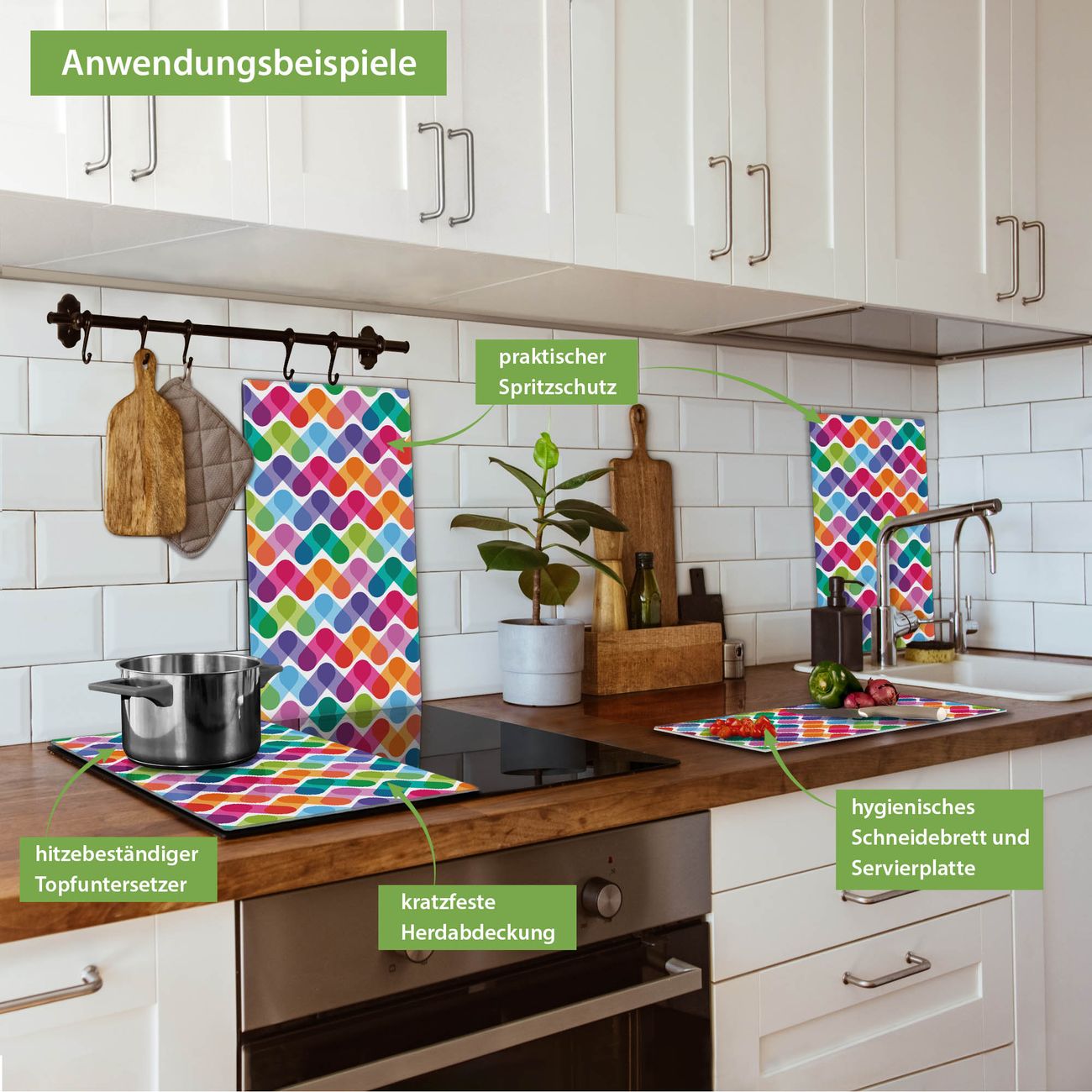 VIELSEITIG: Die Ceranfeldabdeckung ist vielseitig einsetzbar: ob als Spritzschutz hinter dem Herd für Ihre Küche oder als Glas Schneidebrett als hygienische und geruchsneutrale Unterlage. Sie können ebenfalls heiße Töpfe und Pfannen bis 100°C auf der Herdplattenabdeckung abstellen. Sie erhalten ein Multitalent für Ihre Küche. Die banjado Herdabdeckplatte aus Glas mit Motiv Bunte Ketten verdeckt mit einem schönen Motiv Ihr Ceranfeld bzw. Ihren Induktionsherd. Die Herdabdeckplatte ist vielseitig einsetzbar und passt sich dabei Ihrem Einrichtungsstil an. DESIGN: Die Herdabdeckung Bunte Ketten besteht aus hochwertigem, gehärtetem Glas mit einem unserer zahlreichen Motive. Sie haben die Wahl zwischen verschiedenen Maßen von einteiligen, zweiteiligen und einer dreiteiligen Herdabdeckung. Wählen Sie was zu Ihrer Einrichtung passt! DETAILS: Die Herdabdeckplatte ist vielseitig einsetzbar. Die Ecken sind für mehr Sicherheit dezent abgerundet, das Glas ist gehärtet. Sie erhalten separate Gummi Abstandshalter, damit Ihre Abdeckung rutschfest auf dem Herd steht. Diese können Sie frei positionieren, sodass die Herdabdeckung perfekt auf Ihrem Ceranfeld sitzt. BANJADO: Wir sind ein kleines Team aus dem Herzen von Sachsen und fertigen jeden Artikel nach Bestellung eigens für Sie an. Sie erhalten also keine preiswerte Importware, sondern Handarbeit. Auf Wunsch sind auch andere Farben und Größen möglich, kontakierten Sie uns gern.