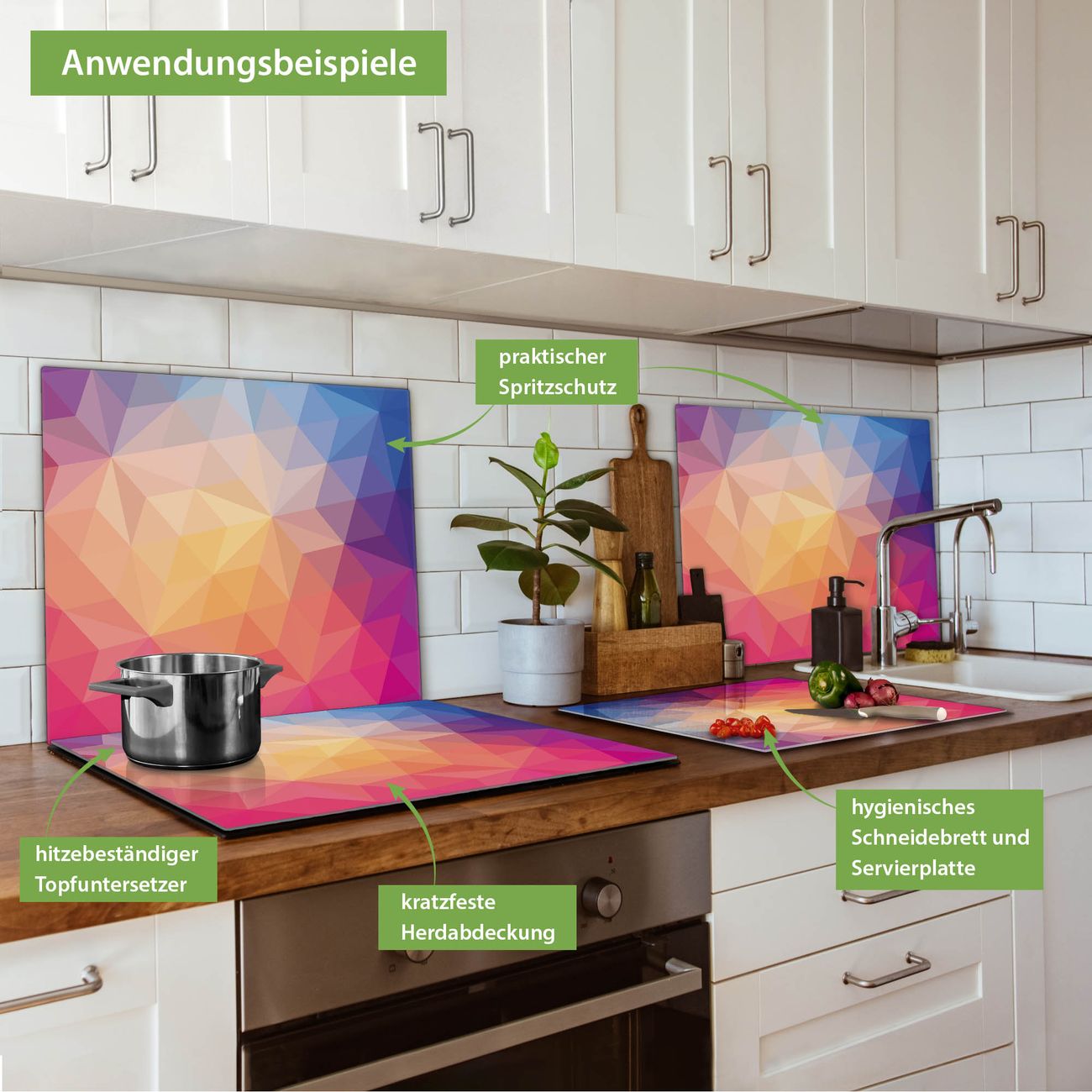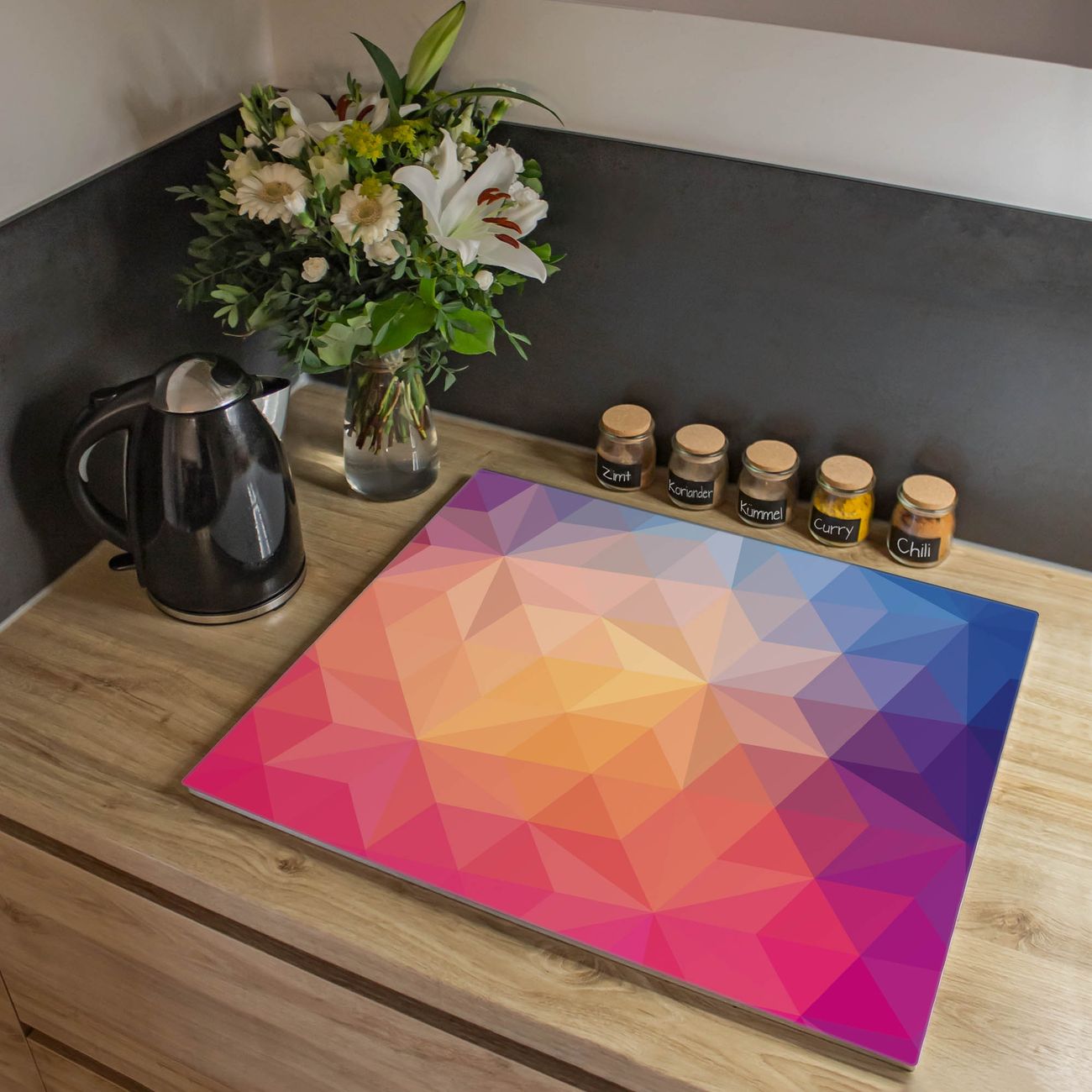VIELSEITIG: Die Ceranfeldabdeckung ist vielseitig einsetzbar: ob als Spritzschutz hinter dem Herd für Ihre Küche oder als Glas Schneidebrett als hygienische und geruchsneutrale Unterlage. Sie können ebenfalls heiße Töpfe und Pfannen bis 100°C auf der Herdplattenabdeckung abstellen. Sie erhalten ein Multitalent für Ihre Küche. Die banjado Herdabdeckplatte aus Glas mit Motiv Bunte Kristalle verdeckt mit einem schönen Motiv Ihr Ceranfeld bzw. Ihren Induktionsherd. Die Herdabdeckplatte ist vielseitig einsetzbar und passt sich dabei Ihrem Einrichtungsstil an. DESIGN: Die Herdabdeckung Bunte Kristalle besteht aus hochwertigem, gehärtetem Glas mit einem unserer zahlreichen Motive. Sie haben die Wahl zwischen verschiedenen Maßen von einteiligen, zweiteiligen und einer dreiteiligen Herdabdeckung. Wählen Sie was zu Ihrer Einrichtung passt! DETAILS: Die Herdabdeckplatte ist vielseitig einsetzbar. Die Ecken sind für mehr Sicherheit dezent abgerundet, das Glas ist gehärtet. Sie erhalten separate Gummi Abstandshalter, damit Ihre Abdeckung rutschfest auf dem Herd steht. Diese können Sie frei positionieren, sodass die Herdabdeckung perfekt auf Ihrem Ceranfeld sitzt. BANJADO: Wir sind ein kleines Team aus dem Herzen von Sachsen und fertigen jeden Artikel nach Bestellung eigens für Sie an. Sie erhalten also keine preiswerte Importware, sondern Handarbeit. Auf Wunsch sind auch andere Farben und Größen möglich, kontakierten Sie uns gern.