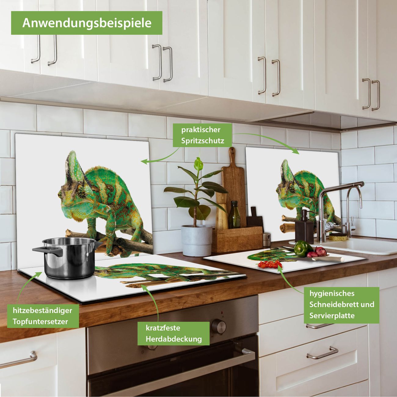 VIELSEITIG: Die Ceranfeldabdeckung ist vielseitig einsetzbar: ob als Spritzschutz hinter dem Herd für Ihre Küche oder als Glas Schneidebrett als hygienische und geruchsneutrale Unterlage. Sie können ebenfalls heiße Töpfe und Pfannen bis 100°C auf der Herdplattenabdeckung abstellen. Sie erhalten ein Multitalent für Ihre Küche. Die banjado Herdabdeckplatte aus Glas mit Motiv Chamäleon verdeckt mit einem schönen Motiv Ihr Ceranfeld bzw. Ihren Induktionsherd. Die Herdabdeckplatte ist vielseitig einsetzbar und passt sich dabei Ihrem Einrichtungsstil an. DESIGN: Die Herdabdeckung Chamäleon besteht aus hochwertigem, gehärtetem Glas mit einem unserer zahlreichen Motive. Sie haben die Wahl zwischen verschiedenen Maßen von einteiligen, zweiteiligen und einer dreiteiligen Herdabdeckung. Wählen Sie was zu Ihrer Einrichtung passt! DETAILS: Die Herdabdeckplatte ist vielseitig einsetzbar. Die Ecken sind für mehr Sicherheit dezent abgerundet, das Glas ist gehärtet. Sie erhalten separate Gummi Abstandshalter, damit Ihre Abdeckung rutschfest auf dem Herd steht. Diese können Sie frei positionieren, sodass die Herdabdeckung perfekt auf Ihrem Ceranfeld sitzt. BANJADO: Wir sind ein kleines Team aus dem Herzen von Sachsen und fertigen jeden Artikel nach Bestellung eigens für Sie an. Sie erhalten also keine preiswerte Importware, sondern Handarbeit. Auf Wunsch sind auch andere Farben und Größen möglich, kontakierten Sie uns gern.