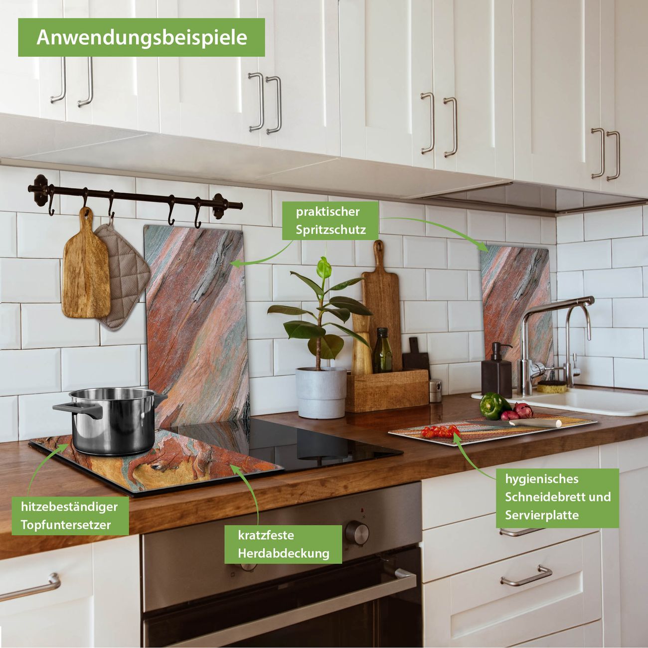 VIELSEITIG: Die Ceranfeldabdeckung ist vielseitig einsetzbar: ob als Spritzschutz hinter dem Herd für Ihre Küche oder als Glas Schneidebrett als hygienische und geruchsneutrale Unterlage. Sie können ebenfalls heiße Töpfe und Pfannen bis 100°C auf der Herdplattenabdeckung abstellen. Sie erhalten ein Multitalent für Ihre Küche. Die banjado Herdabdeckplatte aus Glas mit Motiv Coloured Wood verdeckt mit einem schönen Motiv Ihr Ceranfeld bzw. Ihren Induktionsherd. Die Herdabdeckplatte ist vielseitig einsetzbar und passt sich dabei Ihrem Einrichtungsstil an. DESIGN: Die Herdabdeckung Coloured Wood besteht aus hochwertigem, gehärtetem Glas mit einem unserer zahlreichen Motive. Sie haben die Wahl zwischen verschiedenen Maßen von einteiligen, zweiteiligen und einer dreiteiligen Herdabdeckung. Wählen Sie was zu Ihrer Einrichtung passt! DETAILS: Die Herdabdeckplatte ist vielseitig einsetzbar. Die Ecken sind für mehr Sicherheit dezent abgerundet, das Glas ist gehärtet. Sie erhalten separate Gummi Abstandshalter, damit Ihre Abdeckung rutschfest auf dem Herd steht. Diese können Sie frei positionieren, sodass die Herdabdeckung perfekt auf Ihrem Ceranfeld sitzt. BANJADO: Wir sind ein kleines Team aus dem Herzen von Sachsen und fertigen jeden Artikel nach Bestellung eigens für Sie an. Sie erhalten also keine preiswerte Importware, sondern Handarbeit. Auf Wunsch sind auch andere Farben und Größen möglich, kontakierten Sie uns gern.