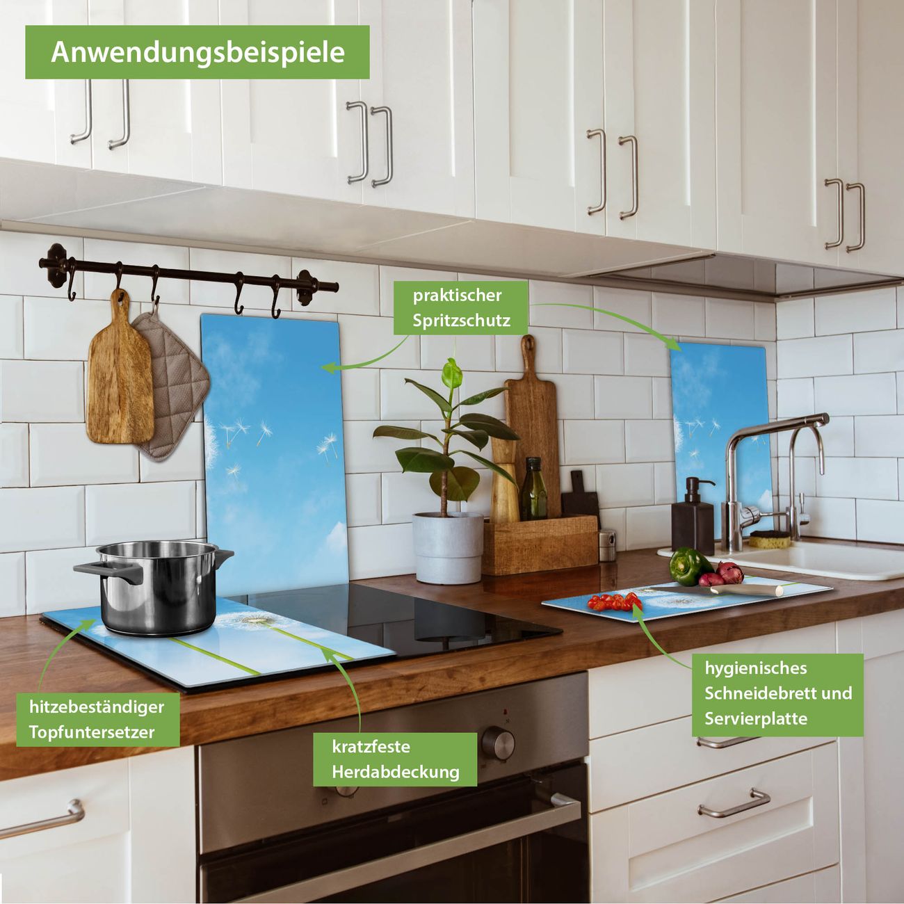VIELSEITIG: Die Ceranfeldabdeckung ist vielseitig einsetzbar: ob als Spritzschutz hinter dem Herd für Ihre Küche oder als Glas Schneidebrett als hygienische und geruchsneutrale Unterlage. Sie können ebenfalls heiße Töpfe und Pfannen bis 100°C auf der Herdplattenabdeckung abstellen. Sie erhalten ein Multitalent für Ihre Küche. Die banjado Herdabdeckplatte aus Glas mit Motiv Dandelion verdeckt mit einem schönen Motiv Ihr Ceranfeld bzw. Ihren Induktionsherd. Die Herdabdeckplatte ist vielseitig einsetzbar und passt sich dabei Ihrem Einrichtungsstil an. DESIGN: Die Herdabdeckung Dandelion besteht aus hochwertigem, gehärtetem Glas mit einem unserer zahlreichen Motive. Sie haben die Wahl zwischen verschiedenen Maßen von einteiligen, zweiteiligen und einer dreiteiligen Herdabdeckung. Wählen Sie was zu Ihrer Einrichtung passt! DETAILS: Die Herdabdeckplatte ist vielseitig einsetzbar. Die Ecken sind für mehr Sicherheit dezent abgerundet, das Glas ist gehärtet. Sie erhalten separate Gummi Abstandshalter, damit Ihre Abdeckung rutschfest auf dem Herd steht. Diese können Sie frei positionieren, sodass die Herdabdeckung perfekt auf Ihrem Ceranfeld sitzt. BANJADO: Wir sind ein kleines Team aus dem Herzen von Sachsen und fertigen jeden Artikel nach Bestellung eigens für Sie an. Sie erhalten also keine preiswerte Importware, sondern Handarbeit. Auf Wunsch sind auch andere Farben und Größen möglich, kontakierten Sie uns gern.