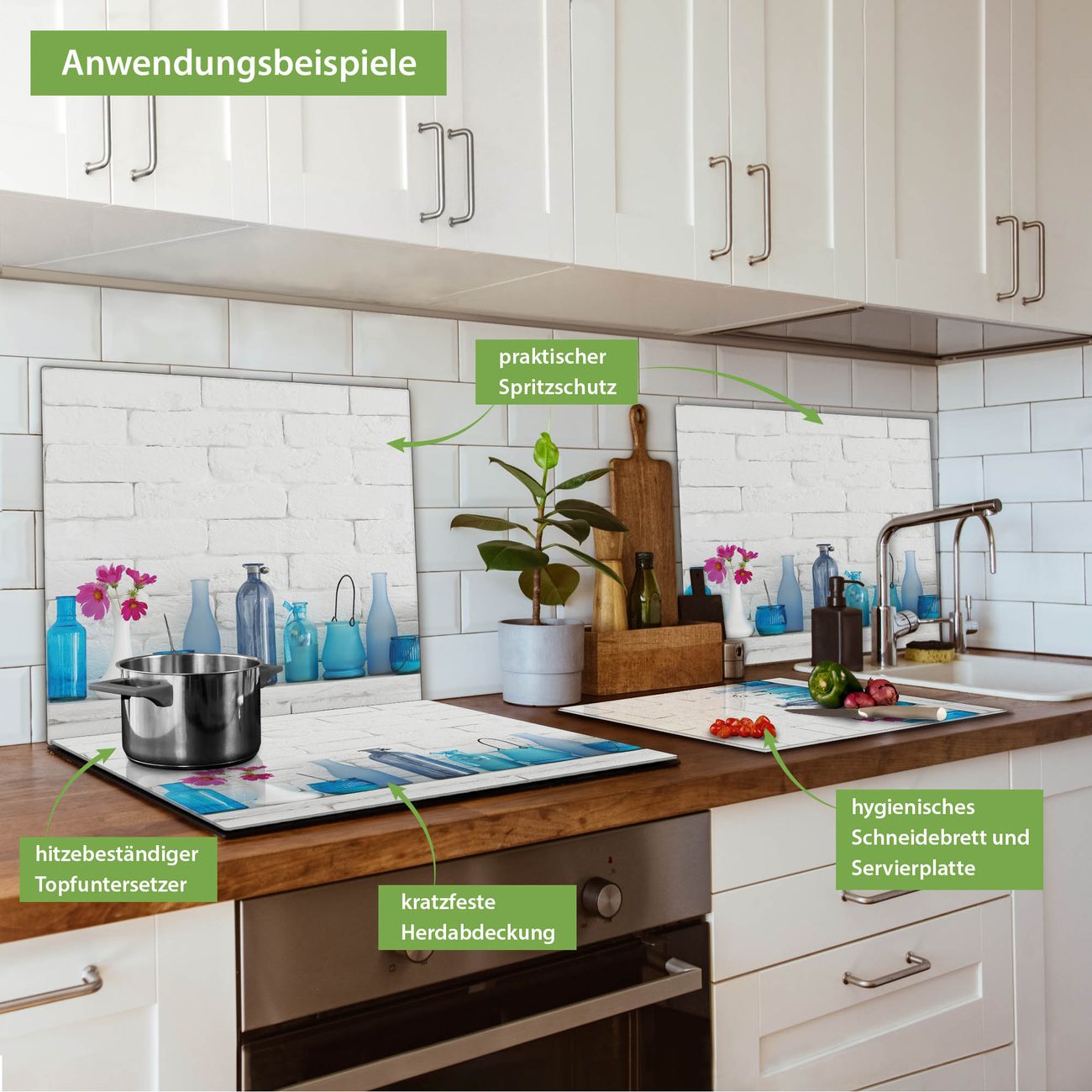 VIELSEITIG: Die Ceranfeldabdeckung ist vielseitig einsetzbar: ob als Spritzschutz hinter dem Herd für Ihre Küche oder als Glas Schneidebrett als hygienische und geruchsneutrale Unterlage. Sie können ebenfalls heiße Töpfe und Pfannen bis 100°C auf der Herdplattenabdeckung abstellen. Sie erhalten ein Multitalent für Ihre Küche. Die banjado Herdabdeckplatte aus Glas mit Motiv Dekoartikel Blau verdeckt mit einem schönen Motiv Ihr Ceranfeld bzw. Ihren Induktionsherd. Die Herdabdeckplatte ist vielseitig einsetzbar und passt sich dabei Ihrem Einrichtungsstil an. DESIGN: Die Herdabdeckung Dekoartikel Blau besteht aus hochwertigem, gehärtetem Glas mit einem unserer zahlreichen Motive. Sie haben die Wahl zwischen verschiedenen Maßen von einteiligen, zweiteiligen und einer dreiteiligen Herdabdeckung. Wählen Sie was zu Ihrer Einrichtung passt! DETAILS: Die Herdabdeckplatte ist vielseitig einsetzbar. Die Ecken sind für mehr Sicherheit dezent abgerundet, das Glas ist gehärtet. Sie erhalten separate Gummi Abstandshalter, damit Ihre Abdeckung rutschfest auf dem Herd steht. Diese können Sie frei positionieren, sodass die Herdabdeckung perfekt auf Ihrem Ceranfeld sitzt. BANJADO: Wir sind ein kleines Team aus dem Herzen von Sachsen und fertigen jeden Artikel nach Bestellung eigens für Sie an. Sie erhalten also keine preiswerte Importware, sondern Handarbeit. Auf Wunsch sind auch andere Farben und Größen möglich, kontakierten Sie uns gern.