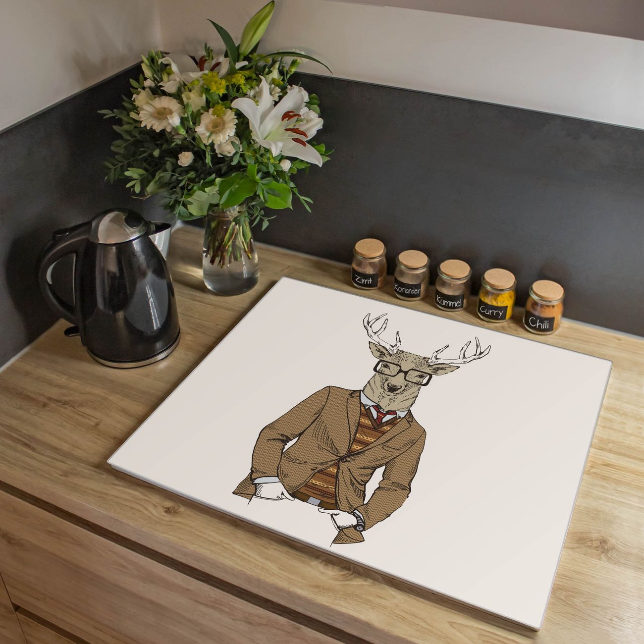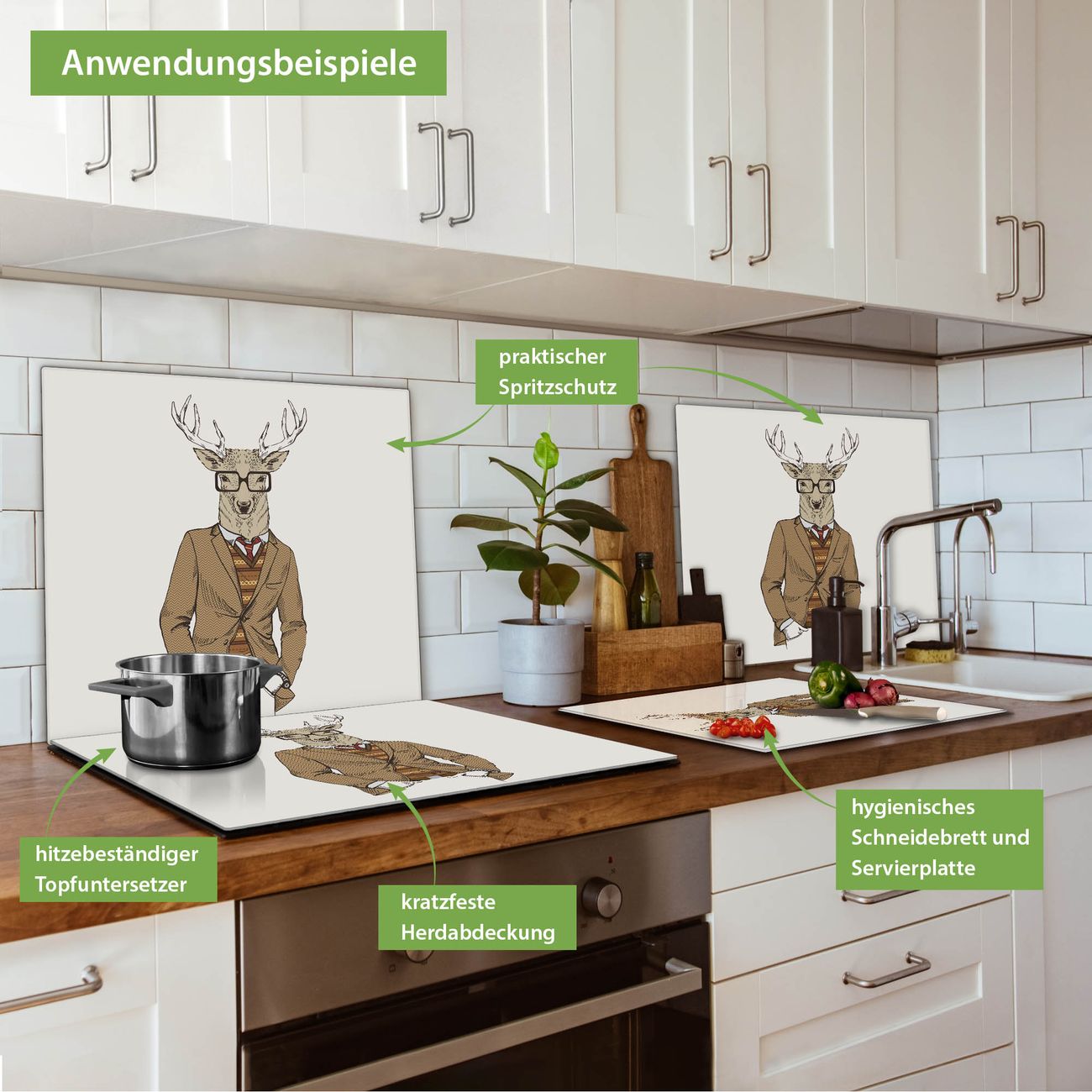 VIELSEITIG: Die Ceranfeldabdeckung ist vielseitig einsetzbar: ob als Spritzschutz hinter dem Herd für Ihre Küche oder als Glas Schneidebrett als hygienische und geruchsneutrale Unterlage. Sie können ebenfalls heiße Töpfe und Pfannen bis 100°C auf der Herdplattenabdeckung abstellen. Sie erhalten ein Multitalent für Ihre Küche. Die banjado Herdabdeckplatte aus Glas mit Motiv Doktor Hirsch verdeckt mit einem schönen Motiv Ihr Ceranfeld bzw. Ihren Induktionsherd. Die Herdabdeckplatte ist vielseitig einsetzbar und passt sich dabei Ihrem Einrichtungsstil an. DESIGN: Die Herdabdeckung Doktor Hirsch besteht aus hochwertigem, gehärtetem Glas mit einem unserer zahlreichen Motive. Sie haben die Wahl zwischen verschiedenen Maßen von einteiligen, zweiteiligen und einer dreiteiligen Herdabdeckung. Wählen Sie was zu Ihrer Einrichtung passt! DETAILS: Die Herdabdeckplatte ist vielseitig einsetzbar. Die Ecken sind für mehr Sicherheit dezent abgerundet, das Glas ist gehärtet. Sie erhalten separate Gummi Abstandshalter, damit Ihre Abdeckung rutschfest auf dem Herd steht. Diese können Sie frei positionieren, sodass die Herdabdeckung perfekt auf Ihrem Ceranfeld sitzt. BANJADO: Wir sind ein kleines Team aus dem Herzen von Sachsen und fertigen jeden Artikel nach Bestellung eigens für Sie an. Sie erhalten also keine preiswerte Importware, sondern Handarbeit. Auf Wunsch sind auch andere Farben und Größen möglich, kontakierten Sie uns gern.