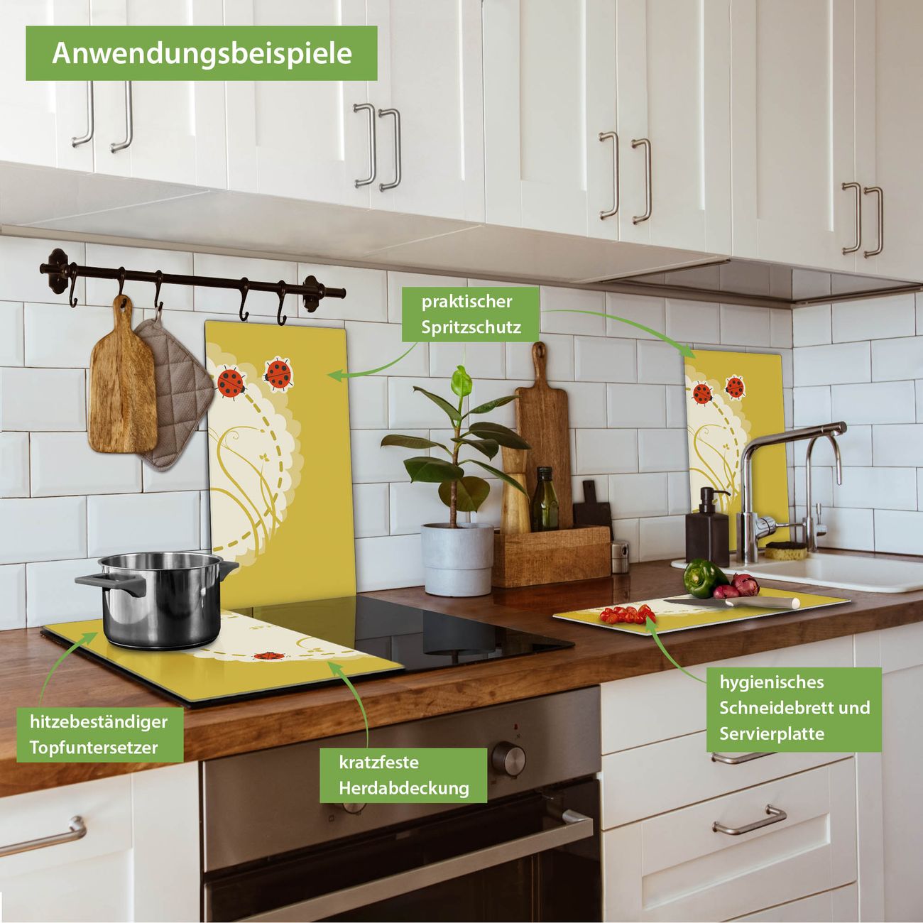VIELSEITIG: Die Ceranfeldabdeckung ist vielseitig einsetzbar: ob als Spritzschutz hinter dem Herd für Ihre Küche oder als Glas Schneidebrett als hygienische und geruchsneutrale Unterlage. Sie können ebenfalls heiße Töpfe und Pfannen bis 100°C auf der Herdplattenabdeckung abstellen. Sie erhalten ein Multitalent für Ihre Küche. Die banjado Herdabdeckplatte aus Glas mit Motiv Drei Marienkäfer verdeckt mit einem schönen Motiv Ihr Ceranfeld bzw. Ihren Induktionsherd. Die Herdabdeckplatte ist vielseitig einsetzbar und passt sich dabei Ihrem Einrichtungsstil an. DESIGN: Die Herdabdeckung Drei Marienkäfer besteht aus hochwertigem, gehärtetem Glas mit einem unserer zahlreichen Motive. Sie haben die Wahl zwischen verschiedenen Maßen von einteiligen, zweiteiligen und einer dreiteiligen Herdabdeckung. Wählen Sie was zu Ihrer Einrichtung passt! DETAILS: Die Herdabdeckplatte ist vielseitig einsetzbar. Die Ecken sind für mehr Sicherheit dezent abgerundet, das Glas ist gehärtet. Sie erhalten separate Gummi Abstandshalter, damit Ihre Abdeckung rutschfest auf dem Herd steht. Diese können Sie frei positionieren, sodass die Herdabdeckung perfekt auf Ihrem Ceranfeld sitzt. BANJADO: Wir sind ein kleines Team aus dem Herzen von Sachsen und fertigen jeden Artikel nach Bestellung eigens für Sie an. Sie erhalten also keine preiswerte Importware, sondern Handarbeit. Auf Wunsch sind auch andere Farben und Größen möglich, kontakierten Sie uns gern.