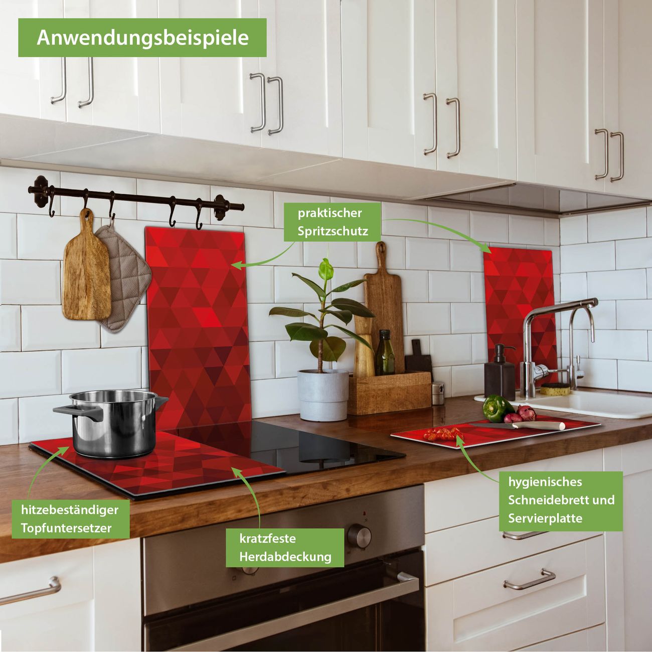 VIELSEITIG: Die Ceranfeldabdeckung ist vielseitig einsetzbar: ob als Spritzschutz hinter dem Herd für Ihre Küche oder als Glas Schneidebrett als hygienische und geruchsneutrale Unterlage. Sie können ebenfalls heiße Töpfe und Pfannen bis 100°C auf der Herdplattenabdeckung abstellen. Sie erhalten ein Multitalent für Ihre Küche. Die banjado Herdabdeckplatte aus Glas mit Motiv Dreiecke Rot verdeckt mit einem schönen Motiv Ihr Ceranfeld bzw. Ihren Induktionsherd. Die Herdabdeckplatte ist vielseitig einsetzbar und passt sich dabei Ihrem Einrichtungsstil an. DESIGN: Die Herdabdeckung Dreiecke Rot besteht aus hochwertigem, gehärtetem Glas mit einem unserer zahlreichen Motive. Sie haben die Wahl zwischen verschiedenen Maßen von einteiligen, zweiteiligen und einer dreiteiligen Herdabdeckung. Wählen Sie was zu Ihrer Einrichtung passt! DETAILS: Die Herdabdeckplatte ist vielseitig einsetzbar. Die Ecken sind für mehr Sicherheit dezent abgerundet, das Glas ist gehärtet. Sie erhalten separate Gummi Abstandshalter, damit Ihre Abdeckung rutschfest auf dem Herd steht. Diese können Sie frei positionieren, sodass die Herdabdeckung perfekt auf Ihrem Ceranfeld sitzt. BANJADO: Wir sind ein kleines Team aus dem Herzen von Sachsen und fertigen jeden Artikel nach Bestellung eigens für Sie an. Sie erhalten also keine preiswerte Importware, sondern Handarbeit. Auf Wunsch sind auch andere Farben und Größen möglich, kontakierten Sie uns gern.