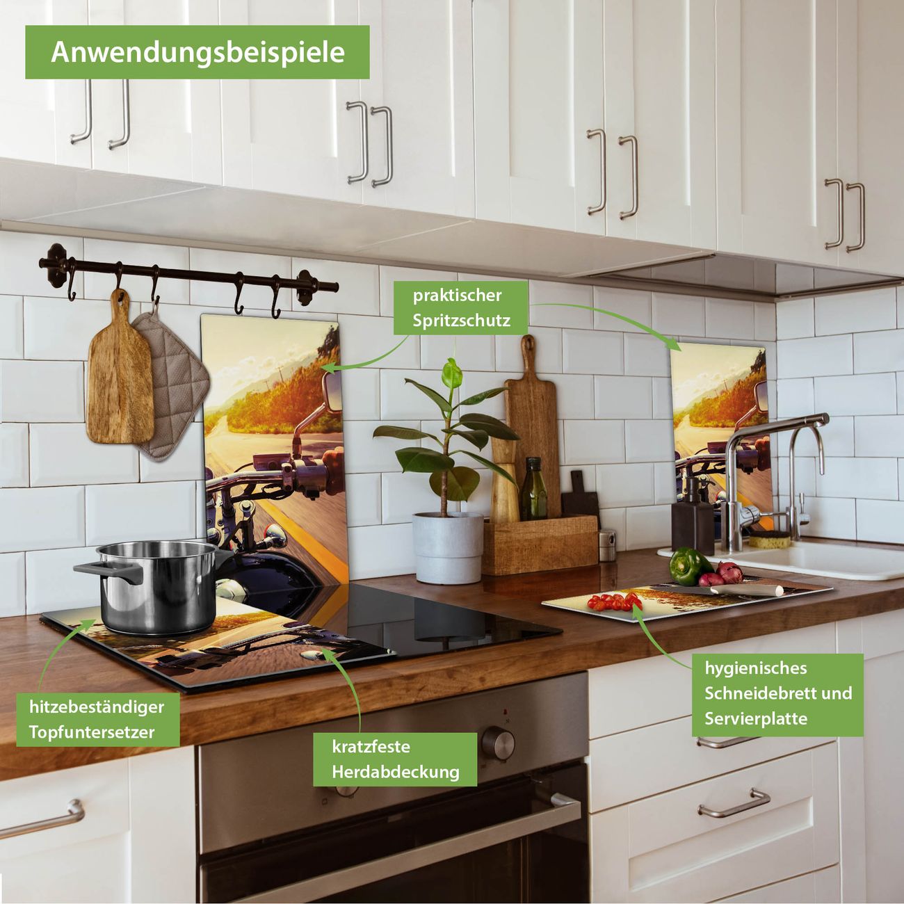 VIELSEITIG: Die Ceranfeldabdeckung ist vielseitig einsetzbar: ob als Spritzschutz hinter dem Herd für Ihre Küche oder als Glas Schneidebrett als hygienische und geruchsneutrale Unterlage. Sie können ebenfalls heiße Töpfe und Pfannen bis 100°C auf der Herdplattenabdeckung abstellen. Sie erhalten ein Multitalent für Ihre Küche. Die banjado Herdabdeckplatte aus Glas mit Motiv Easy Rider verdeckt mit einem schönen Motiv Ihr Ceranfeld bzw. Ihren Induktionsherd. Die Herdabdeckplatte ist vielseitig einsetzbar und passt sich dabei Ihrem Einrichtungsstil an. DESIGN: Die Herdabdeckung Easy Rider besteht aus hochwertigem, gehärtetem Glas mit einem unserer zahlreichen Motive. Sie haben die Wahl zwischen verschiedenen Maßen von einteiligen, zweiteiligen und einer dreiteiligen Herdabdeckung. Wählen Sie was zu Ihrer Einrichtung passt! DETAILS: Die Herdabdeckplatte ist vielseitig einsetzbar. Die Ecken sind für mehr Sicherheit dezent abgerundet, das Glas ist gehärtet. Sie erhalten separate Gummi Abstandshalter, damit Ihre Abdeckung rutschfest auf dem Herd steht. Diese können Sie frei positionieren, sodass die Herdabdeckung perfekt auf Ihrem Ceranfeld sitzt. BANJADO: Wir sind ein kleines Team aus dem Herzen von Sachsen und fertigen jeden Artikel nach Bestellung eigens für Sie an. Sie erhalten also keine preiswerte Importware, sondern Handarbeit. Auf Wunsch sind auch andere Farben und Größen möglich, kontakierten Sie uns gern.