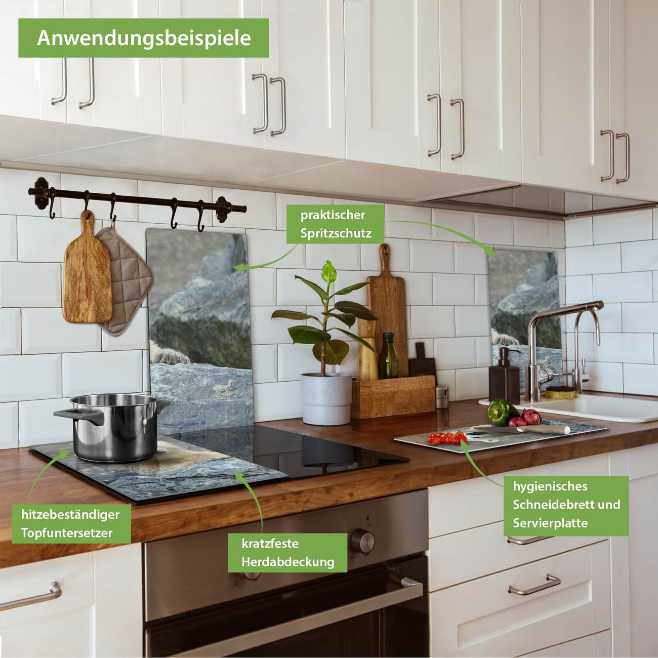 VIELSEITIG: Die Ceranfeldabdeckung ist vielseitig einsetzbar: ob als Spritzschutz hinter dem Herd für Ihre Küche oder als Glas Schneidebrett als hygienische und geruchsneutrale Unterlage. Sie können ebenfalls heiße Töpfe und Pfannen bis 100°C auf der Herdplattenabdeckung abstellen. Sie erhalten ein Multitalent für Ihre Küche. Die banjado Herdabdeckplatte aus Glas mit Motiv Eisbär Baby verdeckt mit einem schönen Motiv Ihr Ceranfeld bzw. Ihren Induktionsherd. Die Herdabdeckplatte ist vielseitig einsetzbar und passt sich dabei Ihrem Einrichtungsstil an. DESIGN: Die Herdabdeckung Eisbär Baby besteht aus hochwertigem, gehärtetem Glas mit einem unserer zahlreichen Motive. Sie haben die Wahl zwischen verschiedenen Maßen von einteiligen, zweiteiligen und einer dreiteiligen Herdabdeckung. Wählen Sie was zu Ihrer Einrichtung passt! DETAILS: Die Herdabdeckplatte ist vielseitig einsetzbar. Die Ecken sind für mehr Sicherheit dezent abgerundet, das Glas ist gehärtet. Sie erhalten separate Gummi Abstandshalter, damit Ihre Abdeckung rutschfest auf dem Herd steht. Diese können Sie frei positionieren, sodass die Herdabdeckung perfekt auf Ihrem Ceranfeld sitzt. BANJADO: Wir sind ein kleines Team aus dem Herzen von Sachsen und fertigen jeden Artikel nach Bestellung eigens für Sie an. Sie erhalten also keine preiswerte Importware, sondern Handarbeit. Auf Wunsch sind auch andere Farben und Größen möglich, kontakierten Sie uns gern.