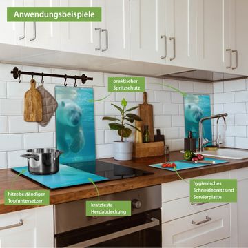 VIELSEITIG: Die Ceranfeldabdeckung ist vielseitig einsetzbar: ob als Spritzschutz hinter dem Herd für Ihre Küche oder als Glas Schneidebrett als hygienische und geruchsneutrale Unterlage. Sie können ebenfalls heiße Töpfe und Pfannen bis 100°C auf der Herdplattenabdeckung abstellen. Sie erhalten ein Multitalent für Ihre Küche. Die banjado Herdabdeckplatte aus Glas mit Motiv Eisbär unter Wasser verdeckt mit einem schönen Motiv Ihr Ceranfeld bzw. Ihren Induktionsherd. Die Herdabdeckplatte ist vielseitig einsetzbar und passt sich dabei Ihrem Einrichtungsstil an. DESIGN: Die Herdabdeckung Eisbär unter Wasser besteht aus hochwertigem, gehärtetem Glas mit einem unserer zahlreichen Motive. Sie haben die Wahl zwischen verschiedenen Maßen von einteiligen, zweiteiligen und einer dreiteiligen Herdabdeckung. Wählen Sie was zu Ihrer Einrichtung passt! DETAILS: Die Herdabdeckplatte ist vielseitig einsetzbar. Die Ecken sind für mehr Sicherheit dezent abgerundet, das Glas ist gehärtet. Sie erhalten separate Gummi Abstandshalter, damit Ihre Abdeckung rutschfest auf dem Herd steht. Diese können Sie frei positionieren, sodass die Herdabdeckung perfekt auf Ihrem Ceranfeld sitzt. BANJADO: Wir sind ein kleines Team aus dem Herzen von Sachsen und fertigen jeden Artikel nach Bestellung eigens für Sie an. Sie erhalten also keine preiswerte Importware, sondern Handarbeit. Auf Wunsch sind auch andere Farben und Größen möglich, kontakierten Sie uns gern.