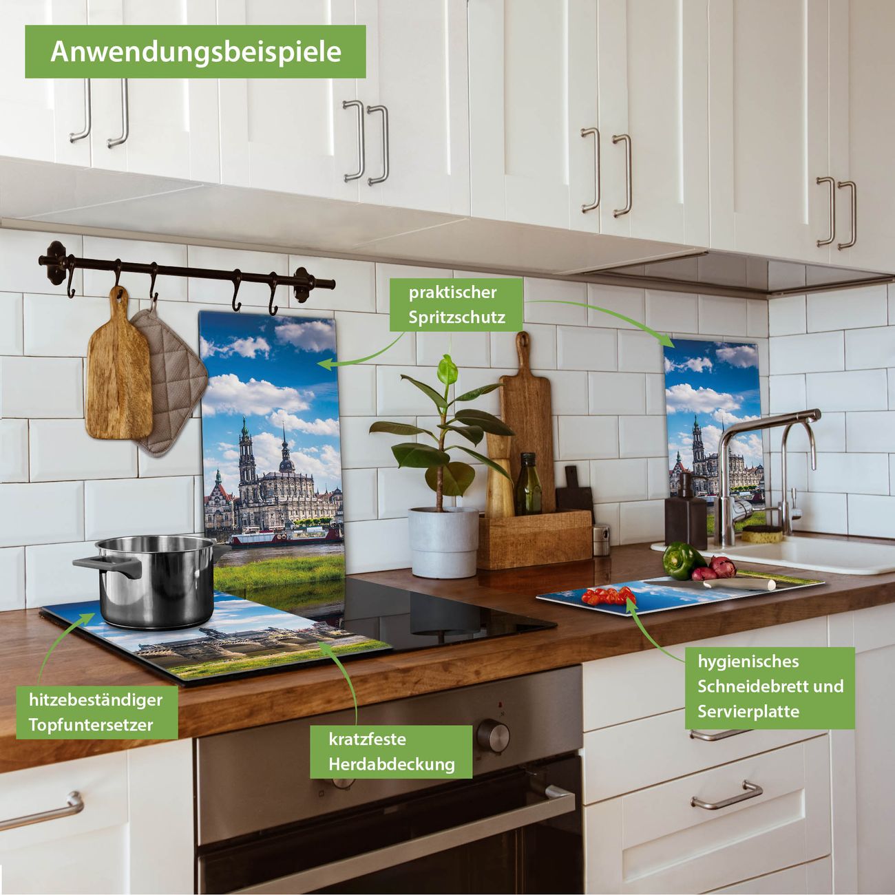VIELSEITIG: Die Ceranfeldabdeckung ist vielseitig einsetzbar: ob als Spritzschutz hinter dem Herd für Ihre Küche oder als Glas Schneidebrett als hygienische und geruchsneutrale Unterlage. Sie können ebenfalls heiße Töpfe und Pfannen bis 100°C auf der Herdplattenabdeckung abstellen. Sie erhalten ein Multitalent für Ihre Küche. Die banjado Herdabdeckplatte aus Glas mit Motiv Elbflorenz verdeckt mit einem schönen Motiv Ihr Ceranfeld bzw. Ihren Induktionsherd. Die Herdabdeckplatte ist vielseitig einsetzbar und passt sich dabei Ihrem Einrichtungsstil an. DESIGN: Die Herdabdeckung Elbflorenz besteht aus hochwertigem, gehärtetem Glas mit einem unserer zahlreichen Motive. Sie haben die Wahl zwischen verschiedenen Maßen von einteiligen, zweiteiligen und einer dreiteiligen Herdabdeckung. Wählen Sie was zu Ihrer Einrichtung passt! DETAILS: Die Herdabdeckplatte ist vielseitig einsetzbar. Die Ecken sind für mehr Sicherheit dezent abgerundet, das Glas ist gehärtet. Sie erhalten separate Gummi Abstandshalter, damit Ihre Abdeckung rutschfest auf dem Herd steht. Diese können Sie frei positionieren, sodass die Herdabdeckung perfekt auf Ihrem Ceranfeld sitzt. BANJADO: Wir sind ein kleines Team aus dem Herzen von Sachsen und fertigen jeden Artikel nach Bestellung eigens für Sie an. Sie erhalten also keine preiswerte Importware, sondern Handarbeit. Auf Wunsch sind auch andere Farben und Größen möglich, kontakierten Sie uns gern.