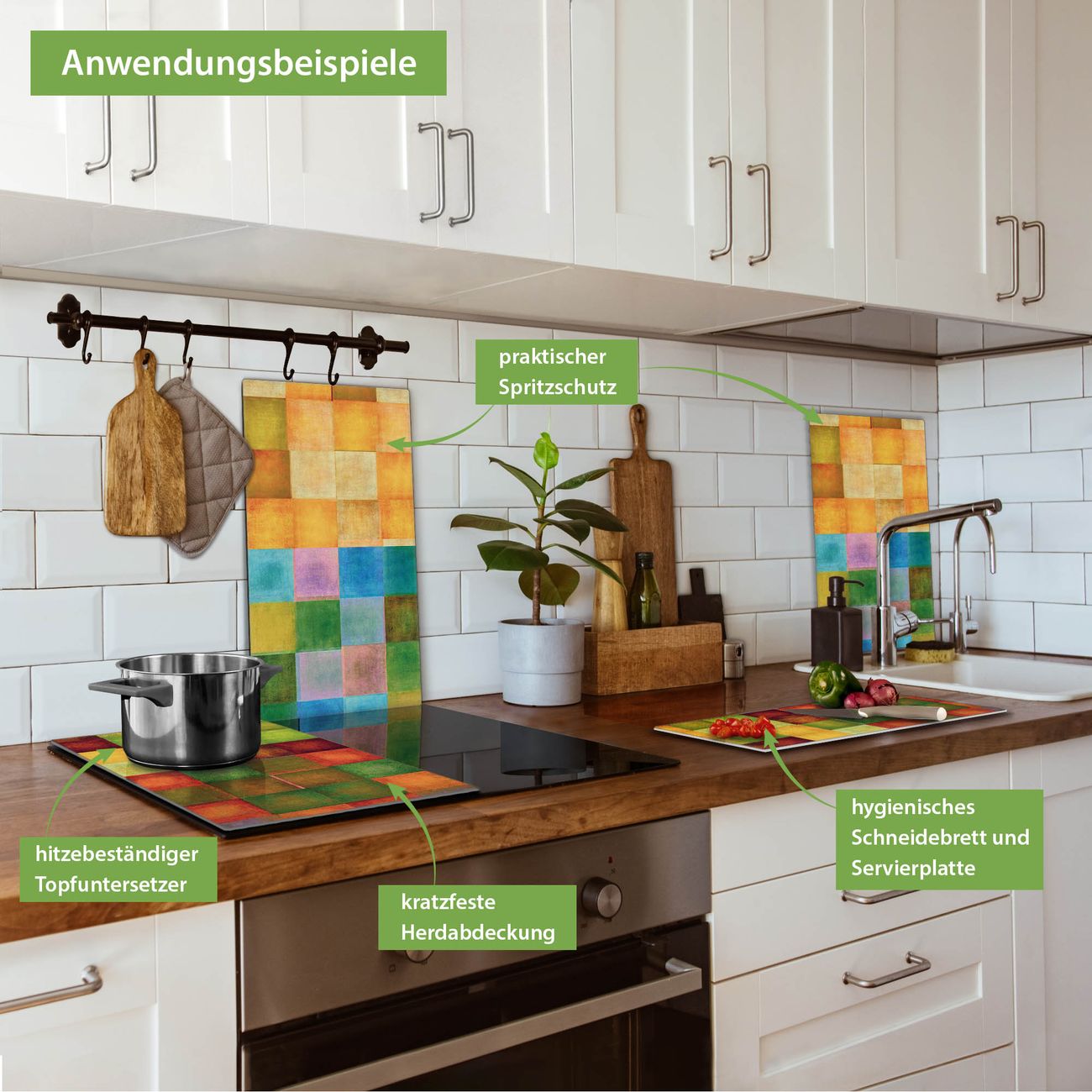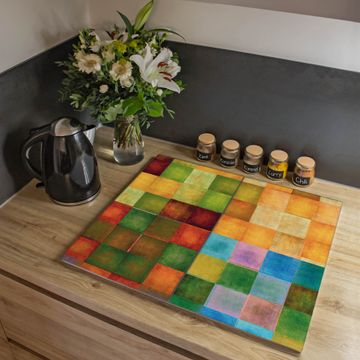 VIELSEITIG: Die Ceranfeldabdeckung ist vielseitig einsetzbar: ob als Spritzschutz hinter dem Herd für Ihre Küche oder als Glas Schneidebrett als hygienische und geruchsneutrale Unterlage. Sie können ebenfalls heiße Töpfe und Pfannen bis 100°C auf der Herdplattenabdeckung abstellen. Sie erhalten ein Multitalent für Ihre Küche. Die banjado Herdabdeckplatte aus Glas mit Motiv Farbkasten 2 verdeckt mit einem schönen Motiv Ihr Ceranfeld bzw. Ihren Induktionsherd. Die Herdabdeckplatte ist vielseitig einsetzbar und passt sich dabei Ihrem Einrichtungsstil an. DESIGN: Die Herdabdeckung Farbkasten 2 besteht aus hochwertigem, gehärtetem Glas mit einem unserer zahlreichen Motive. Sie haben die Wahl zwischen verschiedenen Maßen von einteiligen, zweiteiligen und einer dreiteiligen Herdabdeckung. Wählen Sie was zu Ihrer Einrichtung passt! DETAILS: Die Herdabdeckplatte ist vielseitig einsetzbar. Die Ecken sind für mehr Sicherheit dezent abgerundet, das Glas ist gehärtet. Sie erhalten separate Gummi Abstandshalter, damit Ihre Abdeckung rutschfest auf dem Herd steht. Diese können Sie frei positionieren, sodass die Herdabdeckung perfekt auf Ihrem Ceranfeld sitzt. BANJADO: Wir sind ein kleines Team aus dem Herzen von Sachsen und fertigen jeden Artikel nach Bestellung eigens für Sie an. Sie erhalten also keine preiswerte Importware, sondern Handarbeit. Auf Wunsch sind auch andere Farben und Größen möglich, kontakierten Sie uns gern.