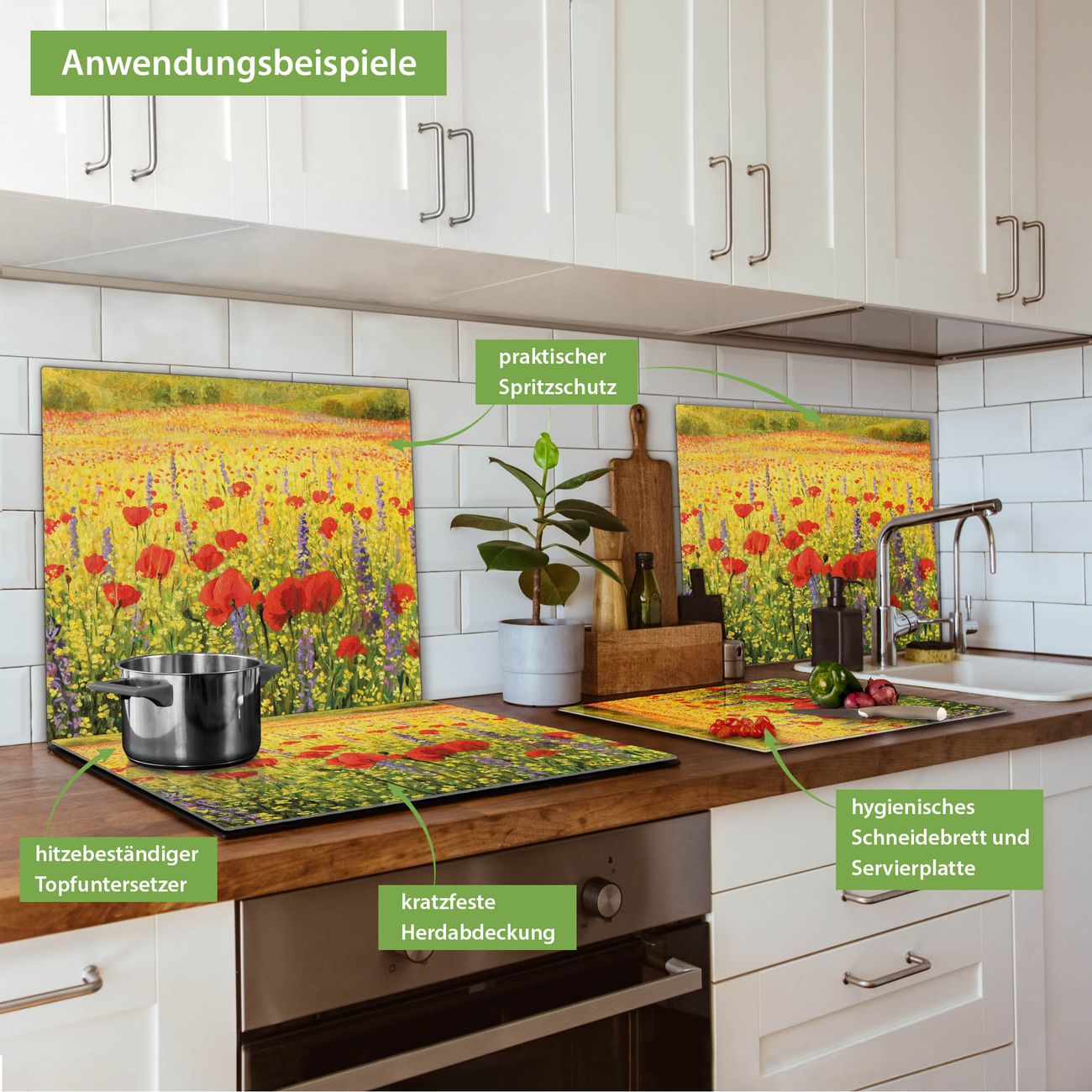 VIELSEITIG: Die Ceranfeldabdeckung ist vielseitig einsetzbar: ob als Spritzschutz hinter dem Herd für Ihre Küche oder als Glas Schneidebrett als hygienische und geruchsneutrale Unterlage. Sie können ebenfalls heiße Töpfe und Pfannen bis 100°C auf der Herdplattenabdeckung abstellen. Sie erhalten ein Multitalent für Ihre Küche. Die banjado Herdabdeckplatte aus Glas mit Motiv Feld Mit Mohnblumen verdeckt mit einem schönen Motiv Ihr Ceranfeld bzw. Ihren Induktionsherd. Die Herdabdeckplatte ist vielseitig einsetzbar und passt sich dabei Ihrem Einrichtungsstil an. DESIGN: Die Herdabdeckung Feld Mit Mohnblumen besteht aus hochwertigem, gehärtetem Glas mit einem unserer zahlreichen Motive. Sie haben die Wahl zwischen verschiedenen Maßen von einteiligen, zweiteiligen und einer dreiteiligen Herdabdeckung. Wählen Sie was zu Ihrer Einrichtung passt! DETAILS: Die Herdabdeckplatte ist vielseitig einsetzbar. Die Ecken sind für mehr Sicherheit dezent abgerundet, das Glas ist gehärtet. Sie erhalten separate Gummi Abstandshalter, damit Ihre Abdeckung rutschfest auf dem Herd steht. Diese können Sie frei positionieren, sodass die Herdabdeckung perfekt auf Ihrem Ceranfeld sitzt. BANJADO: Wir sind ein kleines Team aus dem Herzen von Sachsen und fertigen jeden Artikel nach Bestellung eigens für Sie an. Sie erhalten also keine preiswerte Importware, sondern Handarbeit. Auf Wunsch sind auch andere Farben und Größen möglich, kontakierten Sie uns gern.