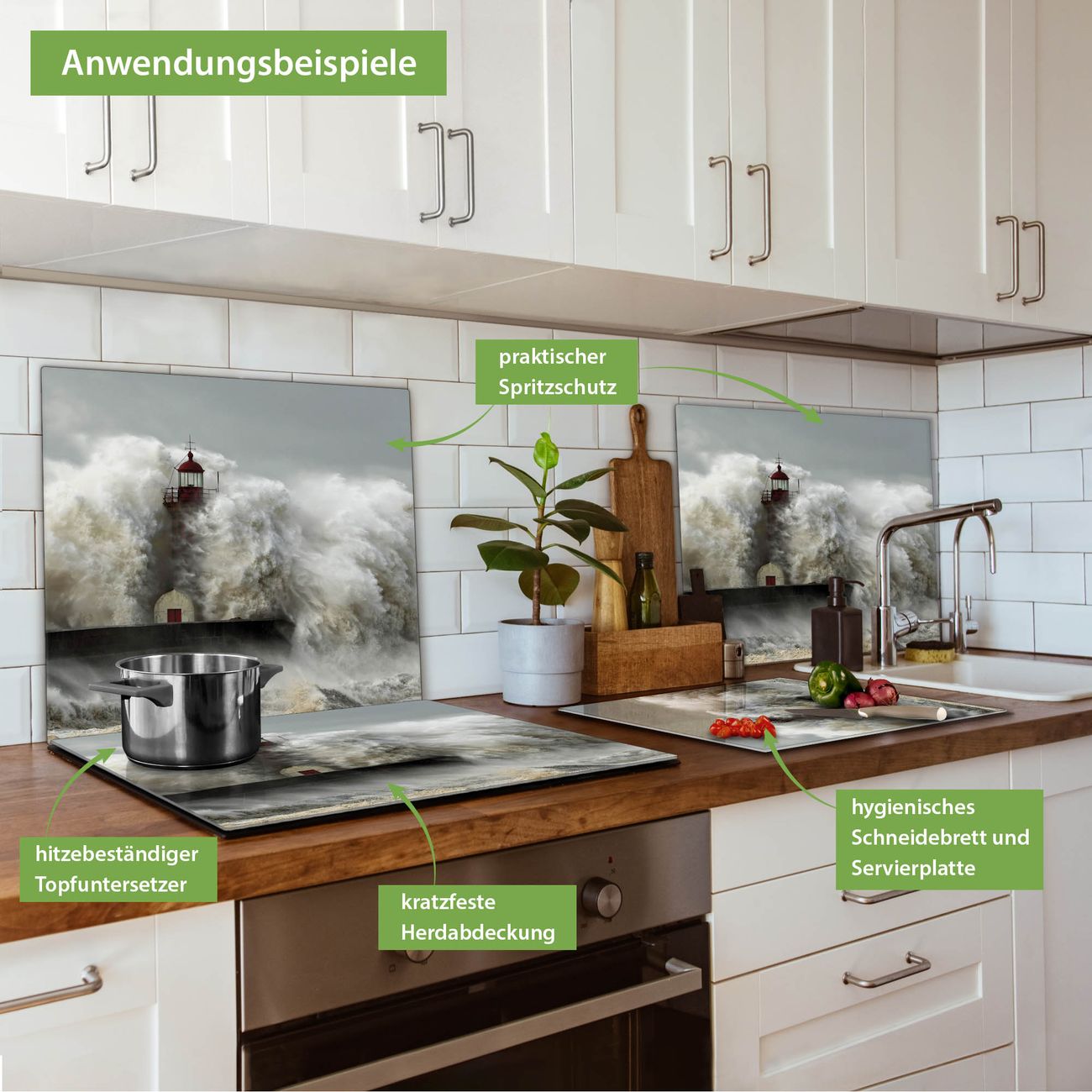 VIELSEITIG: Die Ceranfeldabdeckung ist vielseitig einsetzbar: ob als Spritzschutz hinter dem Herd für Ihre Küche oder als Glas Schneidebrett als hygienische und geruchsneutrale Unterlage. Sie können ebenfalls heiße Töpfe und Pfannen bis 100°C auf der Herdplattenabdeckung abstellen. Sie erhalten ein Multitalent für Ihre Küche. Die banjado Herdabdeckplatte aus Glas mit Motiv Fels In Der Brandung verdeckt mit einem schönen Motiv Ihr Ceranfeld bzw. Ihren Induktionsherd. Die Herdabdeckplatte ist vielseitig einsetzbar und passt sich dabei Ihrem Einrichtungsstil an. DESIGN: Die Herdabdeckung Fels In Der Brandung besteht aus hochwertigem, gehärtetem Glas mit einem unserer zahlreichen Motive. Sie haben die Wahl zwischen verschiedenen Maßen von einteiligen, zweiteiligen und einer dreiteiligen Herdabdeckung. Wählen Sie was zu Ihrer Einrichtung passt! DETAILS: Die Herdabdeckplatte ist vielseitig einsetzbar. Die Ecken sind für mehr Sicherheit dezent abgerundet, das Glas ist gehärtet. Sie erhalten separate Gummi Abstandshalter, damit Ihre Abdeckung rutschfest auf dem Herd steht. Diese können Sie frei positionieren, sodass die Herdabdeckung perfekt auf Ihrem Ceranfeld sitzt. BANJADO: Wir sind ein kleines Team aus dem Herzen von Sachsen und fertigen jeden Artikel nach Bestellung eigens für Sie an. Sie erhalten also keine preiswerte Importware, sondern Handarbeit. Auf Wunsch sind auch andere Farben und Größen möglich, kontakierten Sie uns gern.