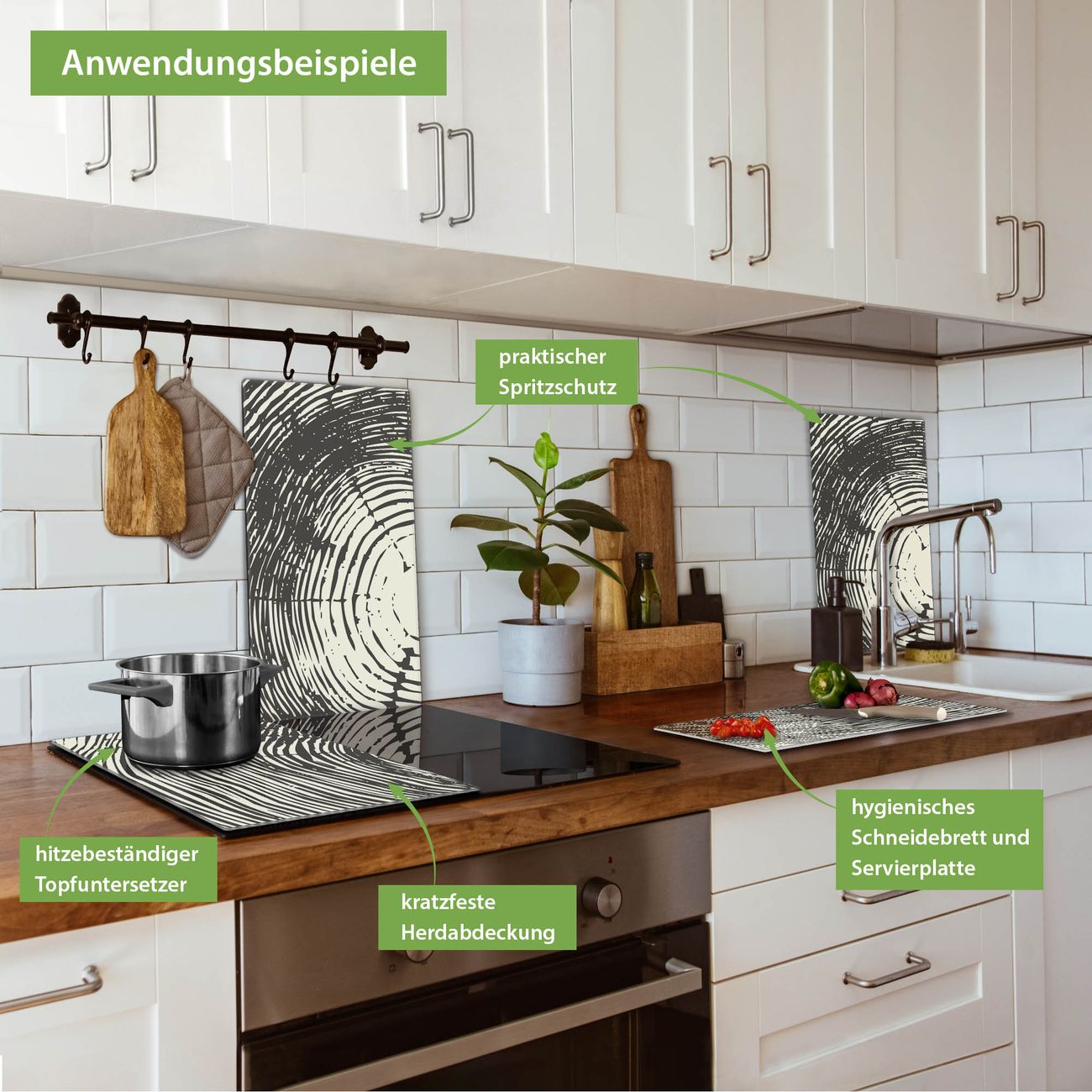 VIELSEITIG: Die Ceranfeldabdeckung ist vielseitig einsetzbar: ob als Spritzschutz hinter dem Herd für Ihre Küche oder als Glas Schneidebrett als hygienische und geruchsneutrale Unterlage. Sie können ebenfalls heiße Töpfe und Pfannen bis 100°C auf der Herdplattenabdeckung abstellen. Sie erhalten ein Multitalent für Ihre Küche. Die banjado Herdabdeckplatte aus Glas mit Motiv Fingerabdruck verdeckt mit einem schönen Motiv Ihr Ceranfeld bzw. Ihren Induktionsherd. Die Herdabdeckplatte ist vielseitig einsetzbar und passt sich dabei Ihrem Einrichtungsstil an. DESIGN: Die Herdabdeckung Fingerabdruck besteht aus hochwertigem, gehärtetem Glas mit einem unserer zahlreichen Motive. Sie haben die Wahl zwischen verschiedenen Maßen von einteiligen, zweiteiligen und einer dreiteiligen Herdabdeckung. Wählen Sie was zu Ihrer Einrichtung passt! DETAILS: Die Herdabdeckplatte ist vielseitig einsetzbar. Die Ecken sind für mehr Sicherheit dezent abgerundet, das Glas ist gehärtet. Sie erhalten separate Gummi Abstandshalter, damit Ihre Abdeckung rutschfest auf dem Herd steht. Diese können Sie frei positionieren, sodass die Herdabdeckung perfekt auf Ihrem Ceranfeld sitzt. BANJADO: Wir sind ein kleines Team aus dem Herzen von Sachsen und fertigen jeden Artikel nach Bestellung eigens für Sie an. Sie erhalten also keine preiswerte Importware, sondern Handarbeit. Auf Wunsch sind auch andere Farben und Größen möglich, kontakierten Sie uns gern.