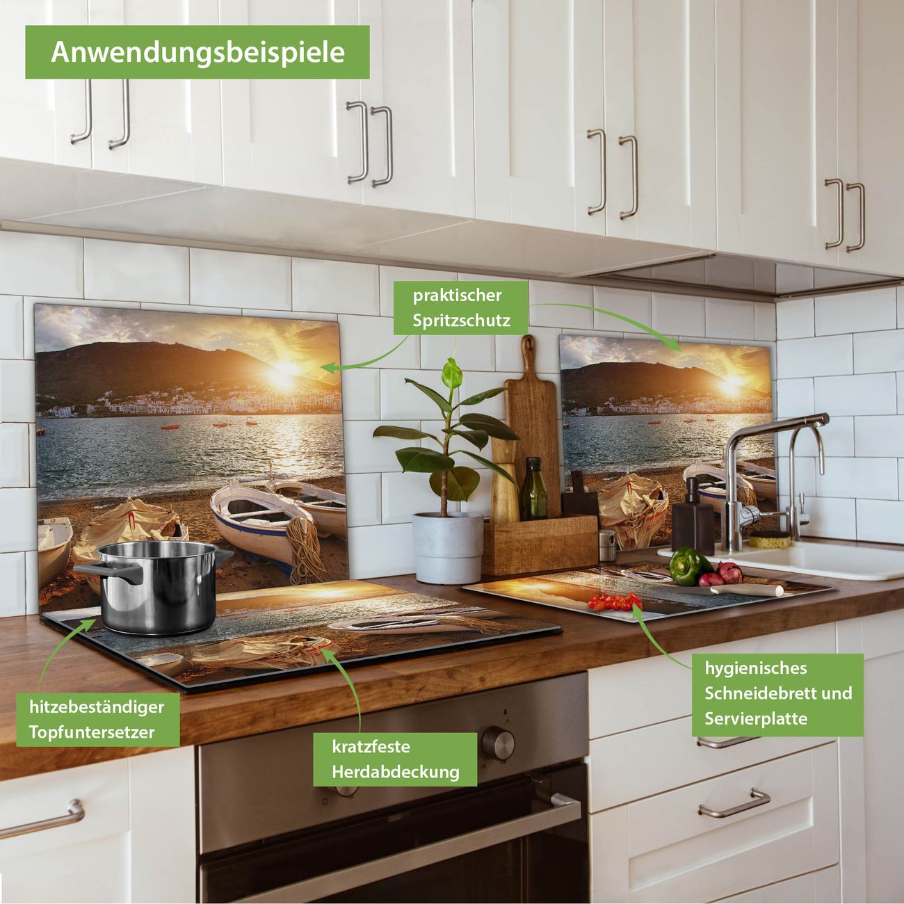 VIELSEITIG: Die Ceranfeldabdeckung ist vielseitig einsetzbar: ob als Spritzschutz hinter dem Herd für Ihre Küche oder als Glas Schneidebrett als hygienische und geruchsneutrale Unterlage. Sie können ebenfalls heiße Töpfe und Pfannen bis 100°C auf der Herdplattenabdeckung abstellen. Sie erhalten ein Multitalent für Ihre Küche. Die banjado Herdabdeckplatte aus Glas mit Motiv Fischerboote verdeckt mit einem schönen Motiv Ihr Ceranfeld bzw. Ihren Induktionsherd. Die Herdabdeckplatte ist vielseitig einsetzbar und passt sich dabei Ihrem Einrichtungsstil an. DESIGN: Die Herdabdeckung Fischerboote besteht aus hochwertigem, gehärtetem Glas mit einem unserer zahlreichen Motive. Sie haben die Wahl zwischen verschiedenen Maßen von einteiligen, zweiteiligen und einer dreiteiligen Herdabdeckung. Wählen Sie was zu Ihrer Einrichtung passt! DETAILS: Die Herdabdeckplatte ist vielseitig einsetzbar. Die Ecken sind für mehr Sicherheit dezent abgerundet, das Glas ist gehärtet. Sie erhalten separate Gummi Abstandshalter, damit Ihre Abdeckung rutschfest auf dem Herd steht. Diese können Sie frei positionieren, sodass die Herdabdeckung perfekt auf Ihrem Ceranfeld sitzt. BANJADO: Wir sind ein kleines Team aus dem Herzen von Sachsen und fertigen jeden Artikel nach Bestellung eigens für Sie an. Sie erhalten also keine preiswerte Importware, sondern Handarbeit. Auf Wunsch sind auch andere Farben und Größen möglich, kontakierten Sie uns gern.