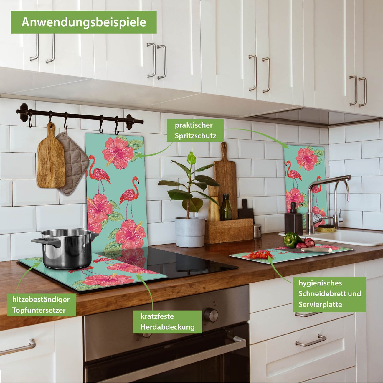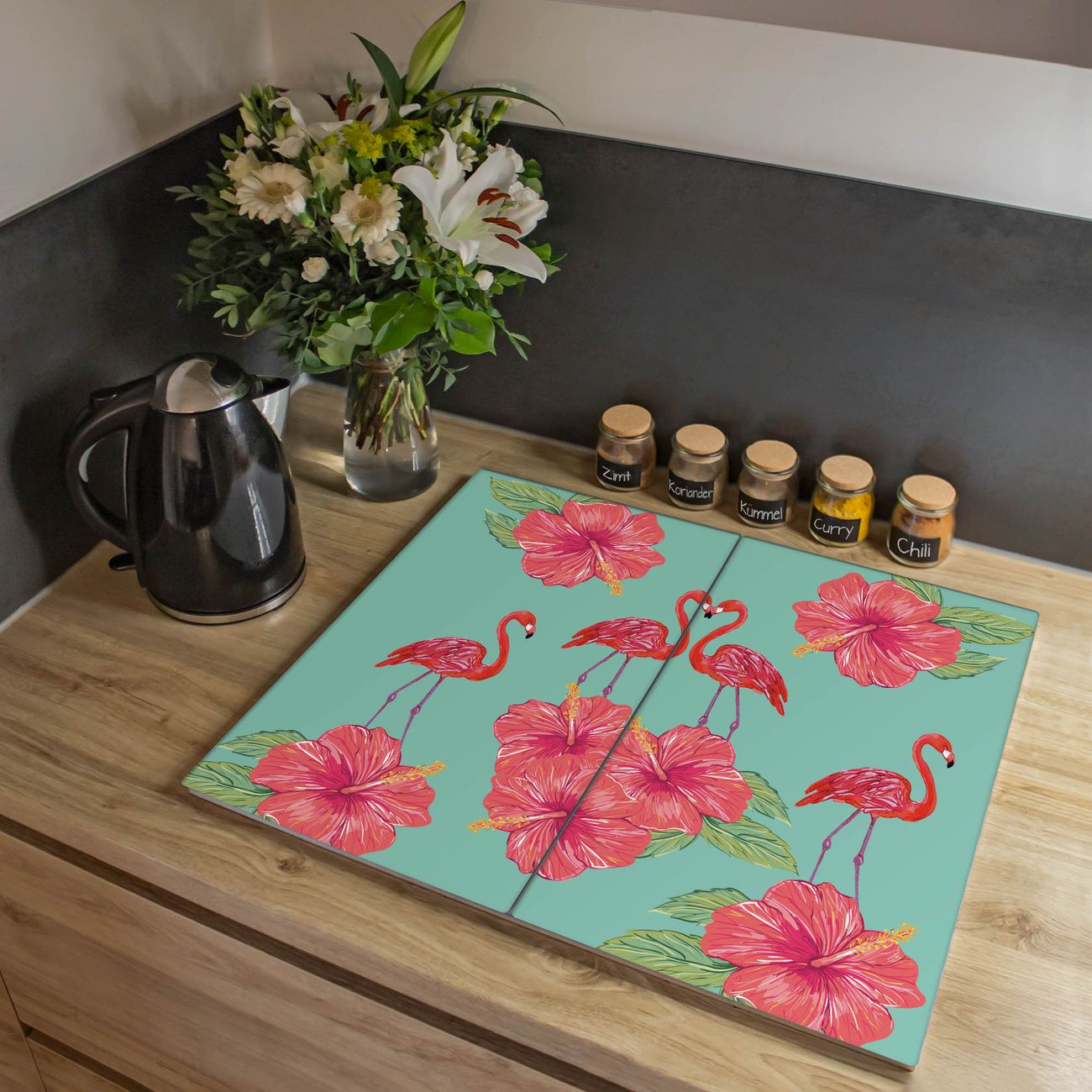VIELSEITIG: Die Ceranfeldabdeckung ist vielseitig einsetzbar: ob als Spritzschutz hinter dem Herd für Ihre Küche oder als Glas Schneidebrett als hygienische und geruchsneutrale Unterlage. Sie können ebenfalls heiße Töpfe und Pfannen bis 100°C auf der Herdplattenabdeckung abstellen. Sie erhalten ein Multitalent für Ihre Küche. Die banjado Herdabdeckplatte aus Glas mit Motiv Flamingo Liebe verdeckt mit einem schönen Motiv Ihr Ceranfeld bzw. Ihren Induktionsherd. Die Herdabdeckplatte ist vielseitig einsetzbar und passt sich dabei Ihrem Einrichtungsstil an. DESIGN: Die Herdabdeckung Flamingo Liebe besteht aus hochwertigem, gehärtetem Glas mit einem unserer zahlreichen Motive. Sie haben die Wahl zwischen verschiedenen Maßen von einteiligen, zweiteiligen und einer dreiteiligen Herdabdeckung. Wählen Sie was zu Ihrer Einrichtung passt! DETAILS: Die Herdabdeckplatte ist vielseitig einsetzbar. Die Ecken sind für mehr Sicherheit dezent abgerundet, das Glas ist gehärtet. Sie erhalten separate Gummi Abstandshalter, damit Ihre Abdeckung rutschfest auf dem Herd steht. Diese können Sie frei positionieren, sodass die Herdabdeckung perfekt auf Ihrem Ceranfeld sitzt. BANJADO: Wir sind ein kleines Team aus dem Herzen von Sachsen und fertigen jeden Artikel nach Bestellung eigens für Sie an. Sie erhalten also keine preiswerte Importware, sondern Handarbeit. Auf Wunsch sind auch andere Farben und Größen möglich, kontakierten Sie uns gern.