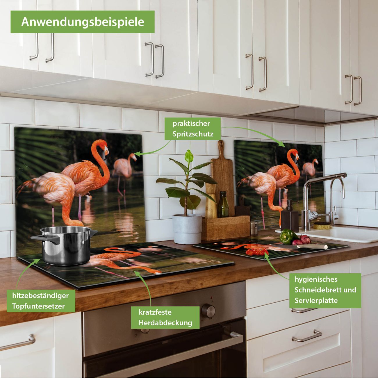 VIELSEITIG: Die Ceranfeldabdeckung ist vielseitig einsetzbar: ob als Spritzschutz hinter dem Herd für Ihre Küche oder als Glas Schneidebrett als hygienische und geruchsneutrale Unterlage. Sie können ebenfalls heiße Töpfe und Pfannen bis 100°C auf der Herdplattenabdeckung abstellen. Sie erhalten ein Multitalent für Ihre Küche. Die banjado Herdabdeckplatte aus Glas mit Motiv Flamingo verdeckt mit einem schönen Motiv Ihr Ceranfeld bzw. Ihren Induktionsherd. Die Herdabdeckplatte ist vielseitig einsetzbar und passt sich dabei Ihrem Einrichtungsstil an. DESIGN: Die Herdabdeckung Flamingo besteht aus hochwertigem, gehärtetem Glas mit einem unserer zahlreichen Motive. Sie haben die Wahl zwischen verschiedenen Maßen von einteiligen, zweiteiligen und einer dreiteiligen Herdabdeckung. Wählen Sie was zu Ihrer Einrichtung passt! DETAILS: Die Herdabdeckplatte ist vielseitig einsetzbar. Die Ecken sind für mehr Sicherheit dezent abgerundet, das Glas ist gehärtet. Sie erhalten separate Gummi Abstandshalter, damit Ihre Abdeckung rutschfest auf dem Herd steht. Diese können Sie frei positionieren, sodass die Herdabdeckung perfekt auf Ihrem Ceranfeld sitzt. BANJADO: Wir sind ein kleines Team aus dem Herzen von Sachsen und fertigen jeden Artikel nach Bestellung eigens für Sie an. Sie erhalten also keine preiswerte Importware, sondern Handarbeit. Auf Wunsch sind auch andere Farben und Größen möglich, kontakierten Sie uns gern.