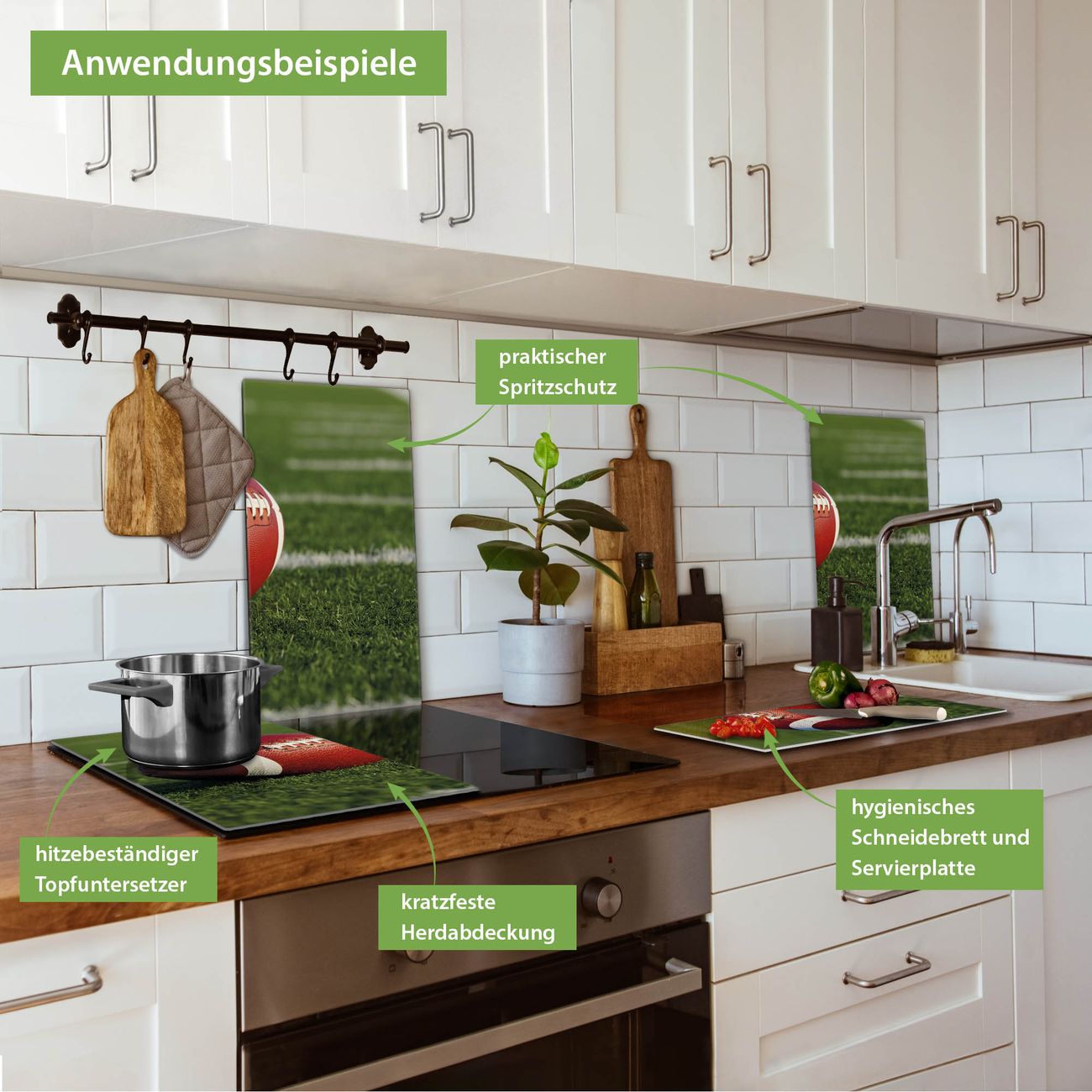 VIELSEITIG: Die Ceranfeldabdeckung ist vielseitig einsetzbar: ob als Spritzschutz hinter dem Herd für Ihre Küche oder als Glas Schneidebrett als hygienische und geruchsneutrale Unterlage. Sie können ebenfalls heiße Töpfe und Pfannen bis 100°C auf der Herdplattenabdeckung abstellen. Sie erhalten ein Multitalent für Ihre Küche. Die banjado Herdabdeckplatte aus Glas mit Motiv Football verdeckt mit einem schönen Motiv Ihr Ceranfeld bzw. Ihren Induktionsherd. Die Herdabdeckplatte ist vielseitig einsetzbar und passt sich dabei Ihrem Einrichtungsstil an. DESIGN: Die Herdabdeckung Football besteht aus hochwertigem, gehärtetem Glas mit einem unserer zahlreichen Motive. Sie haben die Wahl zwischen verschiedenen Maßen von einteiligen, zweiteiligen und einer dreiteiligen Herdabdeckung. Wählen Sie was zu Ihrer Einrichtung passt! DETAILS: Die Herdabdeckplatte ist vielseitig einsetzbar. Die Ecken sind für mehr Sicherheit dezent abgerundet, das Glas ist gehärtet. Sie erhalten separate Gummi Abstandshalter, damit Ihre Abdeckung rutschfest auf dem Herd steht. Diese können Sie frei positionieren, sodass die Herdabdeckung perfekt auf Ihrem Ceranfeld sitzt. BANJADO: Wir sind ein kleines Team aus dem Herzen von Sachsen und fertigen jeden Artikel nach Bestellung eigens für Sie an. Sie erhalten also keine preiswerte Importware, sondern Handarbeit. Auf Wunsch sind auch andere Farben und Größen möglich, kontakierten Sie uns gern.