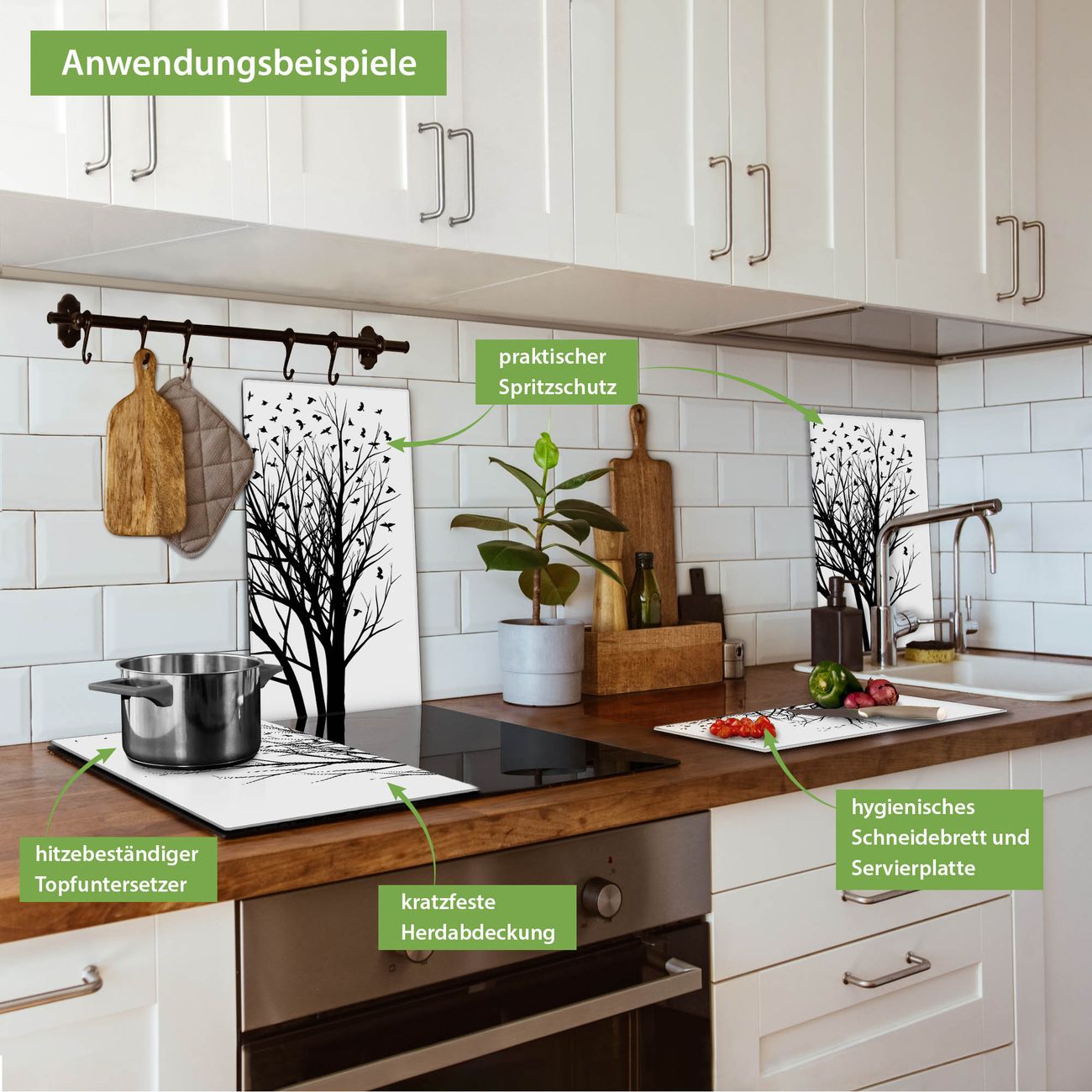 VIELSEITIG: Die Ceranfeldabdeckung ist vielseitig einsetzbar: ob als Spritzschutz hinter dem Herd für Ihre Küche oder als Glas Schneidebrett als hygienische und geruchsneutrale Unterlage. Sie können ebenfalls heiße Töpfe und Pfannen bis 100°C auf der Herdplattenabdeckung abstellen. Sie erhalten ein Multitalent für Ihre Küche. Die banjado Herdabdeckplatte aus Glas mit Motiv Fortfliegen verdeckt mit einem schönen Motiv Ihr Ceranfeld bzw. Ihren Induktionsherd. Die Herdabdeckplatte ist vielseitig einsetzbar und passt sich dabei Ihrem Einrichtungsstil an. DESIGN: Die Herdabdeckung Fortfliegen besteht aus hochwertigem, gehärtetem Glas mit einem unserer zahlreichen Motive. Sie haben die Wahl zwischen verschiedenen Maßen von einteiligen, zweiteiligen und einer dreiteiligen Herdabdeckung. Wählen Sie was zu Ihrer Einrichtung passt! DETAILS: Die Herdabdeckplatte ist vielseitig einsetzbar. Die Ecken sind für mehr Sicherheit dezent abgerundet, das Glas ist gehärtet. Sie erhalten separate Gummi Abstandshalter, damit Ihre Abdeckung rutschfest auf dem Herd steht. Diese können Sie frei positionieren, sodass die Herdabdeckung perfekt auf Ihrem Ceranfeld sitzt. BANJADO: Wir sind ein kleines Team aus dem Herzen von Sachsen und fertigen jeden Artikel nach Bestellung eigens für Sie an. Sie erhalten also keine preiswerte Importware, sondern Handarbeit. Auf Wunsch sind auch andere Farben und Größen möglich, kontakierten Sie uns gern.