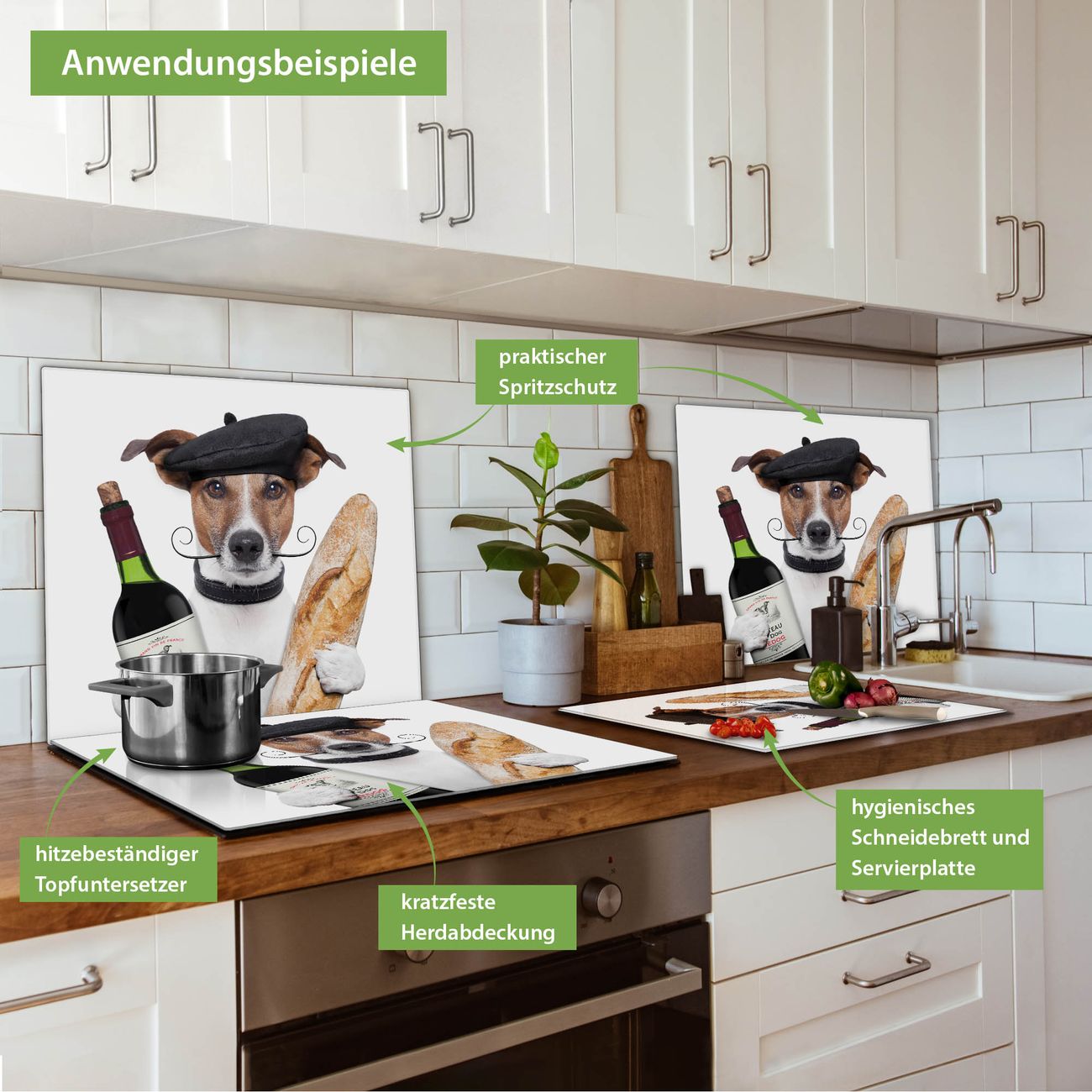 VIELSEITIG: Die Ceranfeldabdeckung ist vielseitig einsetzbar: ob als Spritzschutz hinter dem Herd für Ihre Küche oder als Glas Schneidebrett als hygienische und geruchsneutrale Unterlage. Sie können ebenfalls heiße Töpfe und Pfannen bis 100°C auf der Herdplattenabdeckung abstellen. Sie erhalten ein Multitalent für Ihre Küche. Die banjado Herdabdeckplatte aus Glas mit Motiv Franzose Jack Russel verdeckt mit einem schönen Motiv Ihr Ceranfeld bzw. Ihren Induktionsherd. Die Herdabdeckplatte ist vielseitig einsetzbar und passt sich dabei Ihrem Einrichtungsstil an. DESIGN: Die Herdabdeckung Franzose Jack Russel besteht aus hochwertigem, gehärtetem Glas mit einem unserer zahlreichen Motive. Sie haben die Wahl zwischen verschiedenen Maßen von einteiligen, zweiteiligen und einer dreiteiligen Herdabdeckung. Wählen Sie was zu Ihrer Einrichtung passt! DETAILS: Die Herdabdeckplatte ist vielseitig einsetzbar. Die Ecken sind für mehr Sicherheit dezent abgerundet, das Glas ist gehärtet. Sie erhalten separate Gummi Abstandshalter, damit Ihre Abdeckung rutschfest auf dem Herd steht. Diese können Sie frei positionieren, sodass die Herdabdeckung perfekt auf Ihrem Ceranfeld sitzt. BANJADO: Wir sind ein kleines Team aus dem Herzen von Sachsen und fertigen jeden Artikel nach Bestellung eigens für Sie an. Sie erhalten also keine preiswerte Importware, sondern Handarbeit. Auf Wunsch sind auch andere Farben und Größen möglich, kontakierten Sie uns gern.