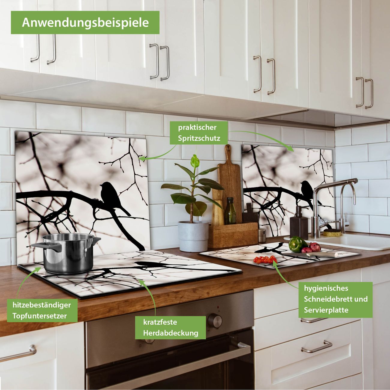 VIELSEITIG: Die Ceranfeldabdeckung ist vielseitig einsetzbar: ob als Spritzschutz hinter dem Herd für Ihre Küche oder als Glas Schneidebrett als hygienische und geruchsneutrale Unterlage. Sie können ebenfalls heiße Töpfe und Pfannen bis 100°C auf der Herdplattenabdeckung abstellen. Sie erhalten ein Multitalent für Ihre Küche. Die banjado Herdabdeckplatte aus Glas mit Motiv Früher Vogel verdeckt mit einem schönen Motiv Ihr Ceranfeld bzw. Ihren Induktionsherd. Die Herdabdeckplatte ist vielseitig einsetzbar und passt sich dabei Ihrem Einrichtungsstil an. DESIGN: Die Herdabdeckung Früher Vogel besteht aus hochwertigem, gehärtetem Glas mit einem unserer zahlreichen Motive. Sie haben die Wahl zwischen verschiedenen Maßen von einteiligen, zweiteiligen und einer dreiteiligen Herdabdeckung. Wählen Sie was zu Ihrer Einrichtung passt! DETAILS: Die Herdabdeckplatte ist vielseitig einsetzbar. Die Ecken sind für mehr Sicherheit dezent abgerundet, das Glas ist gehärtet. Sie erhalten separate Gummi Abstandshalter, damit Ihre Abdeckung rutschfest auf dem Herd steht. Diese können Sie frei positionieren, sodass die Herdabdeckung perfekt auf Ihrem Ceranfeld sitzt. BANJADO: Wir sind ein kleines Team aus dem Herzen von Sachsen und fertigen jeden Artikel nach Bestellung eigens für Sie an. Sie erhalten also keine preiswerte Importware, sondern Handarbeit. Auf Wunsch sind auch andere Farben und Größen möglich, kontakierten Sie uns gern.