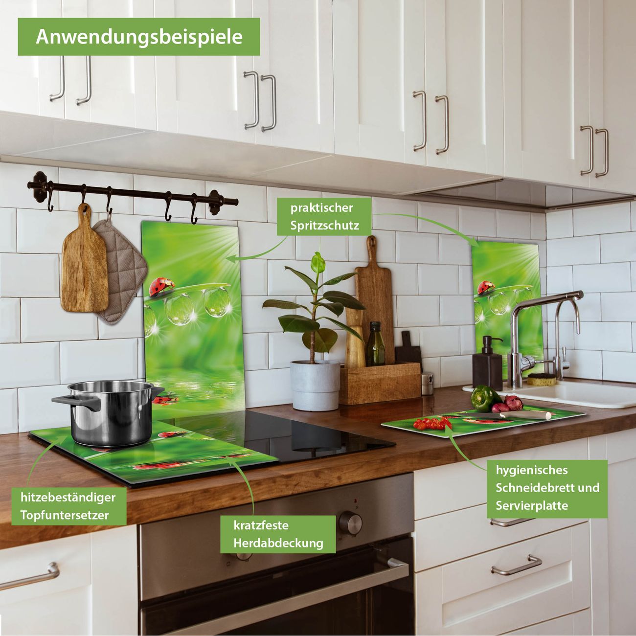VIELSEITIG: Die Ceranfeldabdeckung ist vielseitig einsetzbar: ob als Spritzschutz hinter dem Herd für Ihre Küche oder als Glas Schneidebrett als hygienische und geruchsneutrale Unterlage. Sie können ebenfalls heiße Töpfe und Pfannen bis 100°C auf der Herdplattenabdeckung abstellen. Sie erhalten ein Multitalent für Ihre Küche. Die banjado Herdabdeckplatte aus Glas mit Motiv Für Jeden Einen verdeckt mit einem schönen Motiv Ihr Ceranfeld bzw. Ihren Induktionsherd. Die Herdabdeckplatte ist vielseitig einsetzbar und passt sich dabei Ihrem Einrichtungsstil an. DESIGN: Die Herdabdeckung Für Jeden Einen besteht aus hochwertigem, gehärtetem Glas mit einem unserer zahlreichen Motive. Sie haben die Wahl zwischen verschiedenen Maßen von einteiligen, zweiteiligen und einer dreiteiligen Herdabdeckung. Wählen Sie was zu Ihrer Einrichtung passt! DETAILS: Die Herdabdeckplatte ist vielseitig einsetzbar. Die Ecken sind für mehr Sicherheit dezent abgerundet, das Glas ist gehärtet. Sie erhalten separate Gummi Abstandshalter, damit Ihre Abdeckung rutschfest auf dem Herd steht. Diese können Sie frei positionieren, sodass die Herdabdeckung perfekt auf Ihrem Ceranfeld sitzt. BANJADO: Wir sind ein kleines Team aus dem Herzen von Sachsen und fertigen jeden Artikel nach Bestellung eigens für Sie an. Sie erhalten also keine preiswerte Importware, sondern Handarbeit. Auf Wunsch sind auch andere Farben und Größen möglich, kontakierten Sie uns gern.