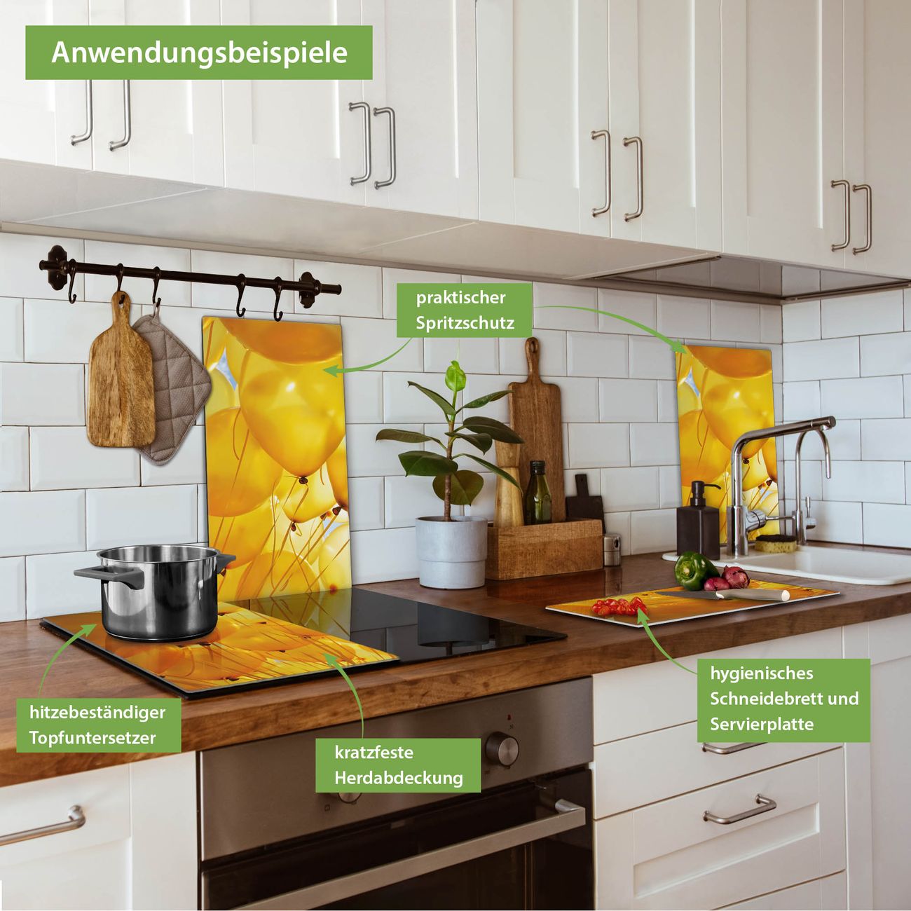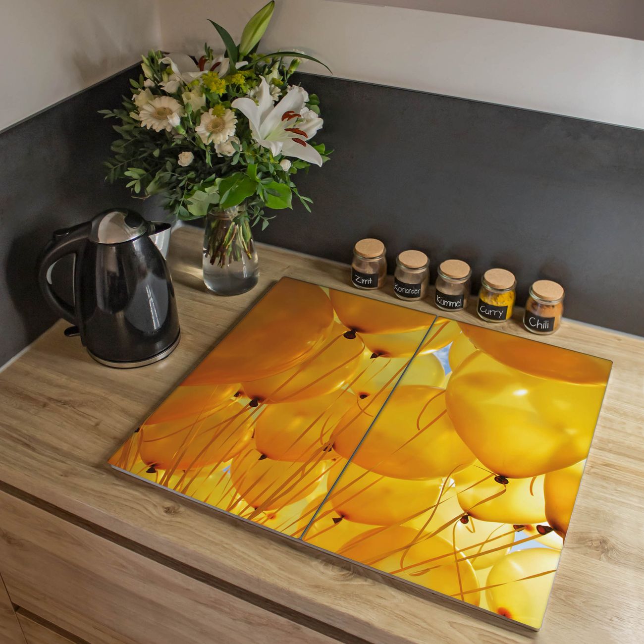 VIELSEITIG: Die Ceranfeldabdeckung ist vielseitig einsetzbar: ob als Spritzschutz hinter dem Herd für Ihre Küche oder als Glas Schneidebrett als hygienische und geruchsneutrale Unterlage. Sie können ebenfalls heiße Töpfe und Pfannen bis 100°C auf der Herdplattenabdeckung abstellen. Sie erhalten ein Multitalent für Ihre Küche. Die banjado Herdabdeckplatte aus Glas mit Motiv Gelbe Luftballons verdeckt mit einem schönen Motiv Ihr Ceranfeld bzw. Ihren Induktionsherd. Die Herdabdeckplatte ist vielseitig einsetzbar und passt sich dabei Ihrem Einrichtungsstil an. DESIGN: Die Herdabdeckung Gelbe Luftballons besteht aus hochwertigem, gehärtetem Glas mit einem unserer zahlreichen Motive. Sie haben die Wahl zwischen verschiedenen Maßen von einteiligen, zweiteiligen und einer dreiteiligen Herdabdeckung. Wählen Sie was zu Ihrer Einrichtung passt! DETAILS: Die Herdabdeckplatte ist vielseitig einsetzbar. Die Ecken sind für mehr Sicherheit dezent abgerundet, das Glas ist gehärtet. Sie erhalten separate Gummi Abstandshalter, damit Ihre Abdeckung rutschfest auf dem Herd steht. Diese können Sie frei positionieren, sodass die Herdabdeckung perfekt auf Ihrem Ceranfeld sitzt. BANJADO: Wir sind ein kleines Team aus dem Herzen von Sachsen und fertigen jeden Artikel nach Bestellung eigens für Sie an. Sie erhalten also keine preiswerte Importware, sondern Handarbeit. Auf Wunsch sind auch andere Farben und Größen möglich, kontakierten Sie uns gern.