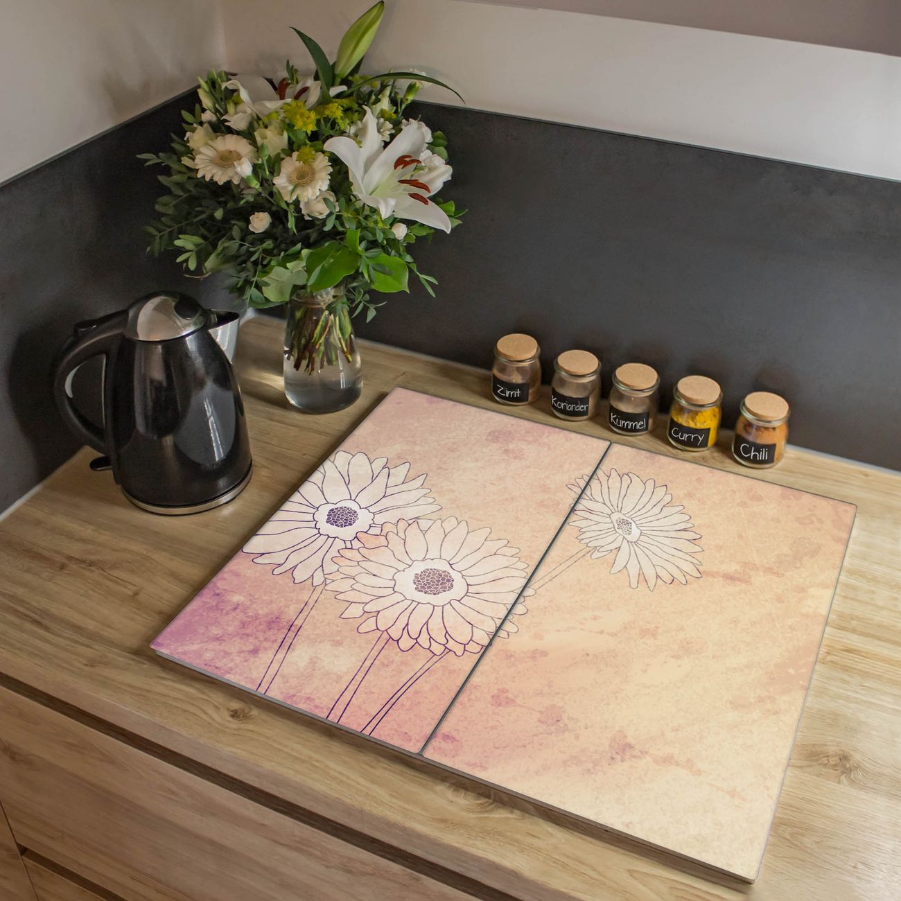 VIELSEITIG: Die Ceranfeldabdeckung ist vielseitig einsetzbar: ob als Spritzschutz hinter dem Herd für Ihre Küche oder als Glas Schneidebrett als hygienische und geruchsneutrale Unterlage. Sie können ebenfalls heiße Töpfe und Pfannen bis 100°C auf der Herdplattenabdeckung abstellen. Sie erhalten ein Multitalent für Ihre Küche. Die banjado Herdabdeckplatte aus Glas mit Motiv Gerbera verdeckt mit einem schönen Motiv Ihr Ceranfeld bzw. Ihren Induktionsherd. Die Herdabdeckplatte ist vielseitig einsetzbar und passt sich dabei Ihrem Einrichtungsstil an. DESIGN: Die Herdabdeckung Gerbera besteht aus hochwertigem, gehärtetem Glas mit einem unserer zahlreichen Motive. Sie haben die Wahl zwischen verschiedenen Maßen von einteiligen, zweiteiligen und einer dreiteiligen Herdabdeckung. Wählen Sie was zu Ihrer Einrichtung passt! DETAILS: Die Herdabdeckplatte ist vielseitig einsetzbar. Die Ecken sind für mehr Sicherheit dezent abgerundet, das Glas ist gehärtet. Sie erhalten separate Gummi Abstandshalter, damit Ihre Abdeckung rutschfest auf dem Herd steht. Diese können Sie frei positionieren, sodass die Herdabdeckung perfekt auf Ihrem Ceranfeld sitzt. BANJADO: Wir sind ein kleines Team aus dem Herzen von Sachsen und fertigen jeden Artikel nach Bestellung eigens für Sie an. Sie erhalten also keine preiswerte Importware, sondern Handarbeit. Auf Wunsch sind auch andere Farben und Größen möglich, kontakierten Sie uns gern.