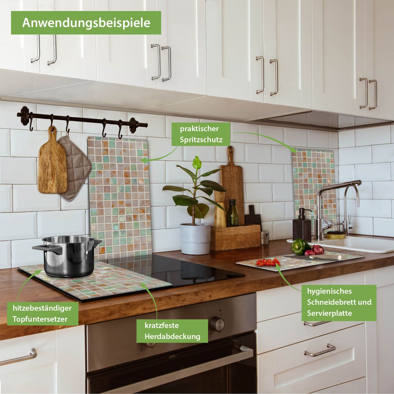 VIELSEITIG: Die Ceranfeldabdeckung ist vielseitig einsetzbar: ob als Spritzschutz hinter dem Herd für Ihre Küche oder als Glas Schneidebrett als hygienische und geruchsneutrale Unterlage. Sie können ebenfalls heiße Töpfe und Pfannen bis 100°C auf der Herdplattenabdeckung abstellen. Sie erhalten ein Multitalent für Ihre Küche. Die banjado Herdabdeckplatte aus Glas mit Motiv Grüne Fliesen verdeckt mit einem schönen Motiv Ihr Ceranfeld bzw. Ihren Induktionsherd. Die Herdabdeckplatte ist vielseitig einsetzbar und passt sich dabei Ihrem Einrichtungsstil an. DESIGN: Die Herdabdeckung Grüne Fliesen besteht aus hochwertigem, gehärtetem Glas mit einem unserer zahlreichen Motive. Sie haben die Wahl zwischen verschiedenen Maßen von einteiligen, zweiteiligen und einer dreiteiligen Herdabdeckung. Wählen Sie was zu Ihrer Einrichtung passt! DETAILS: Die Herdabdeckplatte ist vielseitig einsetzbar. Die Ecken sind für mehr Sicherheit dezent abgerundet, das Glas ist gehärtet. Sie erhalten separate Gummi Abstandshalter, damit Ihre Abdeckung rutschfest auf dem Herd steht. Diese können Sie frei positionieren, sodass die Herdabdeckung perfekt auf Ihrem Ceranfeld sitzt. BANJADO: Wir sind ein kleines Team aus dem Herzen von Sachsen und fertigen jeden Artikel nach Bestellung eigens für Sie an. Sie erhalten also keine preiswerte Importware, sondern Handarbeit. Auf Wunsch sind auch andere Farben und Größen möglich, kontakierten Sie uns gern.