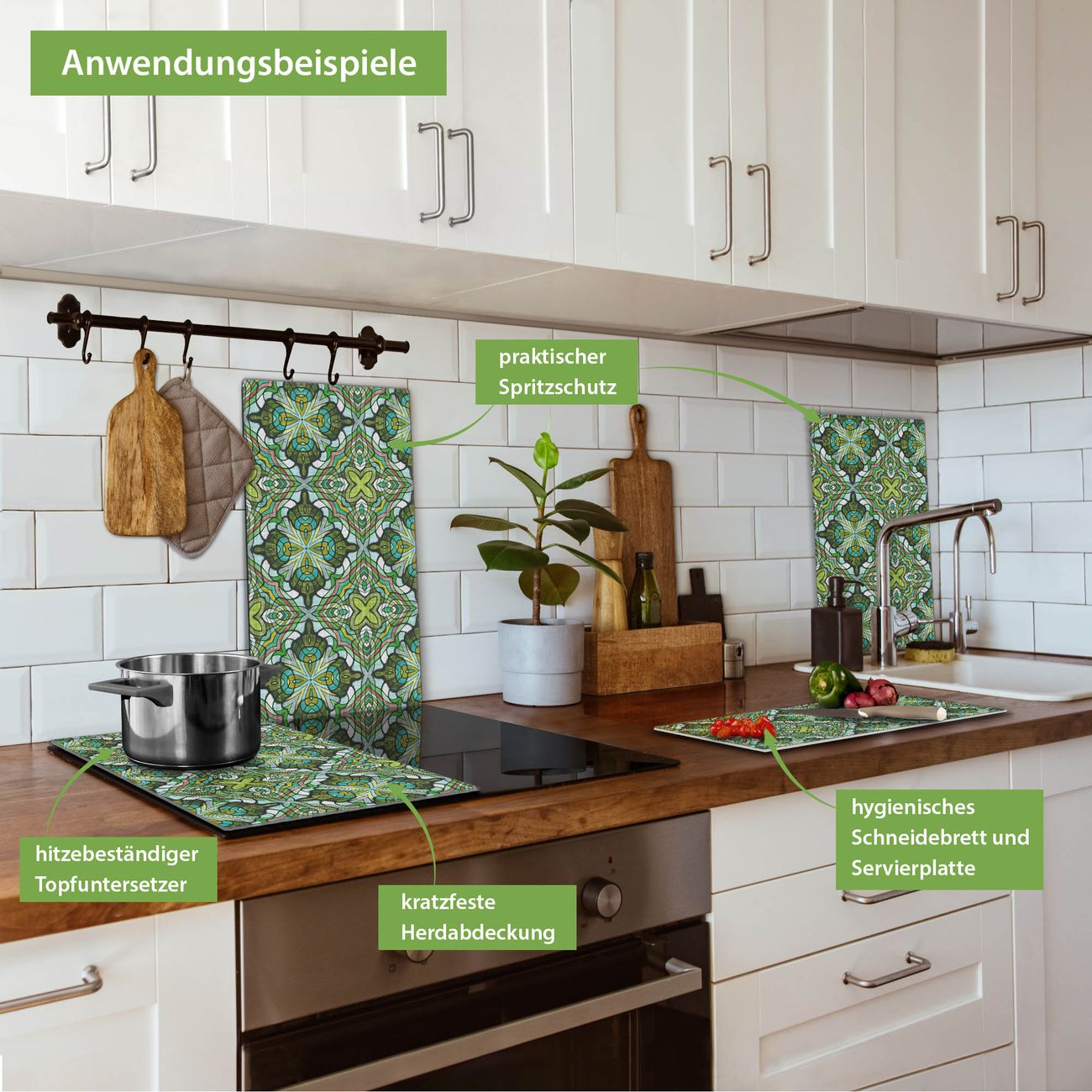 VIELSEITIG: Die Ceranfeldabdeckung ist vielseitig einsetzbar: ob als Spritzschutz hinter dem Herd für Ihre Küche oder als Glas Schneidebrett als hygienische und geruchsneutrale Unterlage. Sie können ebenfalls heiße Töpfe und Pfannen bis 100°C auf der Herdplattenabdeckung abstellen. Sie erhalten ein Multitalent für Ihre Küche. Die banjado Herdabdeckplatte aus Glas mit Motiv Grünes Muster verdeckt mit einem schönen Motiv Ihr Ceranfeld bzw. Ihren Induktionsherd. Die Herdabdeckplatte ist vielseitig einsetzbar und passt sich dabei Ihrem Einrichtungsstil an. DESIGN: Die Herdabdeckung Grünes Muster besteht aus hochwertigem, gehärtetem Glas mit einem unserer zahlreichen Motive. Sie haben die Wahl zwischen verschiedenen Maßen von einteiligen, zweiteiligen und einer dreiteiligen Herdabdeckung. Wählen Sie was zu Ihrer Einrichtung passt! DETAILS: Die Herdabdeckplatte ist vielseitig einsetzbar. Die Ecken sind für mehr Sicherheit dezent abgerundet, das Glas ist gehärtet. Sie erhalten separate Gummi Abstandshalter, damit Ihre Abdeckung rutschfest auf dem Herd steht. Diese können Sie frei positionieren, sodass die Herdabdeckung perfekt auf Ihrem Ceranfeld sitzt. BANJADO: Wir sind ein kleines Team aus dem Herzen von Sachsen und fertigen jeden Artikel nach Bestellung eigens für Sie an. Sie erhalten also keine preiswerte Importware, sondern Handarbeit. Auf Wunsch sind auch andere Farben und Größen möglich, kontakierten Sie uns gern.