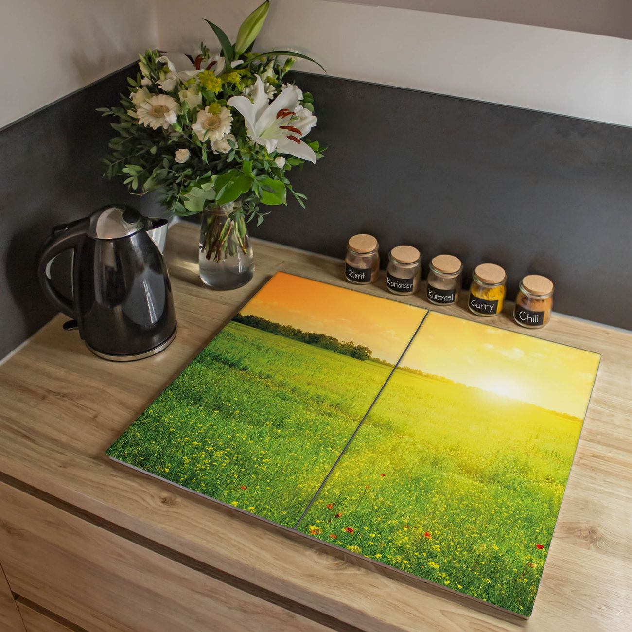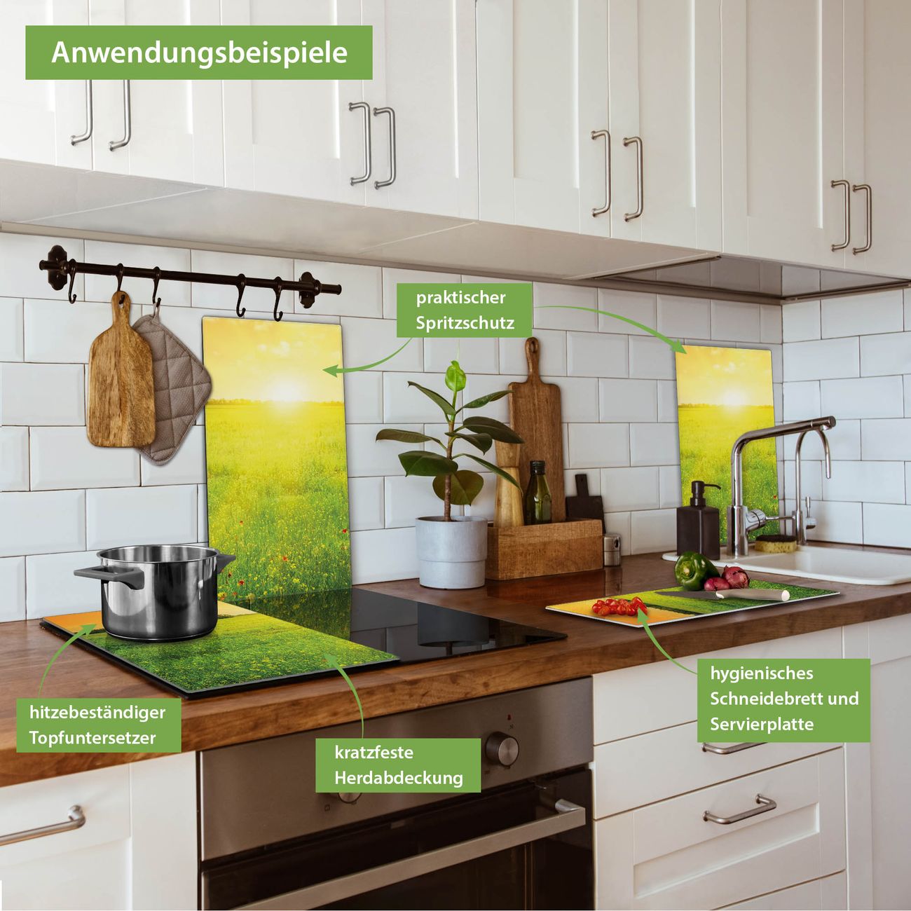 VIELSEITIG: Die Ceranfeldabdeckung ist vielseitig einsetzbar: ob als Spritzschutz hinter dem Herd für Ihre Küche oder als Glas Schneidebrett als hygienische und geruchsneutrale Unterlage. Sie können ebenfalls heiße Töpfe und Pfannen bis 100°C auf der Herdplattenabdeckung abstellen. Sie erhalten ein Multitalent für Ihre Küche. Die banjado Herdabdeckplatte aus Glas mit Motiv Guten Morgen 2 verdeckt mit einem schönen Motiv Ihr Ceranfeld bzw. Ihren Induktionsherd. Die Herdabdeckplatte ist vielseitig einsetzbar und passt sich dabei Ihrem Einrichtungsstil an. DESIGN: Die Herdabdeckung Guten Morgen 2 besteht aus hochwertigem, gehärtetem Glas mit einem unserer zahlreichen Motive. Sie haben die Wahl zwischen verschiedenen Maßen von einteiligen, zweiteiligen und einer dreiteiligen Herdabdeckung. Wählen Sie was zu Ihrer Einrichtung passt! DETAILS: Die Herdabdeckplatte ist vielseitig einsetzbar. Die Ecken sind für mehr Sicherheit dezent abgerundet, das Glas ist gehärtet. Sie erhalten separate Gummi Abstandshalter, damit Ihre Abdeckung rutschfest auf dem Herd steht. Diese können Sie frei positionieren, sodass die Herdabdeckung perfekt auf Ihrem Ceranfeld sitzt. BANJADO: Wir sind ein kleines Team aus dem Herzen von Sachsen und fertigen jeden Artikel nach Bestellung eigens für Sie an. Sie erhalten also keine preiswerte Importware, sondern Handarbeit. Auf Wunsch sind auch andere Farben und Größen möglich, kontakierten Sie uns gern.