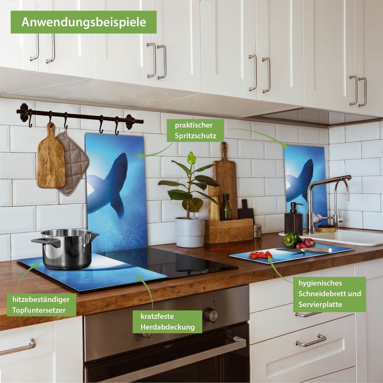 VIELSEITIG: Die Ceranfeldabdeckung ist vielseitig einsetzbar: ob als Spritzschutz hinter dem Herd für Ihre Küche oder als Glas Schneidebrett als hygienische und geruchsneutrale Unterlage. Sie können ebenfalls heiße Töpfe und Pfannen bis 100°C auf der Herdplattenabdeckung abstellen. Sie erhalten ein Multitalent für Ihre Küche. Die banjado Herdabdeckplatte aus Glas mit Motiv Hai verdeckt mit einem schönen Motiv Ihr Ceranfeld bzw. Ihren Induktionsherd. Die Herdabdeckplatte ist vielseitig einsetzbar und passt sich dabei Ihrem Einrichtungsstil an. DESIGN: Die Herdabdeckung Hai besteht aus hochwertigem, gehärtetem Glas mit einem unserer zahlreichen Motive. Sie haben die Wahl zwischen verschiedenen Maßen von einteiligen, zweiteiligen und einer dreiteiligen Herdabdeckung. Wählen Sie was zu Ihrer Einrichtung passt! DETAILS: Die Herdabdeckplatte ist vielseitig einsetzbar. Die Ecken sind für mehr Sicherheit dezent abgerundet, das Glas ist gehärtet. Sie erhalten separate Gummi Abstandshalter, damit Ihre Abdeckung rutschfest auf dem Herd steht. Diese können Sie frei positionieren, sodass die Herdabdeckung perfekt auf Ihrem Ceranfeld sitzt. BANJADO: Wir sind ein kleines Team aus dem Herzen von Sachsen und fertigen jeden Artikel nach Bestellung eigens für Sie an. Sie erhalten also keine preiswerte Importware, sondern Handarbeit. Auf Wunsch sind auch andere Farben und Größen möglich, kontakierten Sie uns gern.