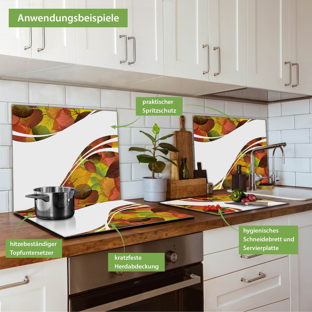 VIELSEITIG: Die Ceranfeldabdeckung ist vielseitig einsetzbar: ob als Spritzschutz hinter dem Herd für Ihre Küche oder als Glas Schneidebrett als hygienische und geruchsneutrale Unterlage. Sie können ebenfalls heiße Töpfe und Pfannen bis 100°C auf der Herdplattenabdeckung abstellen. Sie erhalten ein Multitalent für Ihre Küche. Die banjado Herdabdeckplatte aus Glas mit Motiv Herbstlaub verdeckt mit einem schönen Motiv Ihr Ceranfeld bzw. Ihren Induktionsherd. Die Herdabdeckplatte ist vielseitig einsetzbar und passt sich dabei Ihrem Einrichtungsstil an. DESIGN: Die Herdabdeckung Herbstlaub besteht aus hochwertigem, gehärtetem Glas mit einem unserer zahlreichen Motive. Sie haben die Wahl zwischen verschiedenen Maßen von einteiligen, zweiteiligen und einer dreiteiligen Herdabdeckung. Wählen Sie was zu Ihrer Einrichtung passt! DETAILS: Die Herdabdeckplatte ist vielseitig einsetzbar. Die Ecken sind für mehr Sicherheit dezent abgerundet, das Glas ist gehärtet. Sie erhalten separate Gummi Abstandshalter, damit Ihre Abdeckung rutschfest auf dem Herd steht. Diese können Sie frei positionieren, sodass die Herdabdeckung perfekt auf Ihrem Ceranfeld sitzt. BANJADO: Wir sind ein kleines Team aus dem Herzen von Sachsen und fertigen jeden Artikel nach Bestellung eigens für Sie an. Sie erhalten also keine preiswerte Importware, sondern Handarbeit. Auf Wunsch sind auch andere Farben und Größen möglich, kontakierten Sie uns gern.
