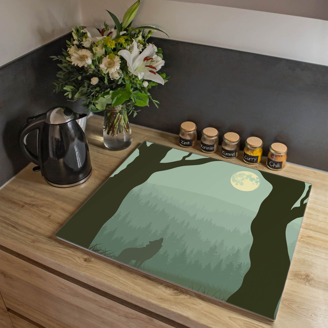 VIELSEITIG: Die Ceranfeldabdeckung ist vielseitig einsetzbar: ob als Spritzschutz hinter dem Herd für Ihre Küche oder als Glas Schneidebrett als hygienische und geruchsneutrale Unterlage. Sie können ebenfalls heiße Töpfe und Pfannen bis 100°C auf der Herdplattenabdeckung abstellen. Sie erhalten ein Multitalent für Ihre Küche. Die banjado Herdabdeckplatte aus Glas mit Motiv Heulender Wolf verdeckt mit einem schönen Motiv Ihr Ceranfeld bzw. Ihren Induktionsherd. Die Herdabdeckplatte ist vielseitig einsetzbar und passt sich dabei Ihrem Einrichtungsstil an. DESIGN: Die Herdabdeckung Heulender Wolf besteht aus hochwertigem, gehärtetem Glas mit einem unserer zahlreichen Motive. Sie haben die Wahl zwischen verschiedenen Maßen von einteiligen, zweiteiligen und einer dreiteiligen Herdabdeckung. Wählen Sie was zu Ihrer Einrichtung passt! DETAILS: Die Herdabdeckplatte ist vielseitig einsetzbar. Die Ecken sind für mehr Sicherheit dezent abgerundet, das Glas ist gehärtet. Sie erhalten separate Gummi Abstandshalter, damit Ihre Abdeckung rutschfest auf dem Herd steht. Diese können Sie frei positionieren, sodass die Herdabdeckung perfekt auf Ihrem Ceranfeld sitzt. BANJADO: Wir sind ein kleines Team aus dem Herzen von Sachsen und fertigen jeden Artikel nach Bestellung eigens für Sie an. Sie erhalten also keine preiswerte Importware, sondern Handarbeit. Auf Wunsch sind auch andere Farben und Größen möglich, kontakierten Sie uns gern.