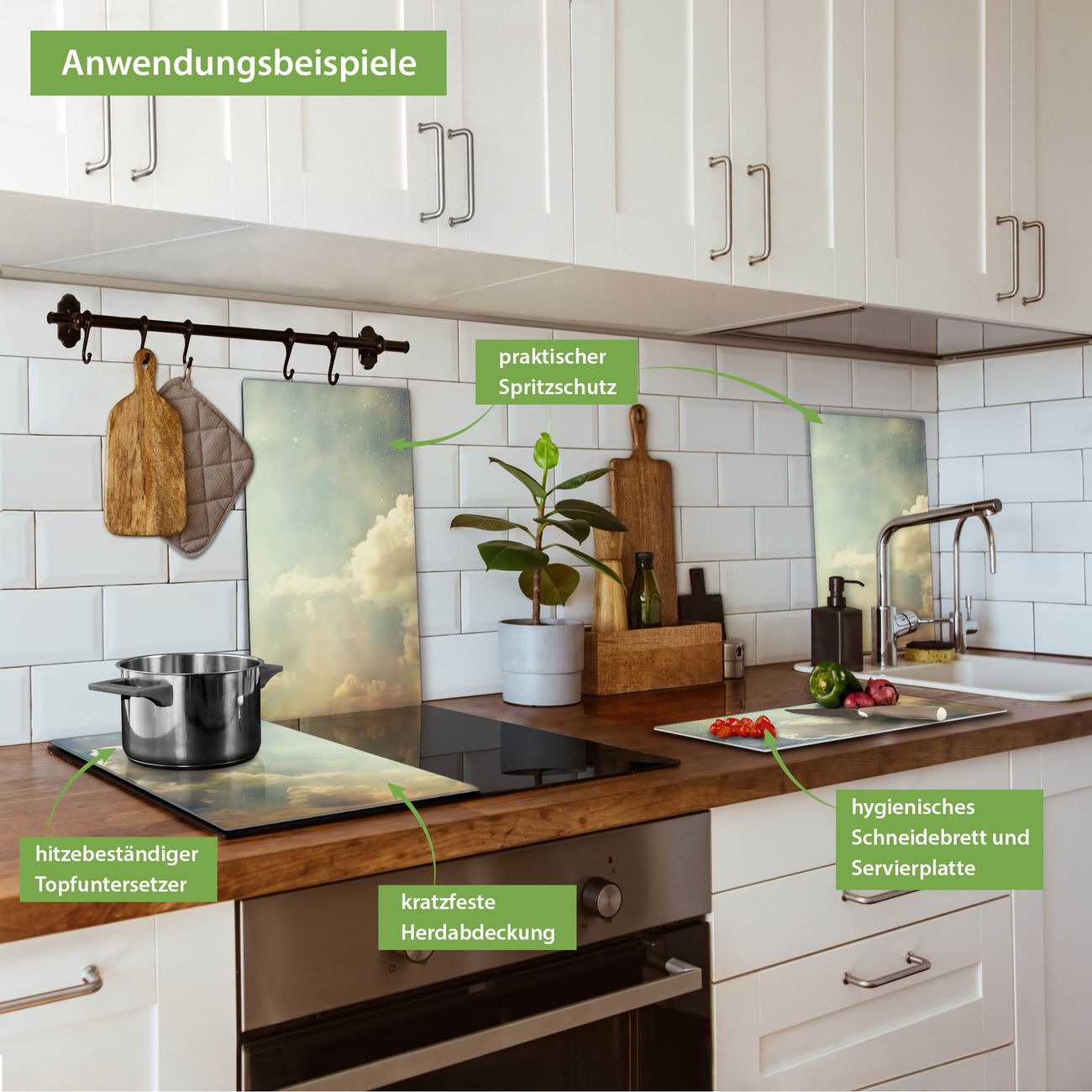 VIELSEITIG: Die Ceranfeldabdeckung ist vielseitig einsetzbar: ob als Spritzschutz hinter dem Herd für Ihre Küche oder als Glas Schneidebrett als hygienische und geruchsneutrale Unterlage. Sie können ebenfalls heiße Töpfe und Pfannen bis 100°C auf der Herdplattenabdeckung abstellen. Sie erhalten ein Multitalent für Ihre Küche. Die banjado Herdabdeckplatte aus Glas mit Motiv Himmel Vintage verdeckt mit einem schönen Motiv Ihr Ceranfeld bzw. Ihren Induktionsherd. Die Herdabdeckplatte ist vielseitig einsetzbar und passt sich dabei Ihrem Einrichtungsstil an. DESIGN: Die Herdabdeckung Himmel Vintage besteht aus hochwertigem, gehärtetem Glas mit einem unserer zahlreichen Motive. Sie haben die Wahl zwischen verschiedenen Maßen von einteiligen, zweiteiligen und einer dreiteiligen Herdabdeckung. Wählen Sie was zu Ihrer Einrichtung passt! DETAILS: Die Herdabdeckplatte ist vielseitig einsetzbar. Die Ecken sind für mehr Sicherheit dezent abgerundet, das Glas ist gehärtet. Sie erhalten separate Gummi Abstandshalter, damit Ihre Abdeckung rutschfest auf dem Herd steht. Diese können Sie frei positionieren, sodass die Herdabdeckung perfekt auf Ihrem Ceranfeld sitzt. BANJADO: Wir sind ein kleines Team aus dem Herzen von Sachsen und fertigen jeden Artikel nach Bestellung eigens für Sie an. Sie erhalten also keine preiswerte Importware, sondern Handarbeit. Auf Wunsch sind auch andere Farben und Größen möglich, kontakierten Sie uns gern.